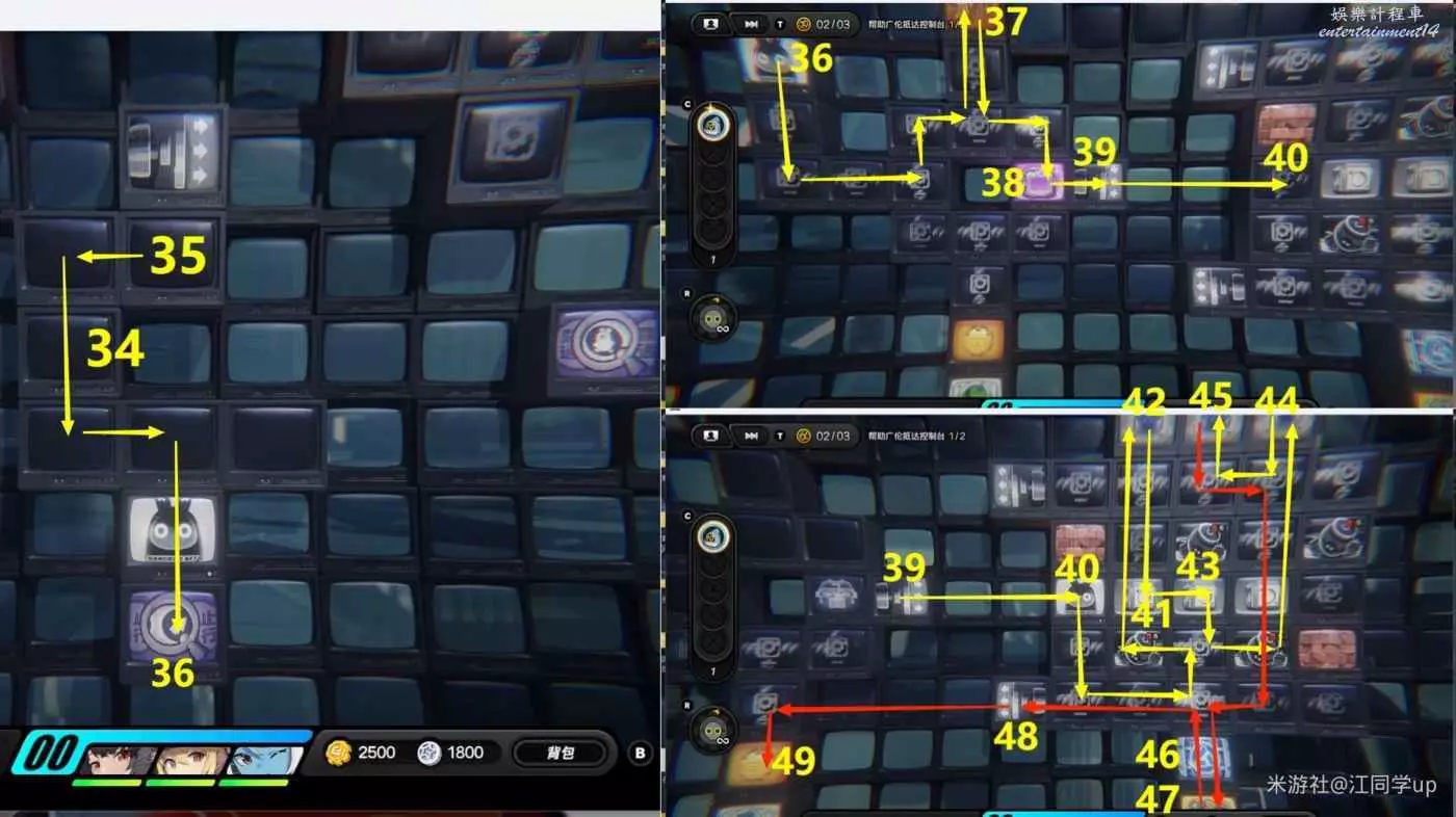 (5)接著去下面36區域,接著去右邊37和38區域,然後從39彈到40區域,接著按照黃色線路即可將41區域方塊推到上面42區域,將43區域方塊推到上面44區域,然後我們再進入45區域後,即可打開下面46區域的門,接著拿了47區域寶箱後,從48區域去49區域