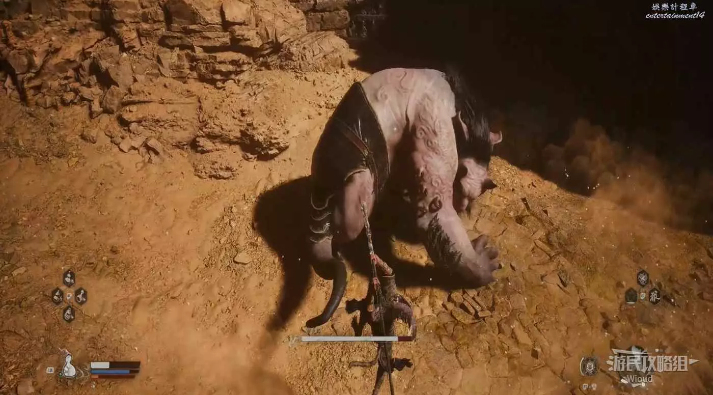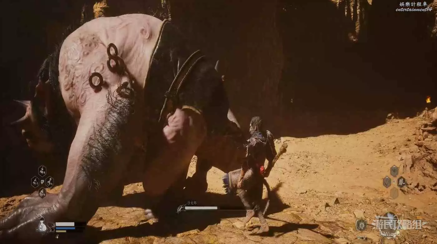 沙大朗的體型要比沙二郎大很多,因為沒有武器所以攻擊方式基本靠前爪與啃咬,還能通過翻滾背擊玩家,通過捕捉沙大郎的技能後搖來積攢棍勢,面對這種大體型BOSS還是普通的重棍好用。