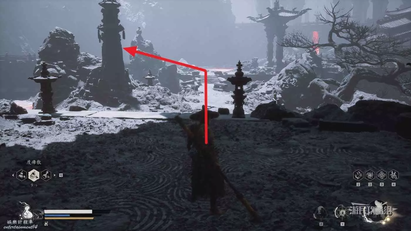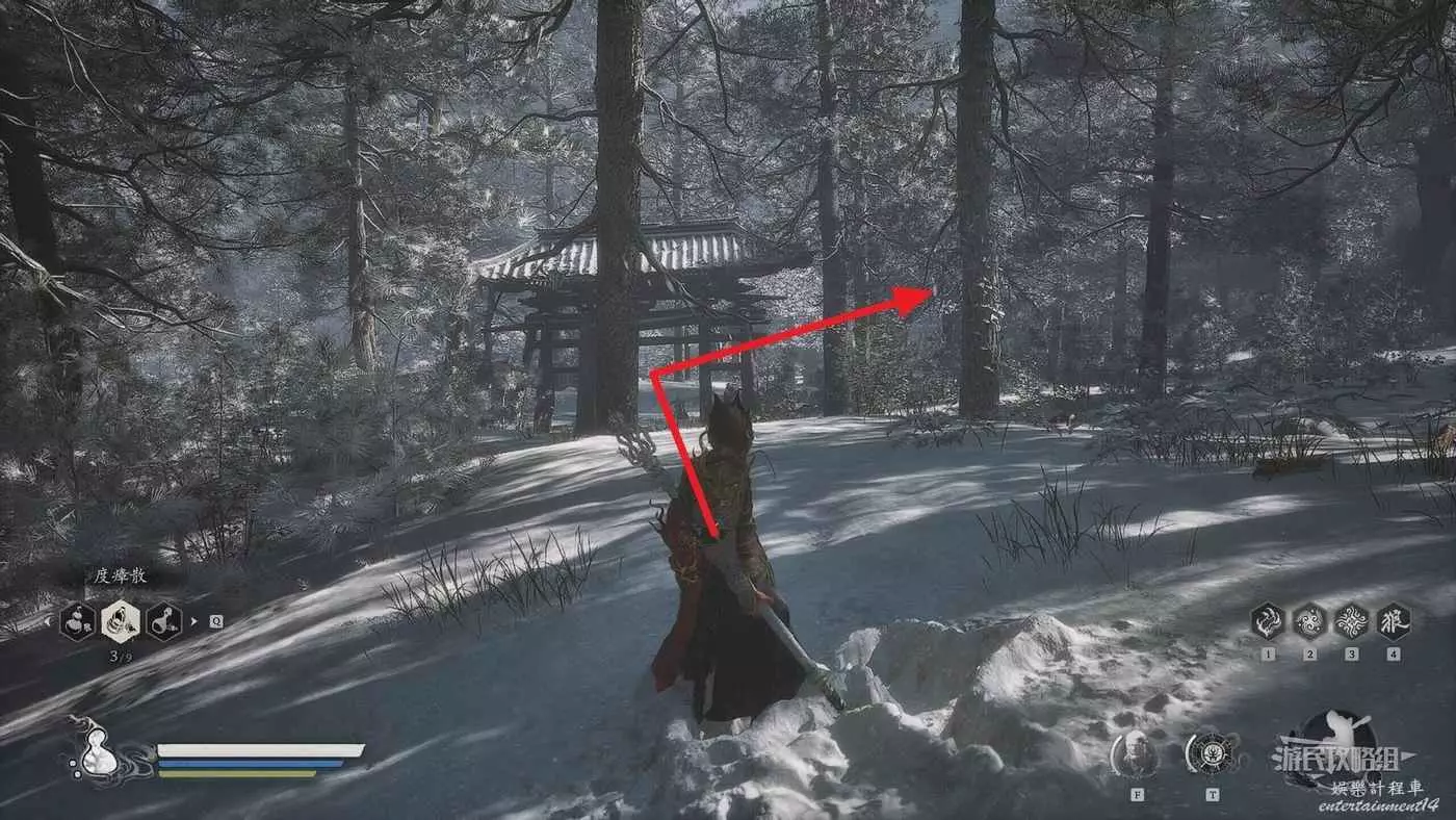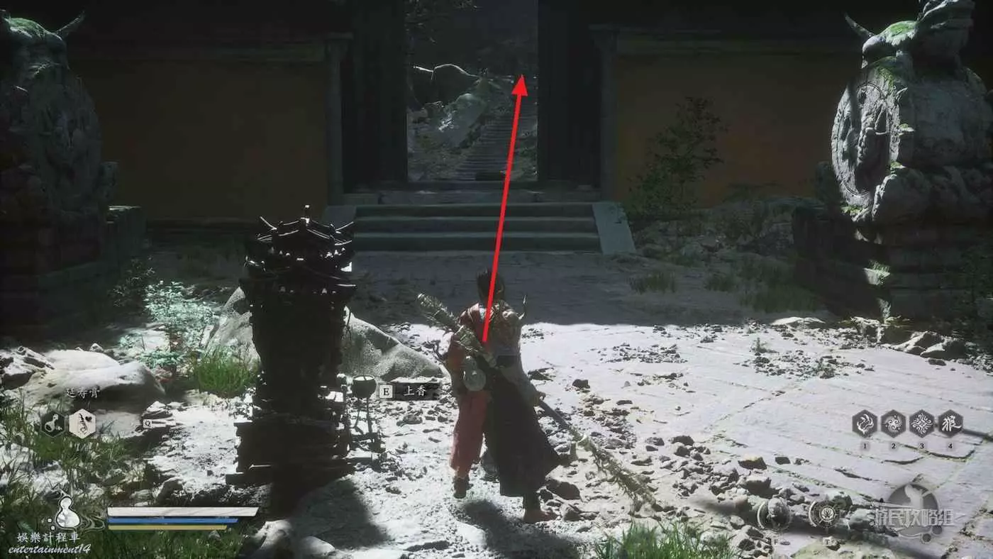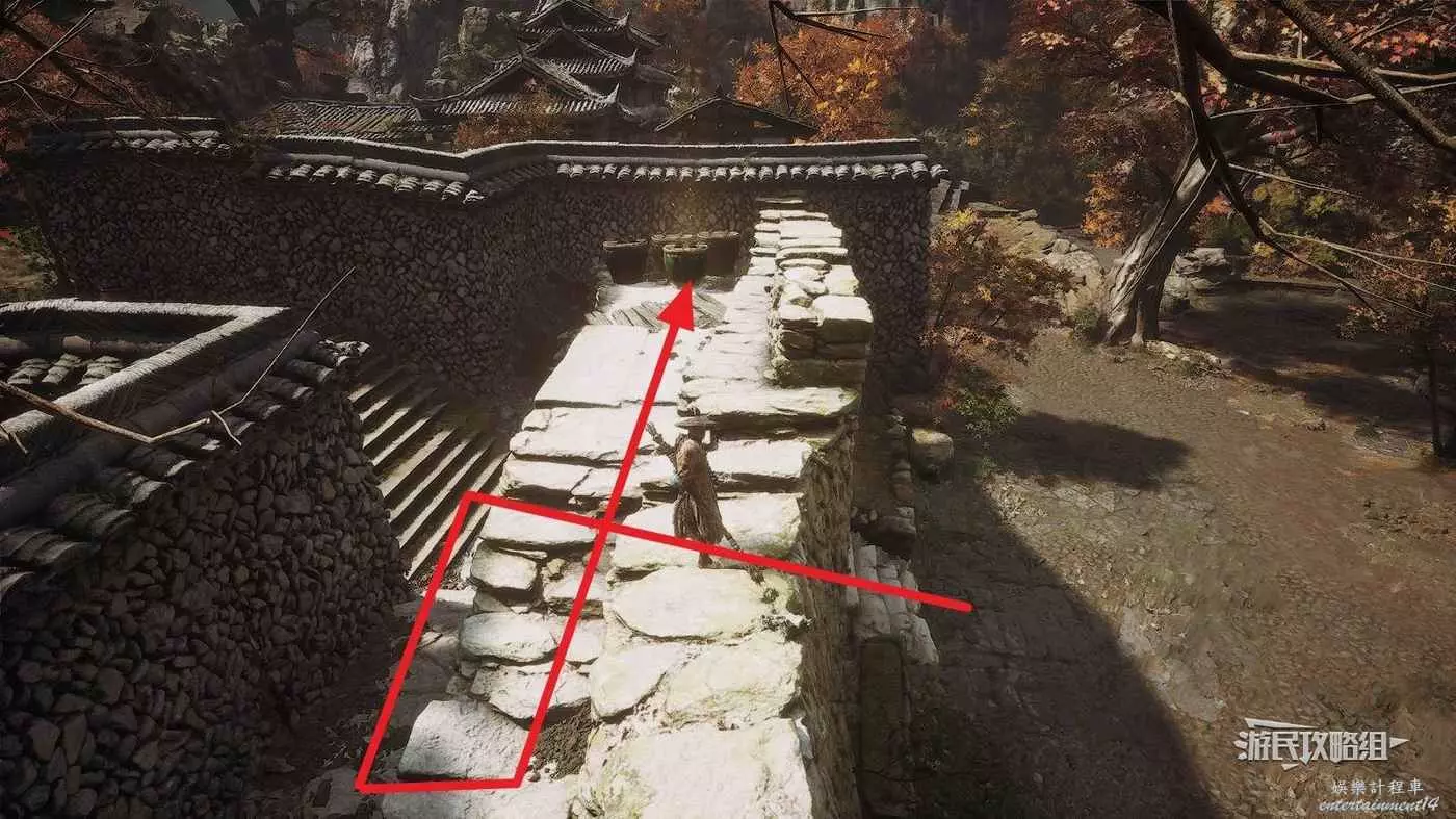 進入拱門之後,參考下圖往樓梯左邊看可以看到一個特別窄的小樓梯,從這裡往上走來到拱門上方,擊碎上方的綠色罐子即可獲得三冬蟲。