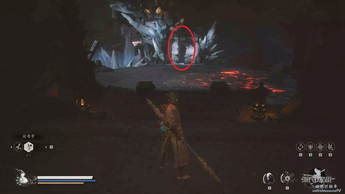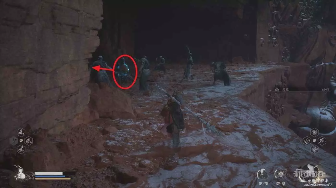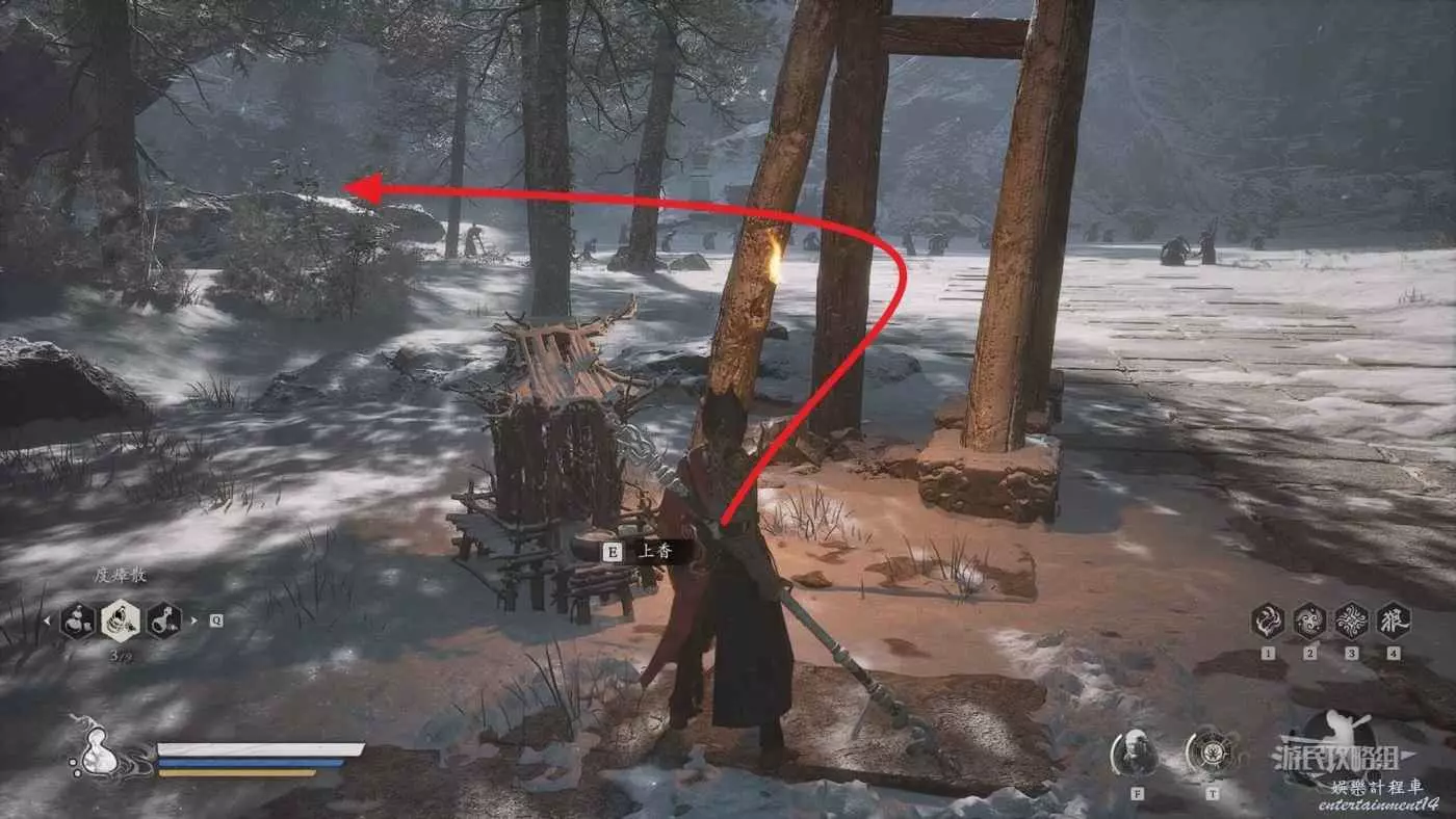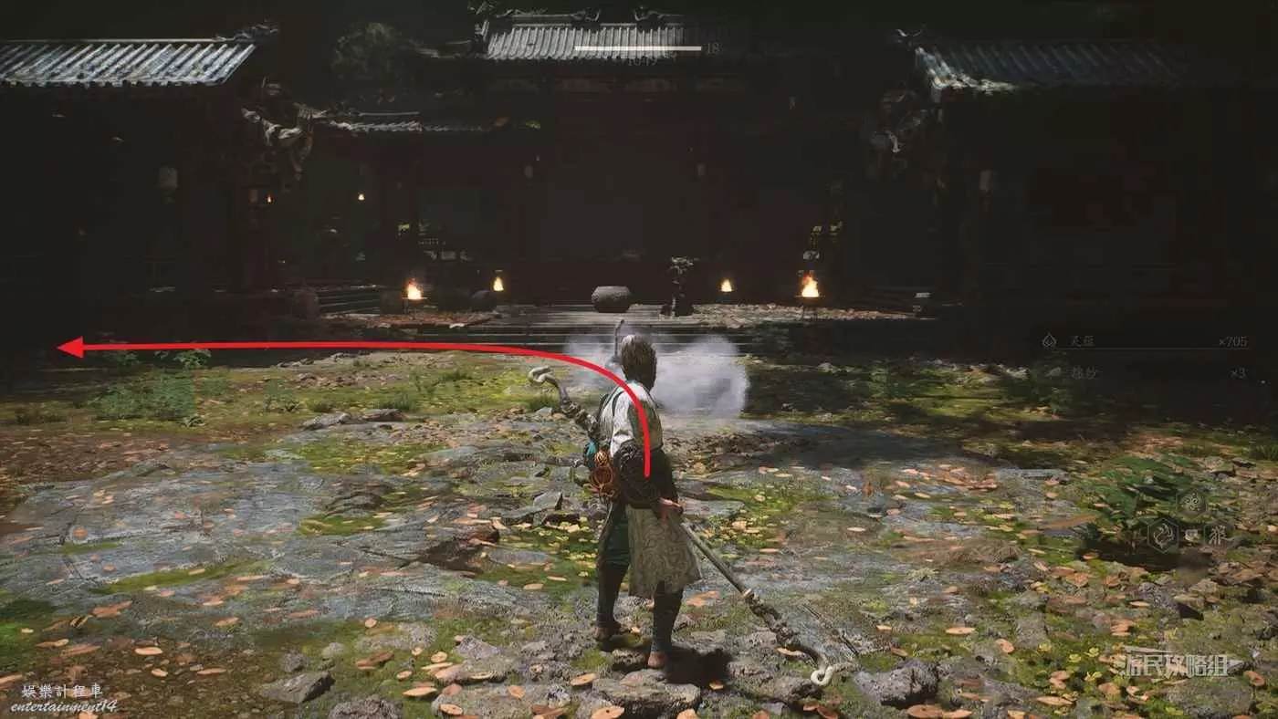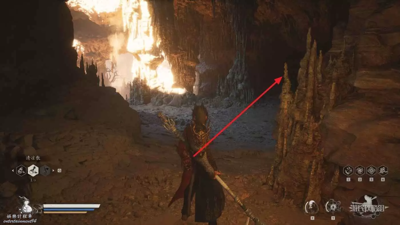 進入拱門之後,參考下圖往樓梯左邊看可以看到一個特別窄的小樓梯,從這裡往上走來到拱門上方,擊碎上方的綠色罐子即可獲得三冬蟲。
