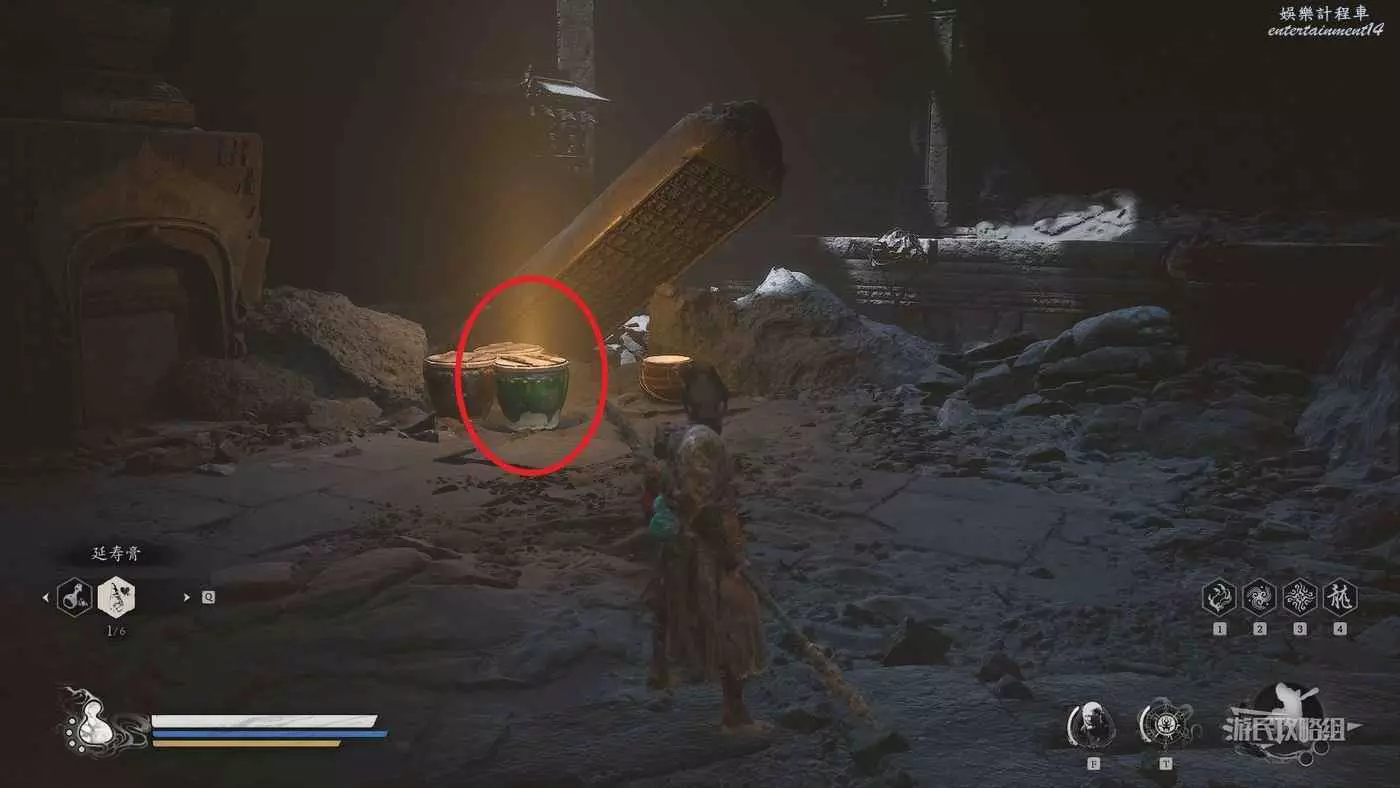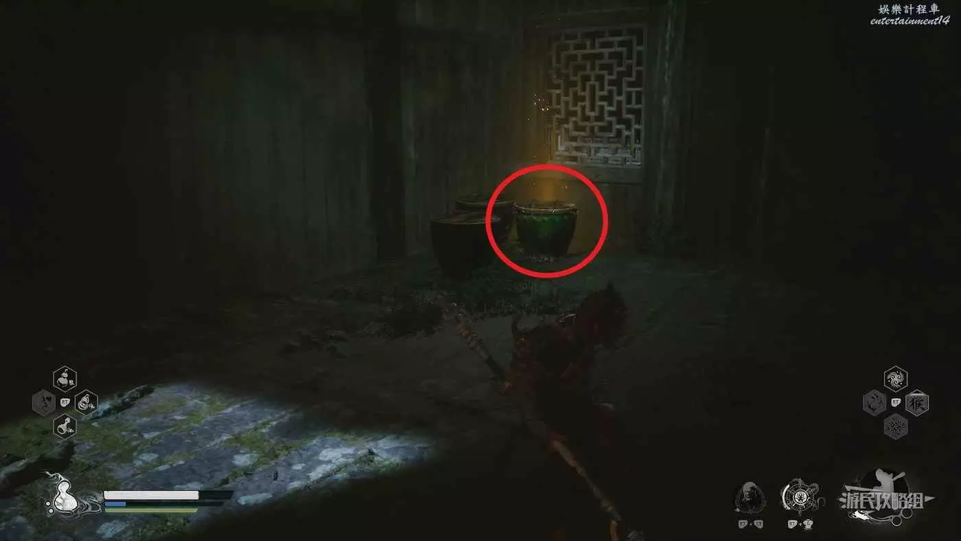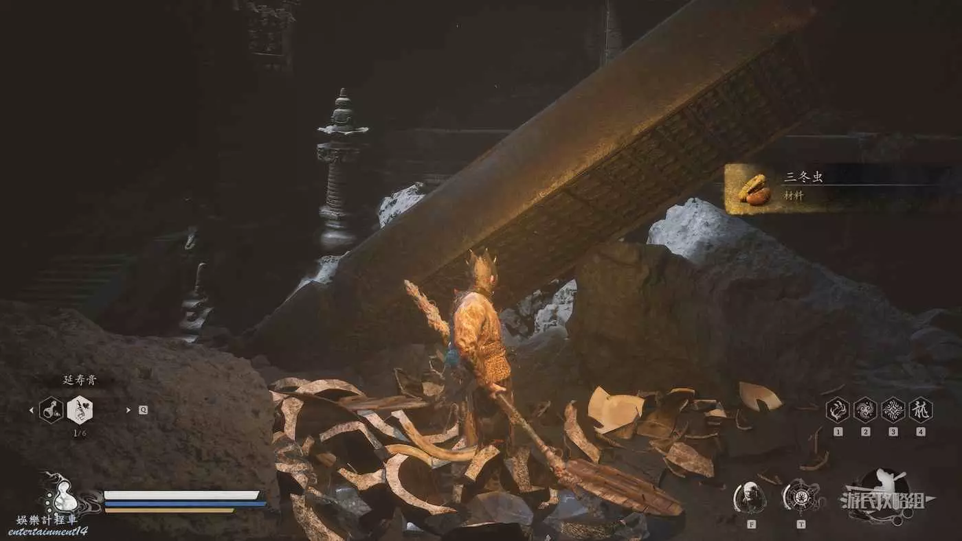 在戒刀僧旁邊靠牆位置附近,可以看到發光的水缸,擊碎獲得三冬蟲。