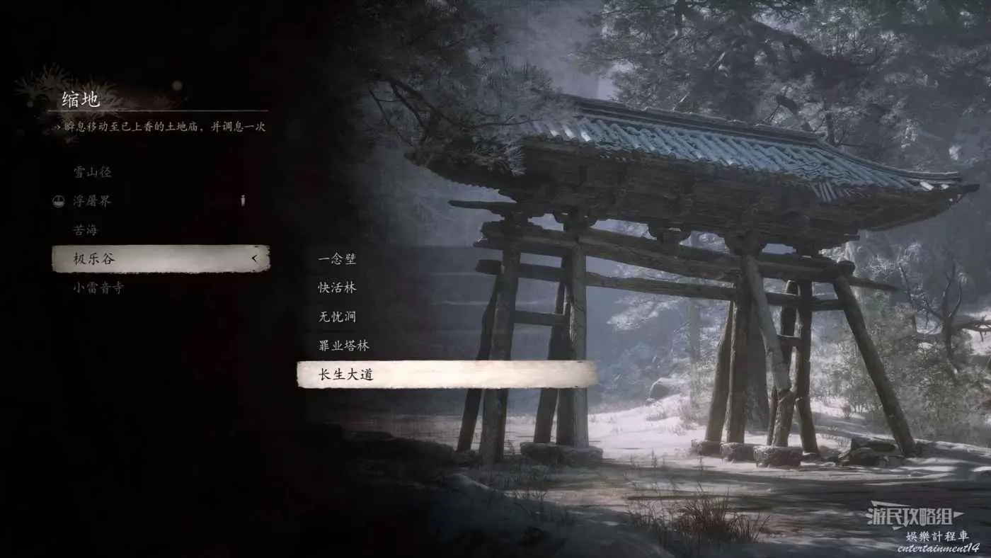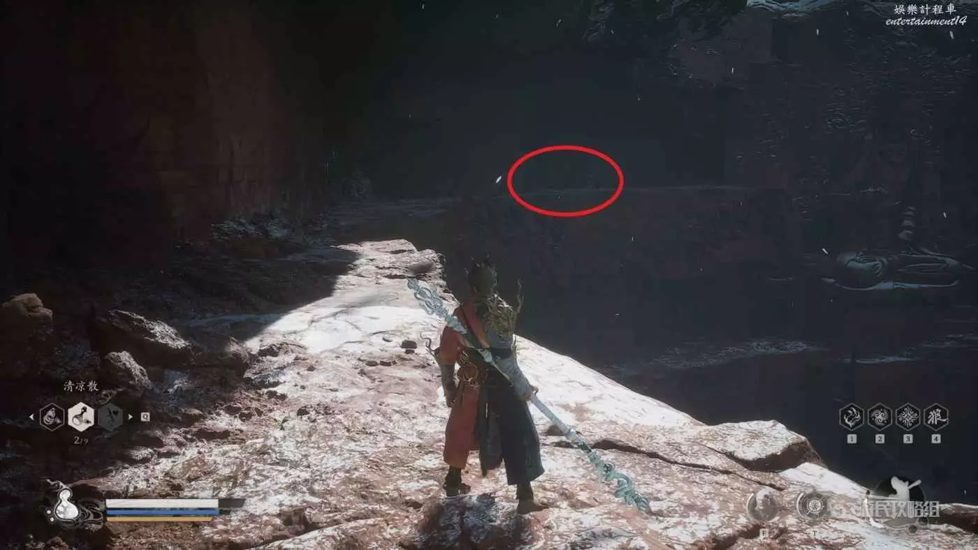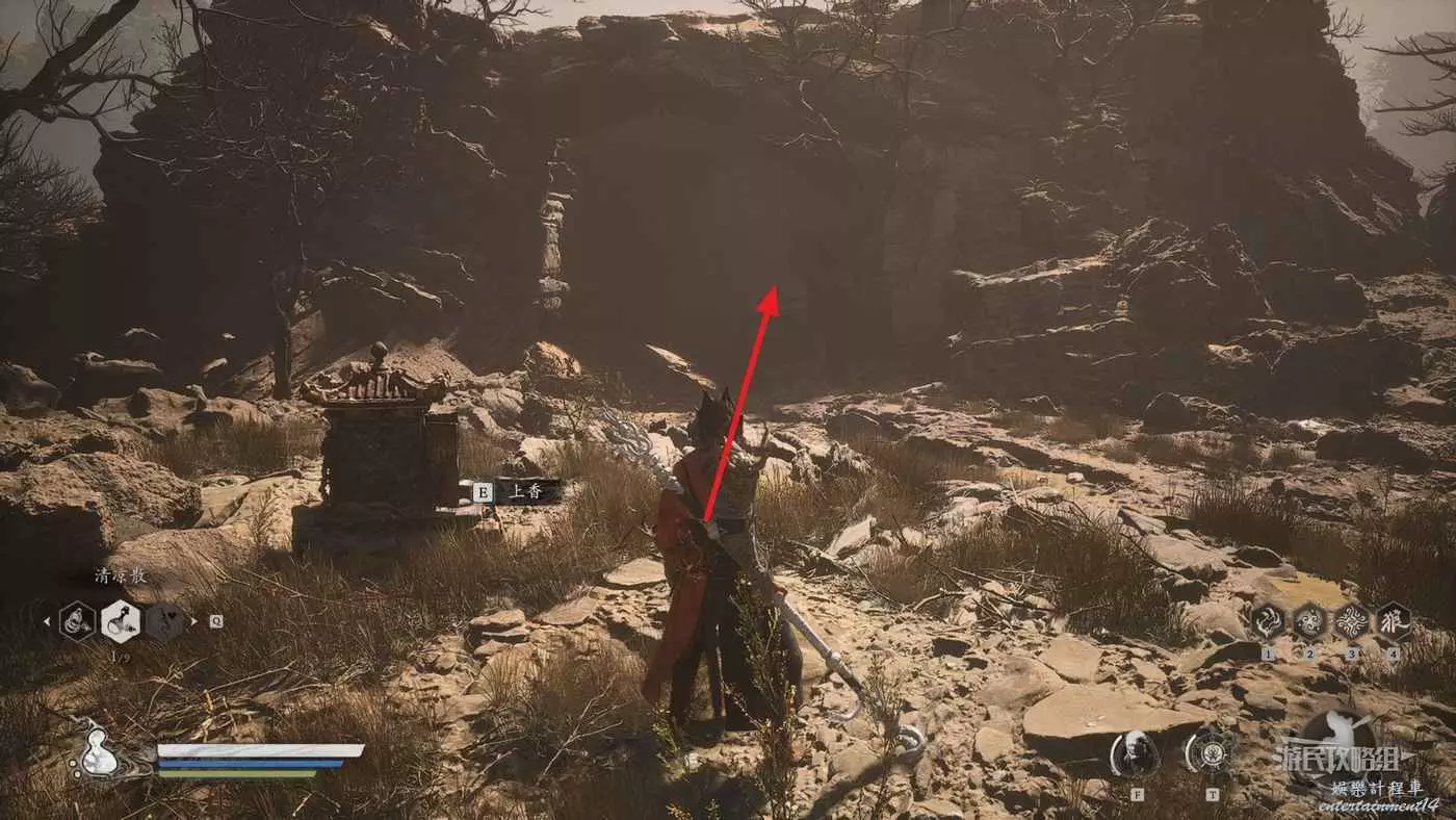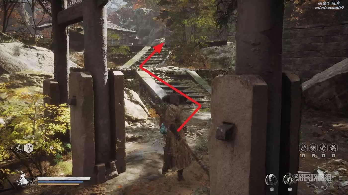 從第三回【小西天-浮屠界-經筒外】土地廟往BOSS【魔將·妙音】所在位置的橋走,到懸崖邊右轉可以看到前方岩壁上凸出了一些大石頭,這些石頭是可以踩著往下跳的。沿著石頭往下跳,按照下圖箭頭方向前進。