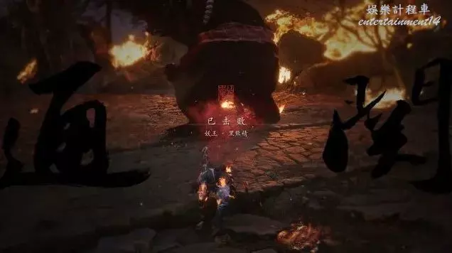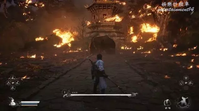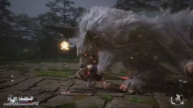 可能是黑猴第一個比較有挑戰性的BOSS,熊瞎子的難點是:場地大範圍的火帶來燃燒不利狀態、隱身後連續豬車,第一點就是隱藏法寶庇火罩的技能可以完破,第二點可以靠變身拖時長(開庇火罩也能大幅減傷)。