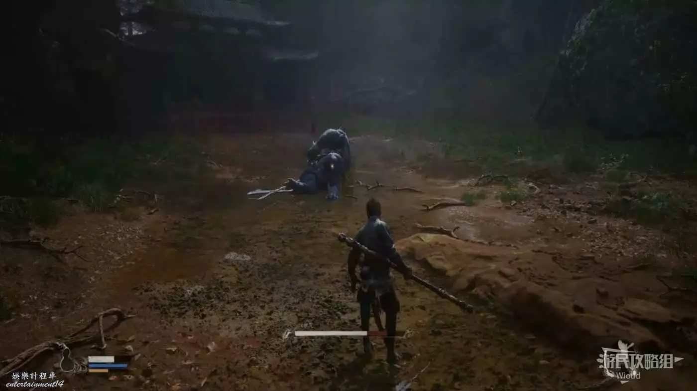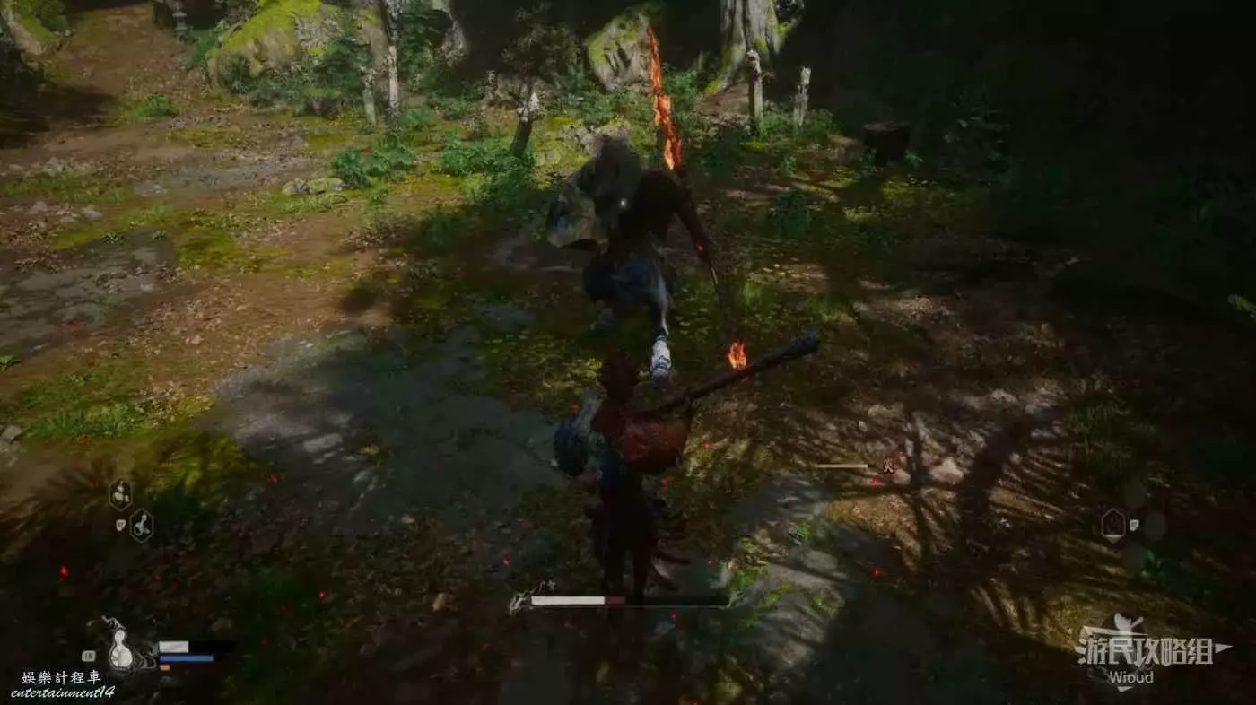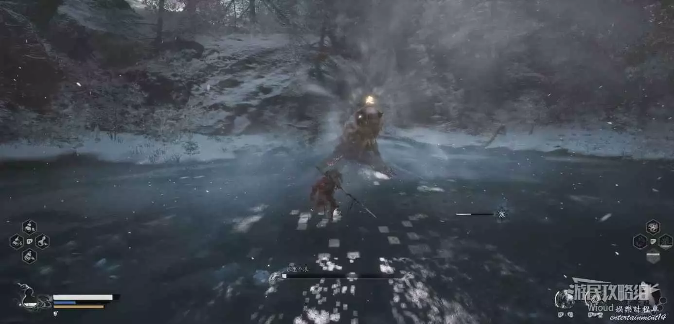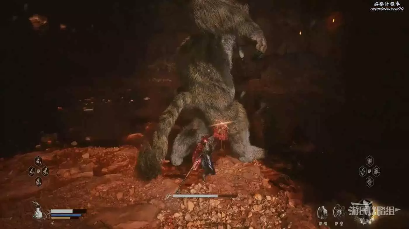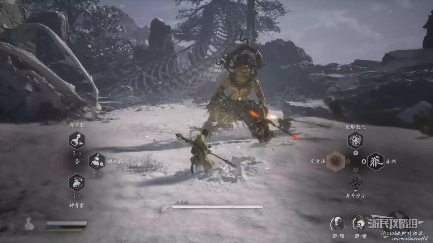 地狼的攻擊慾望不高,攻擊模組也只是基礎的狼型BOSS的爪擊、嘴咬等,開始戰鬥直接使用定身術,然後走到地狼旁邊打一套,定身效果結束開始躲避地狼的攻擊並繼續穿插普攻直到積攢好三層棍勢。