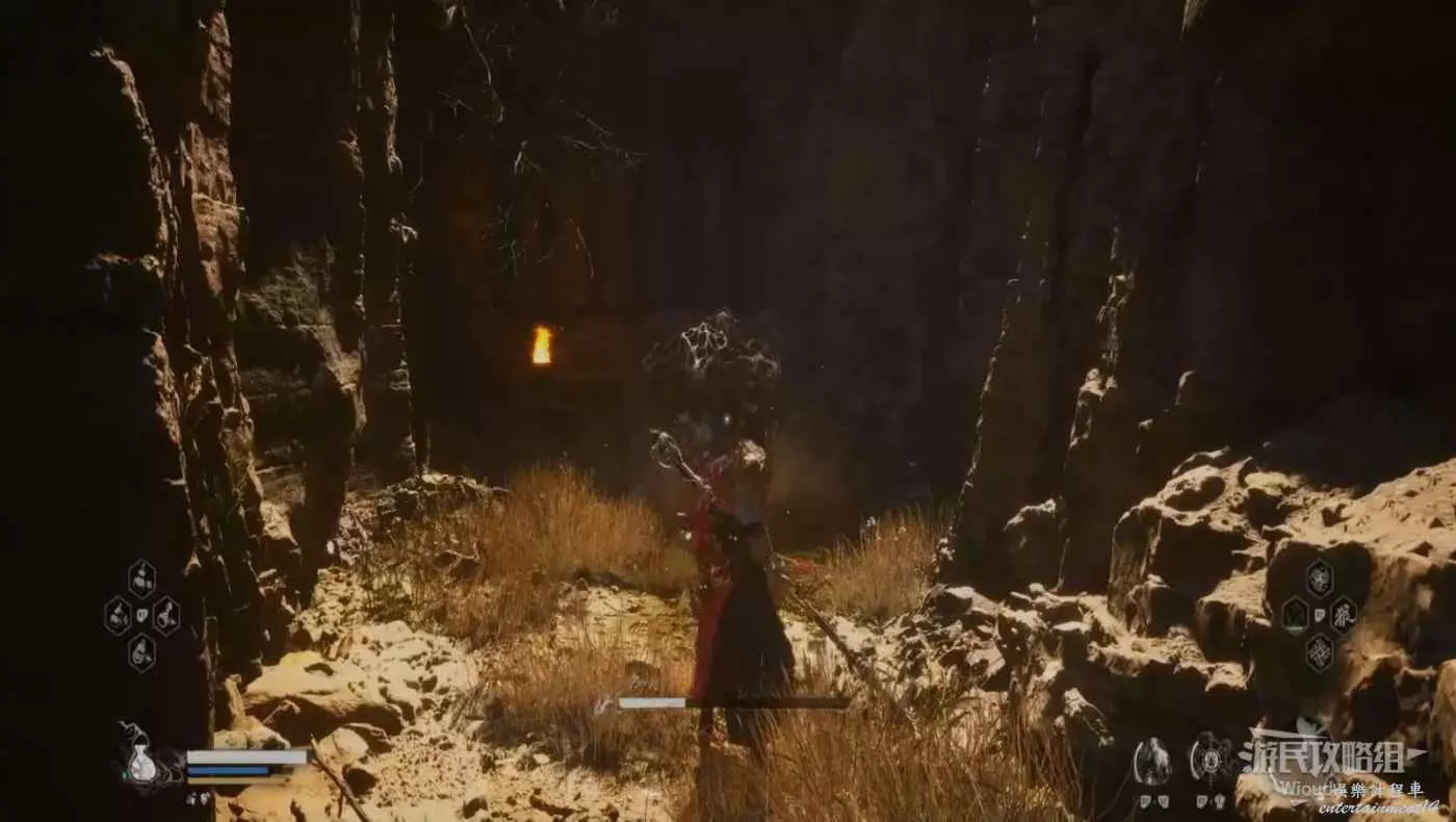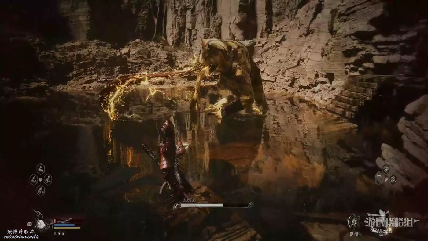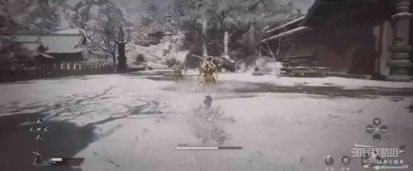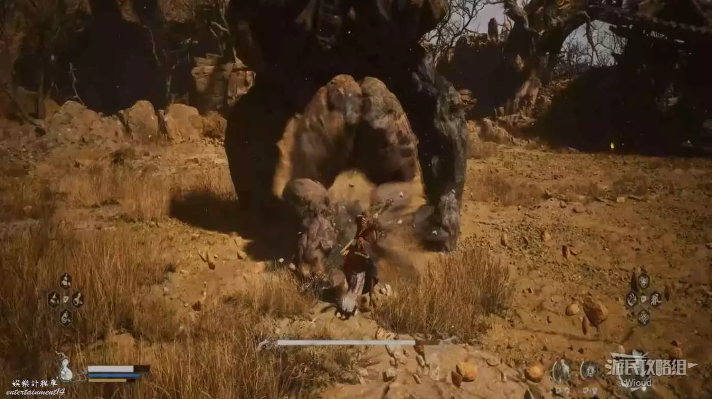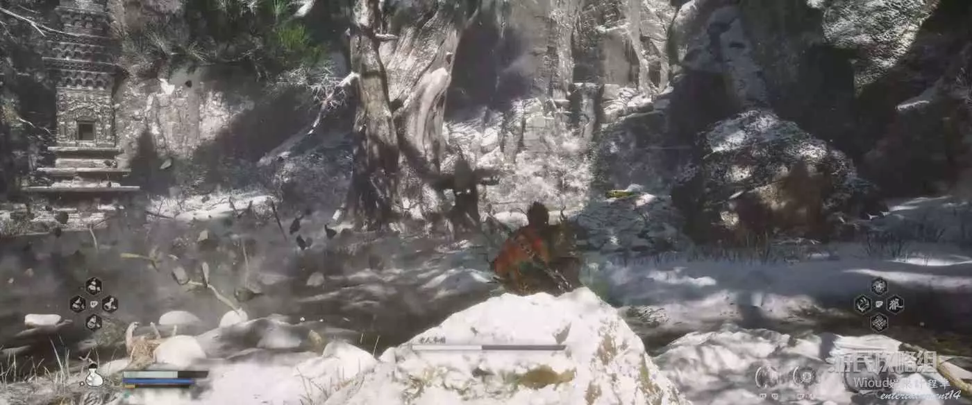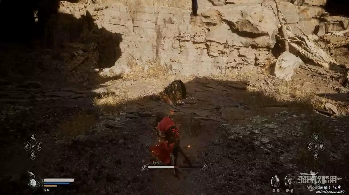 地狼的攻擊慾望不高,攻擊模組也只是基礎的狼型BOSS的爪擊、嘴咬等,開始戰鬥直接使用定身術,然後走到地狼旁邊打一套,定身效果結束開始躲避地狼的攻擊並繼續穿插普攻直到積攢好三層棍勢。