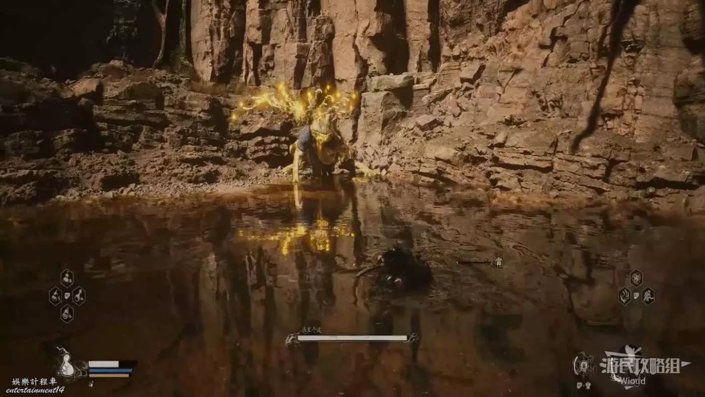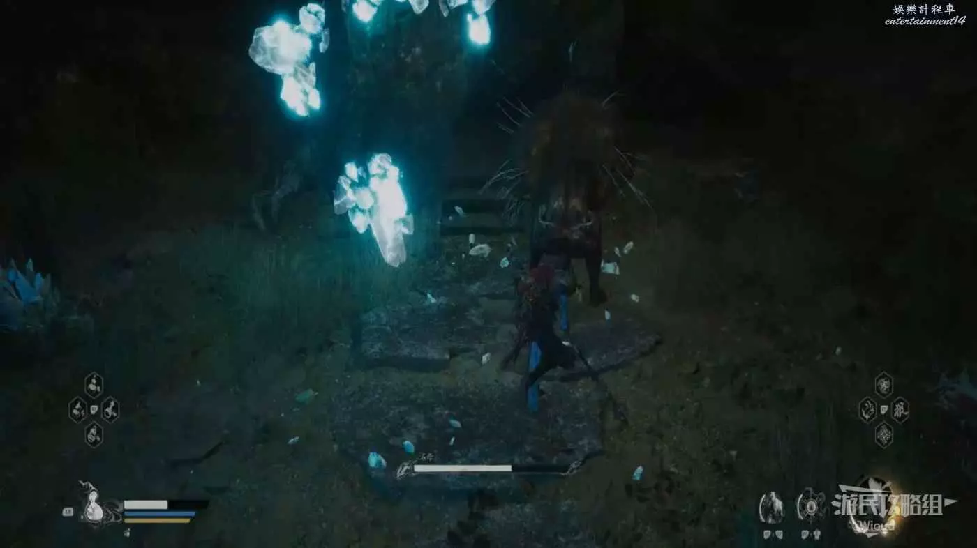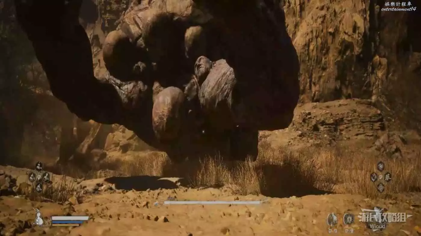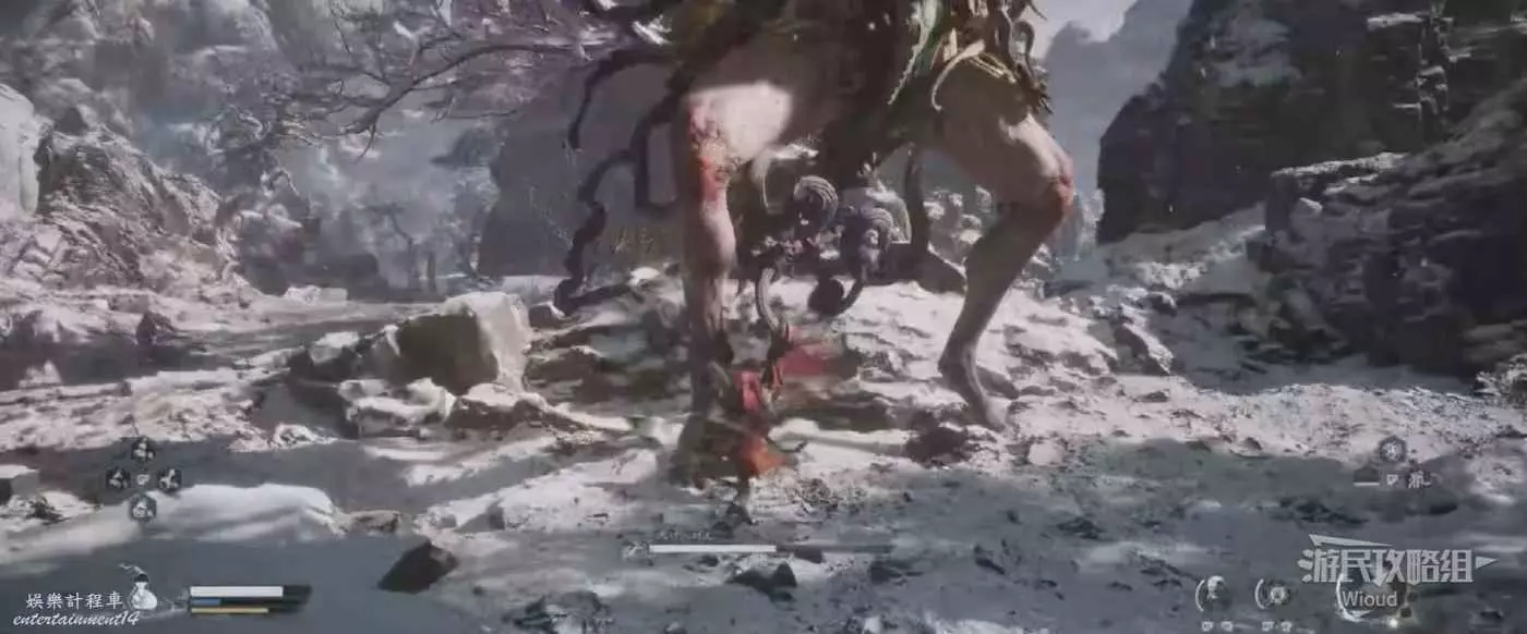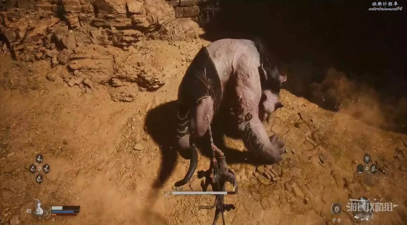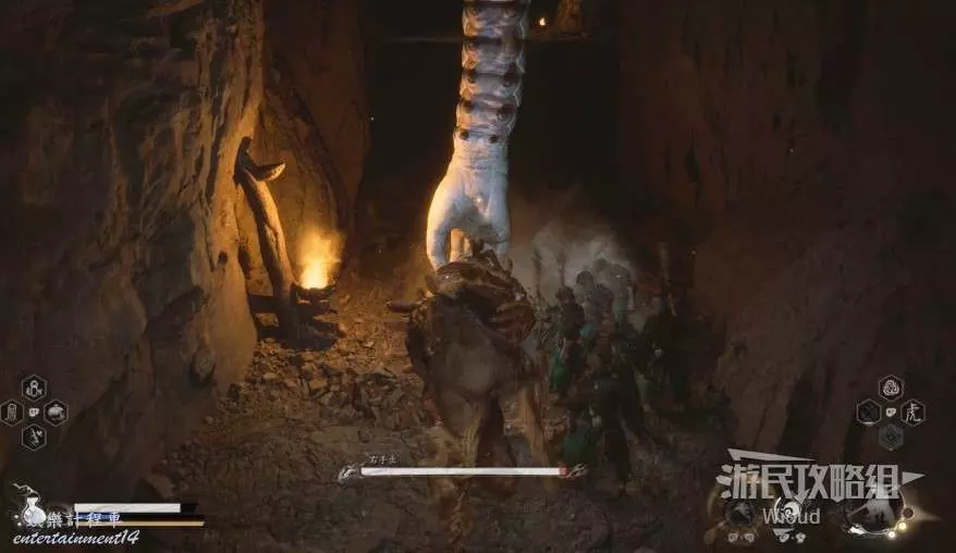 地狼的攻擊慾望不高,攻擊模組也只是基礎的狼型BOSS的爪擊、嘴咬等,開始戰鬥直接使用定身術,然後走到地狼旁邊打一套,定身效果結束開始躲避地狼的攻擊並繼續穿插普攻直到積攢好三層棍勢。