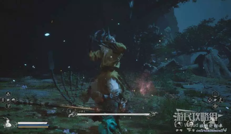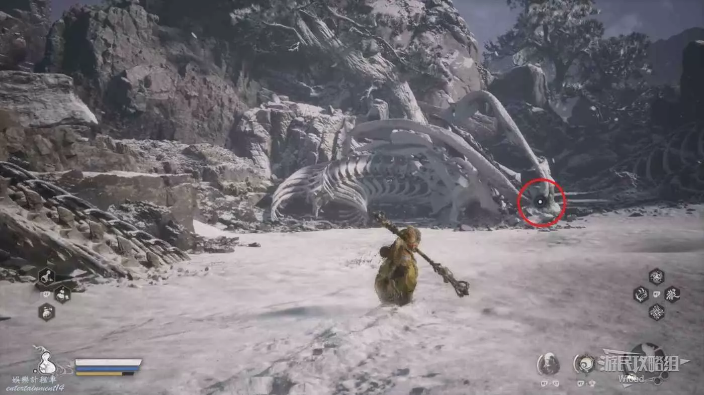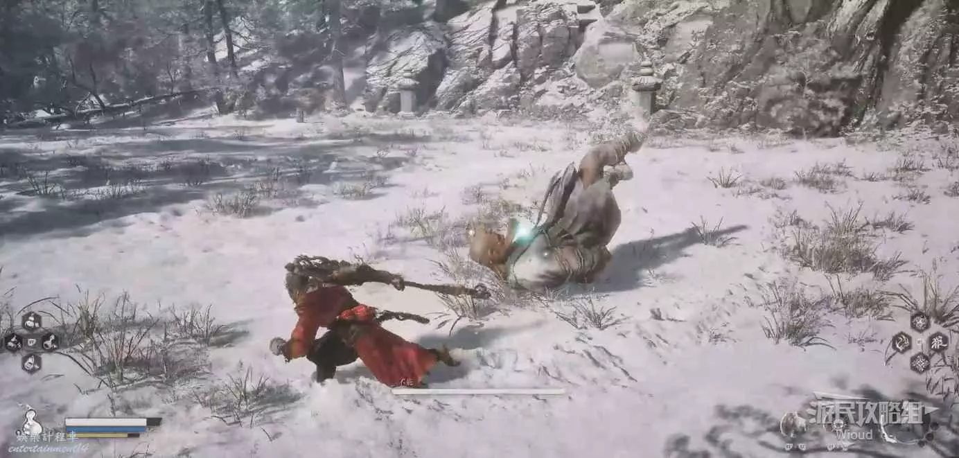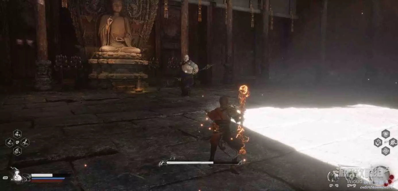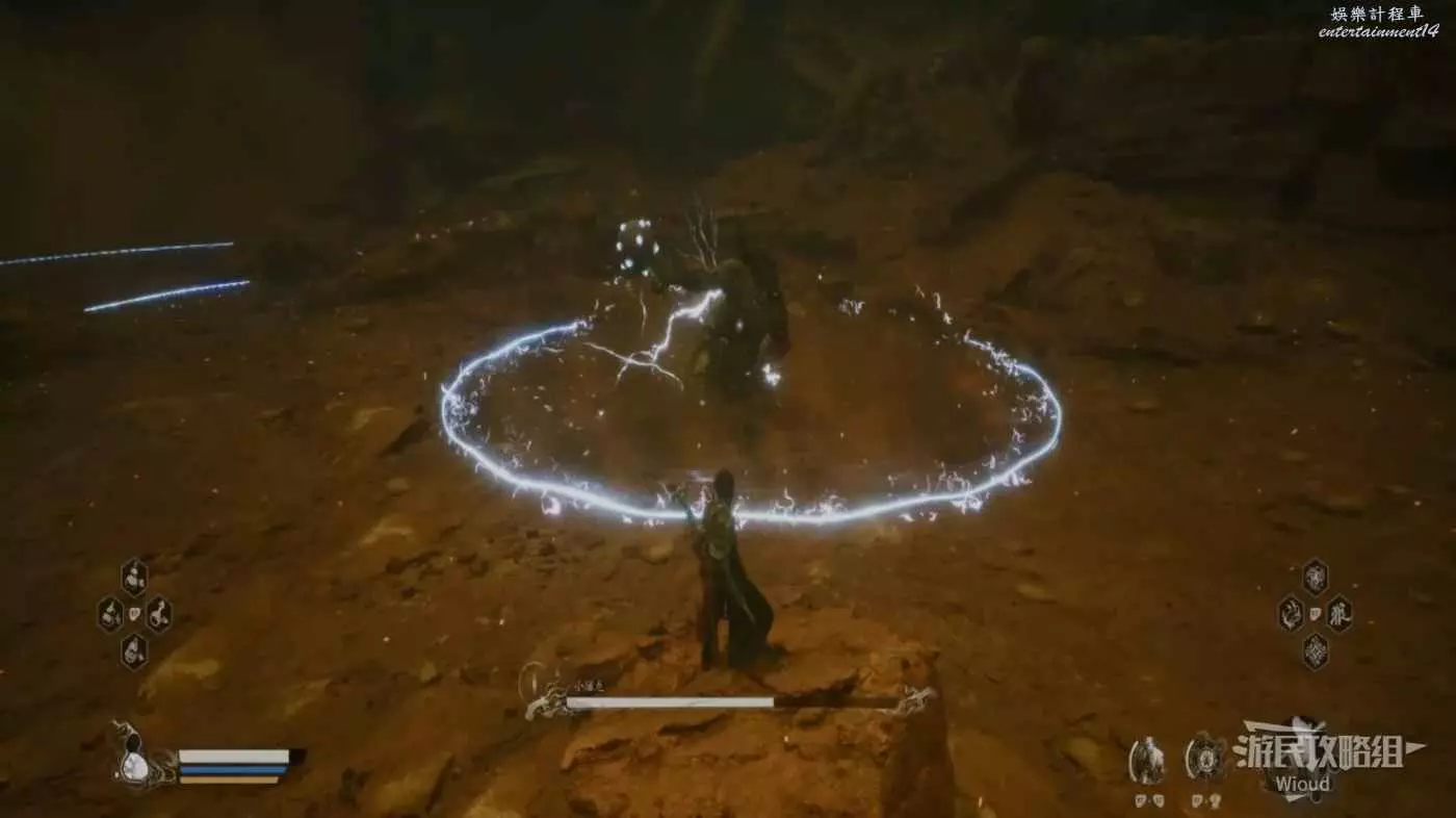 地狼的攻擊慾望不高,攻擊模組也只是基礎的狼型BOSS的爪擊、嘴咬等,開始戰鬥直接使用定身術,然後走到地狼旁邊打一套,定身效果結束開始躲避地狼的攻擊並繼續穿插普攻直到積攢好三層棍勢。