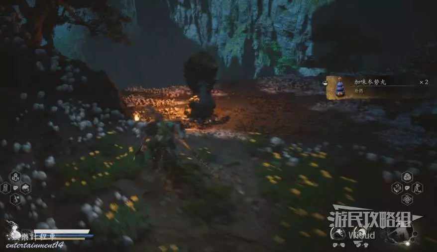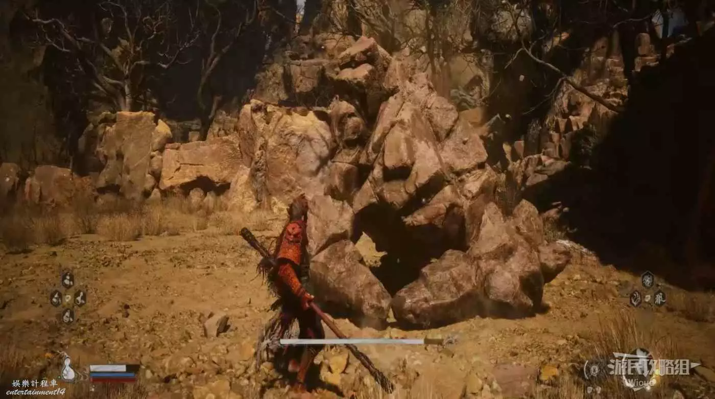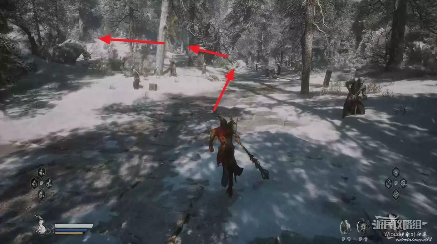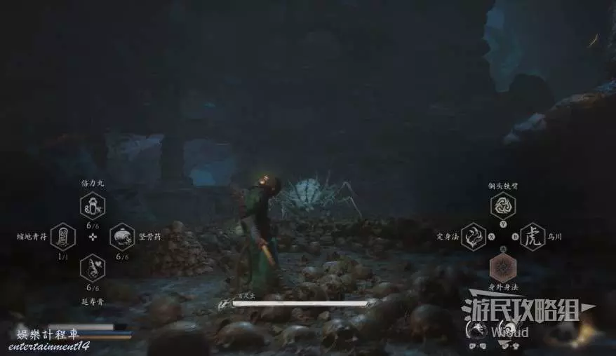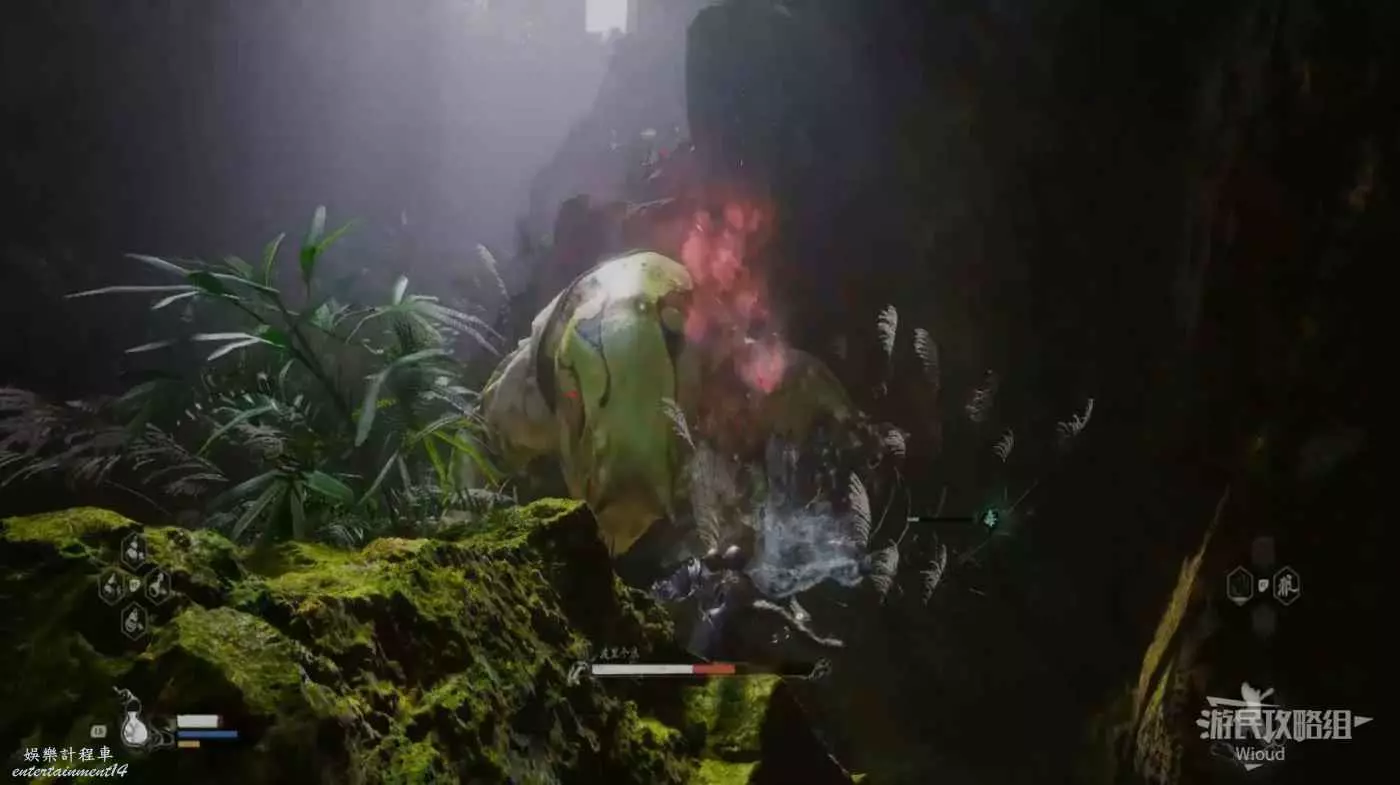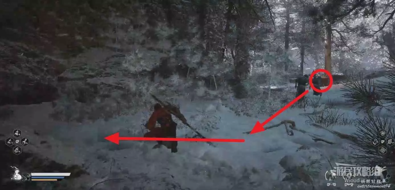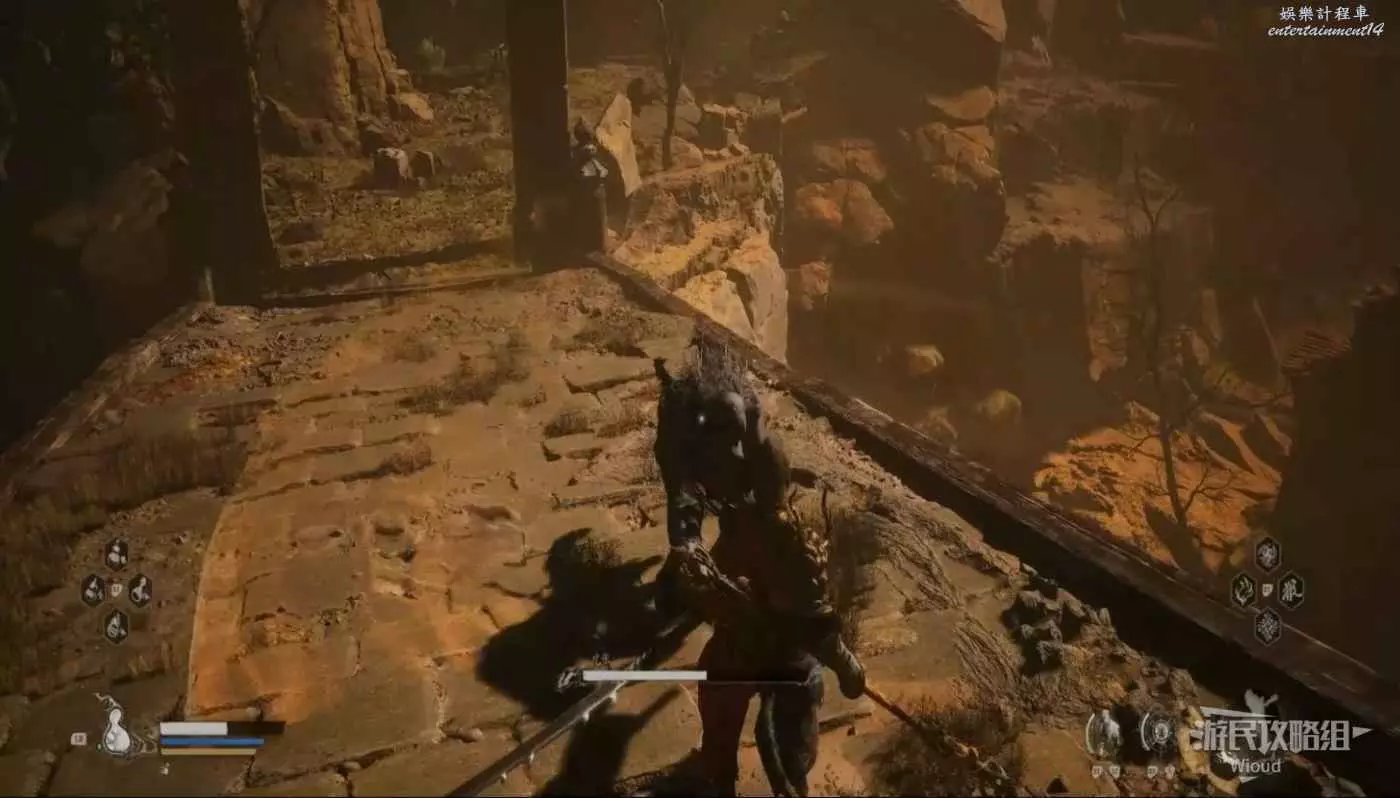 地狼的攻擊慾望不高,攻擊模組也只是基礎的狼型BOSS的爪擊、嘴咬等,開始戰鬥直接使用定身術,然後走到地狼旁邊打一套,定身效果結束開始躲避地狼的攻擊並繼續穿插普攻直到積攢好三層棍勢。