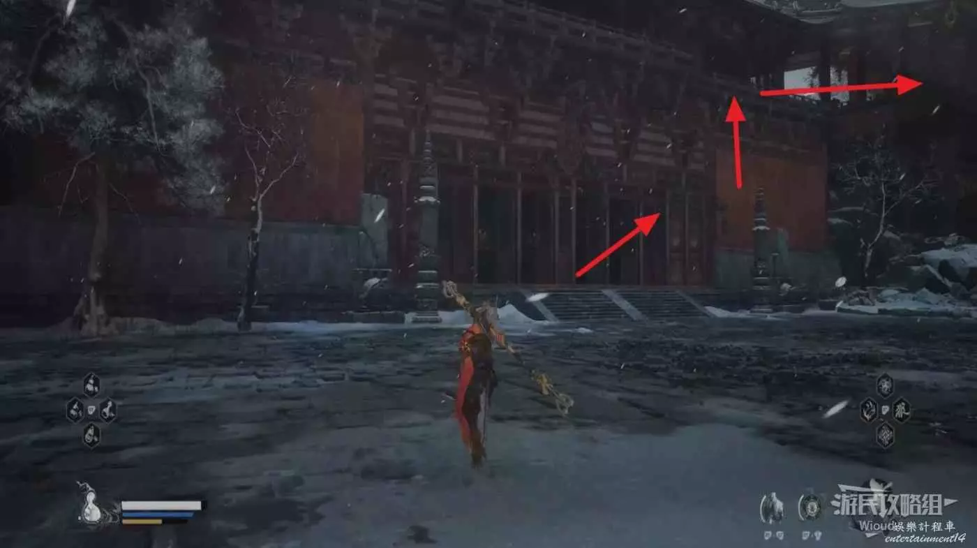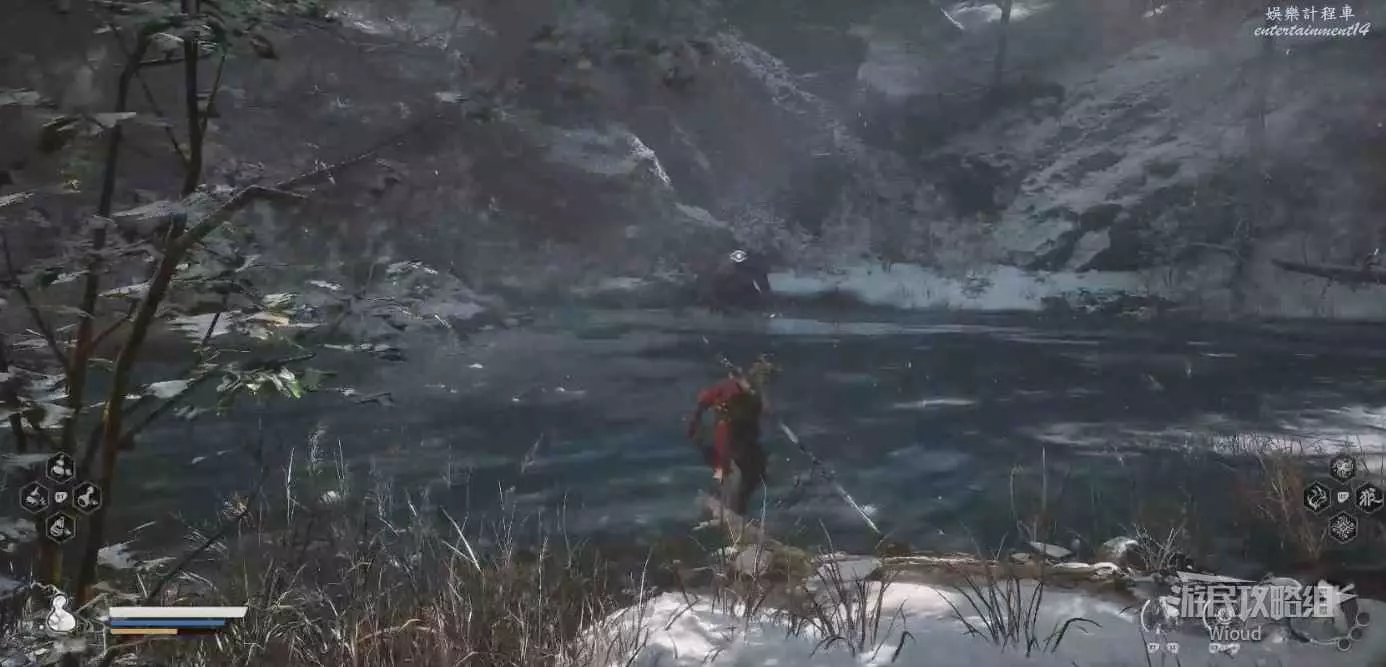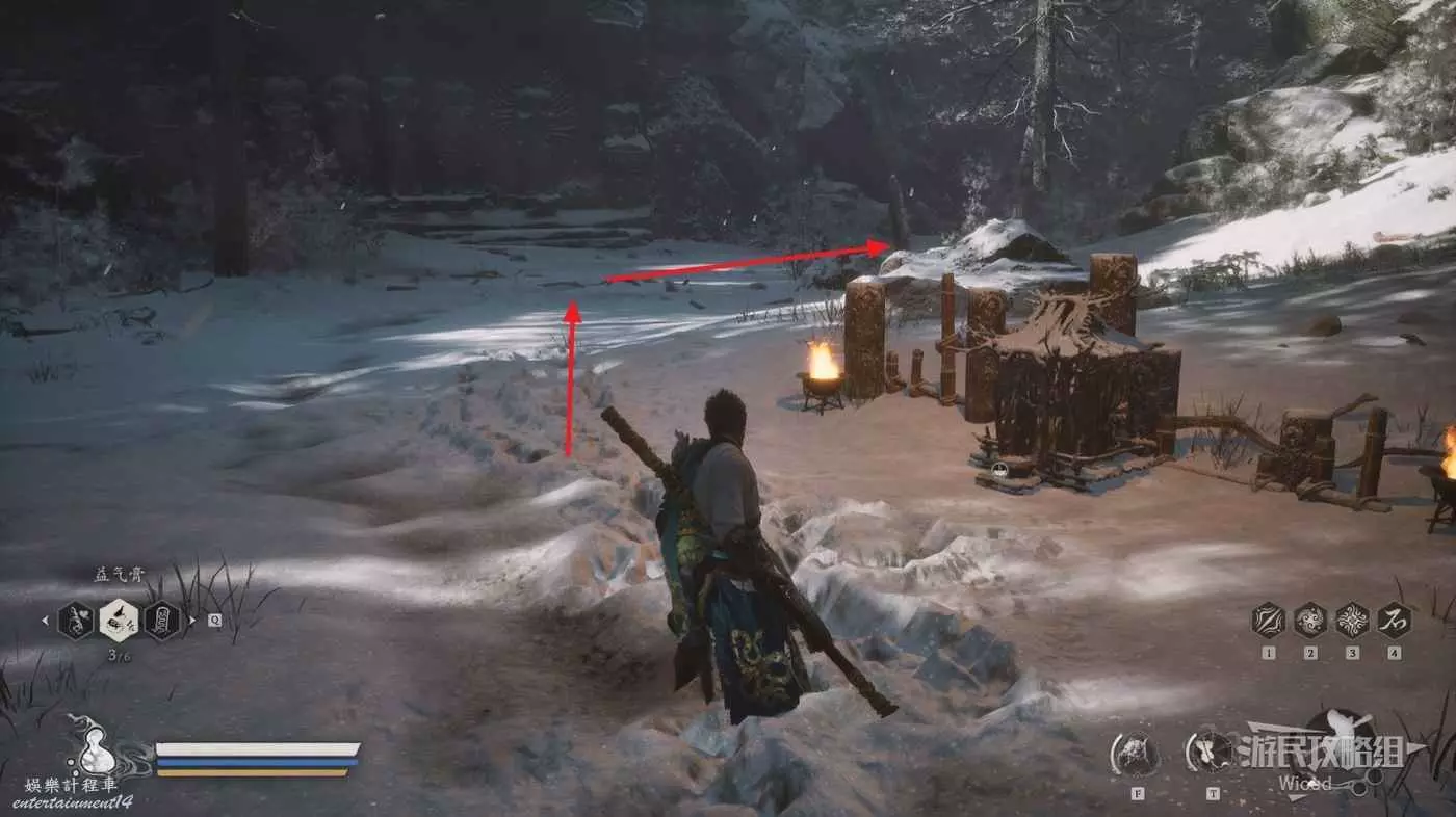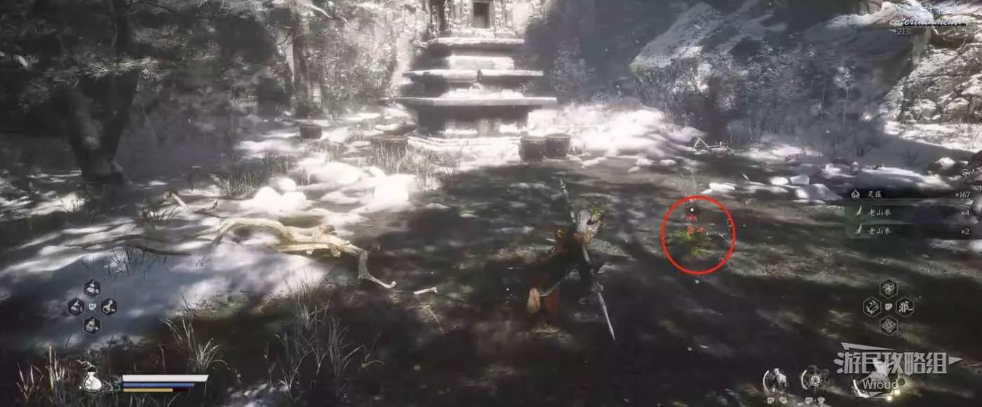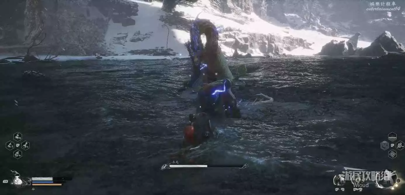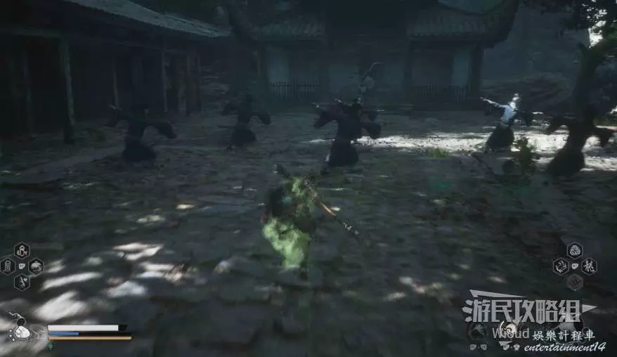 地狼的攻擊慾望不高,攻擊模組也只是基礎的狼型BOSS的爪擊、嘴咬等,開始戰鬥直接使用定身術,然後走到地狼旁邊打一套,定身效果結束開始躲避地狼的攻擊並繼續穿插普攻直到積攢好三層棍勢。
