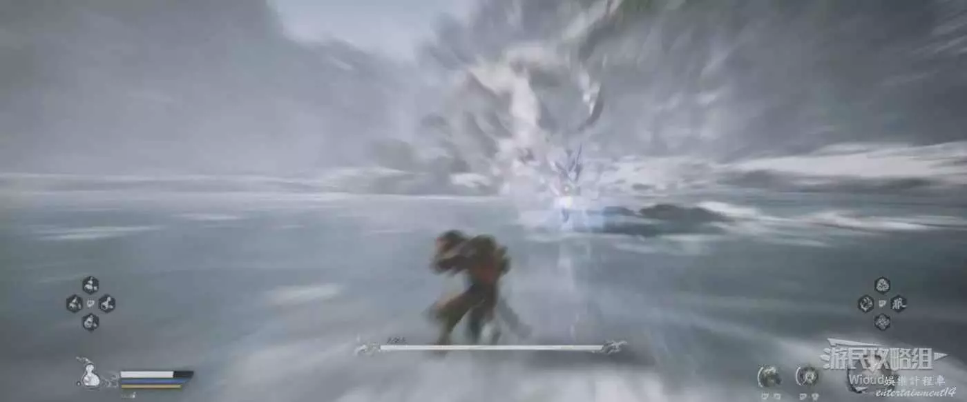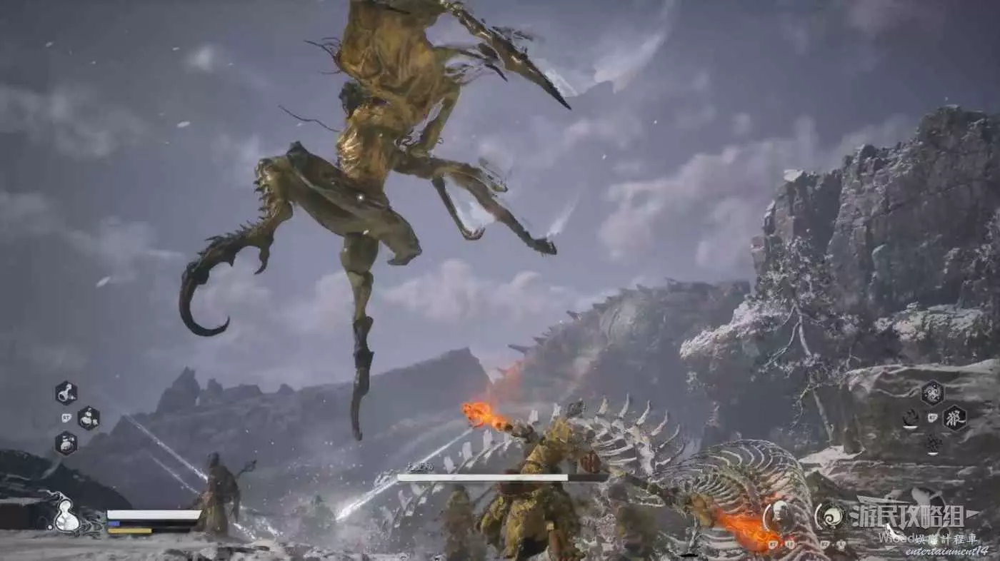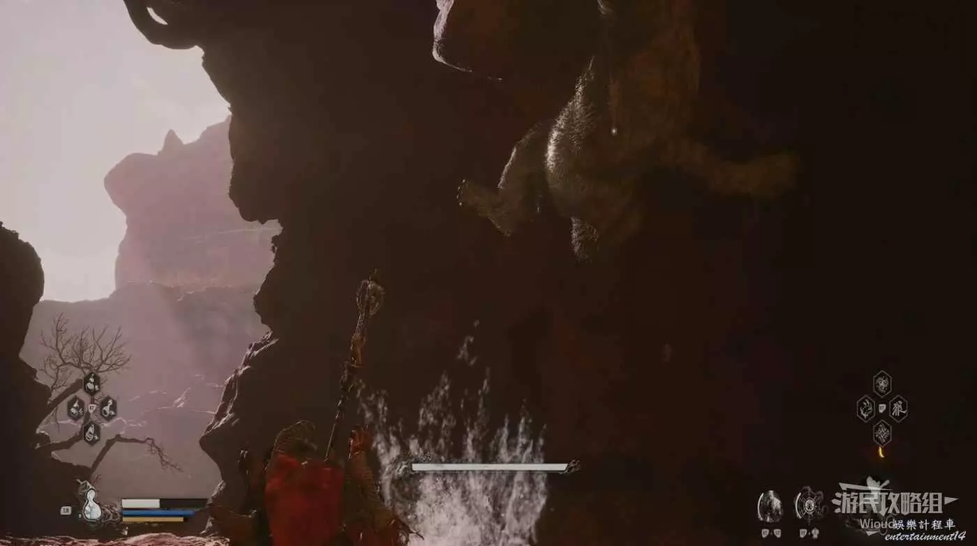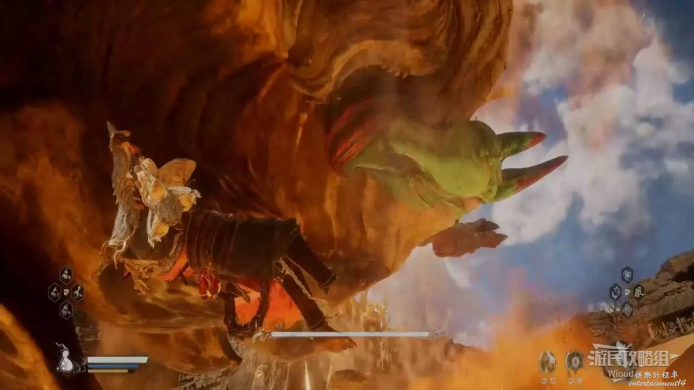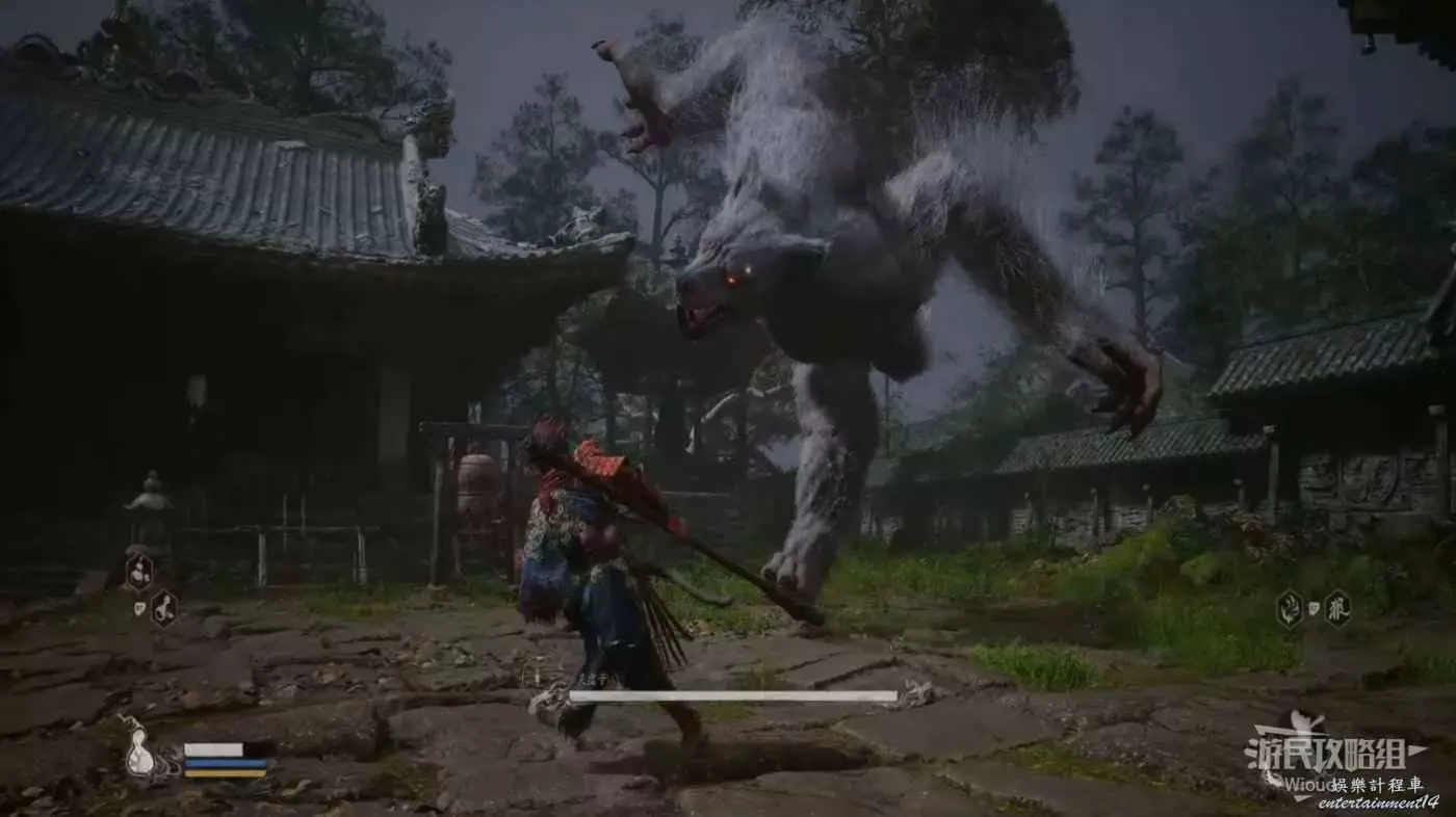 也需要注意黑風大王的人形突進招式,常常在猴子喝藥的時候使用,建議在耗掉黑風大王大半管血後再使用變形技能,通過狼形態收尾。