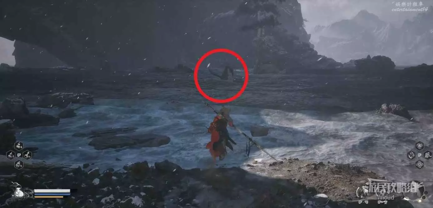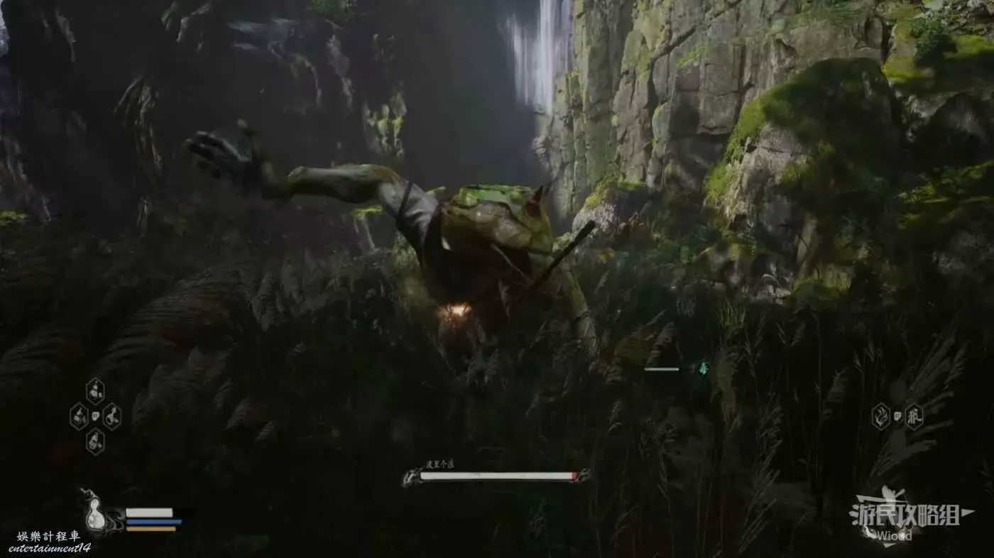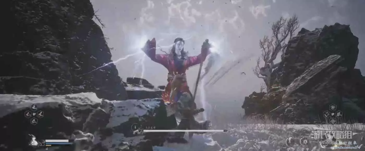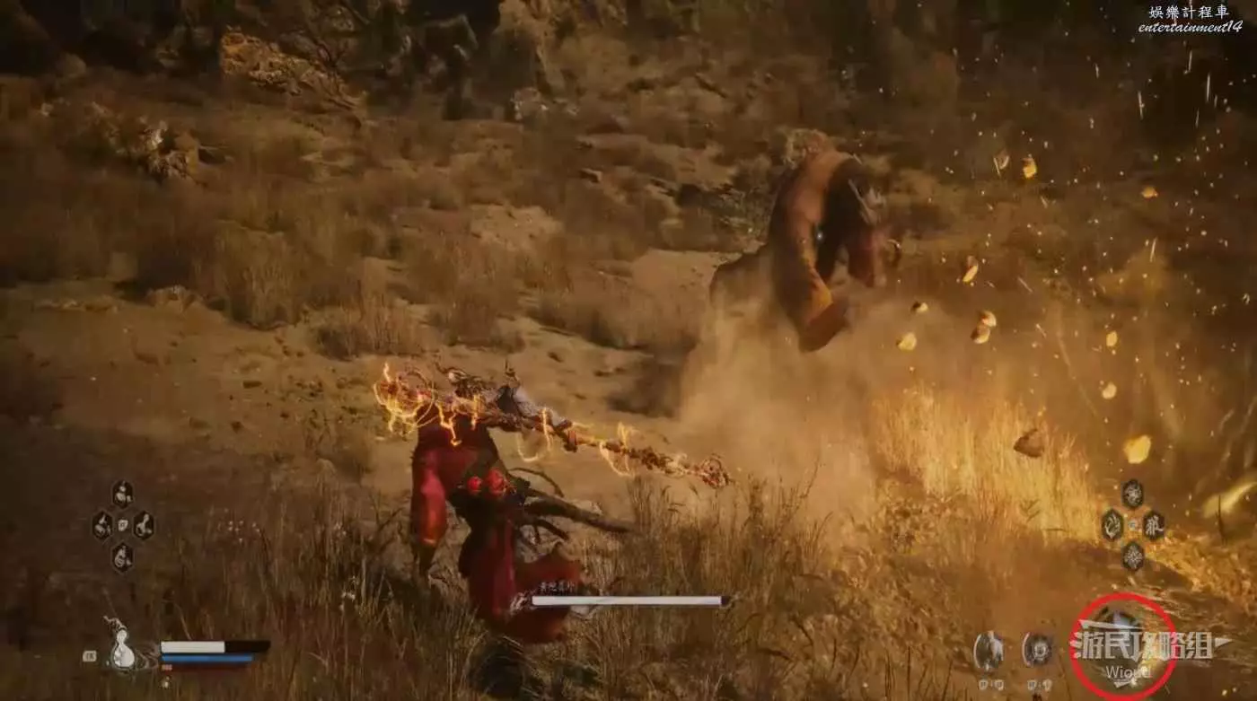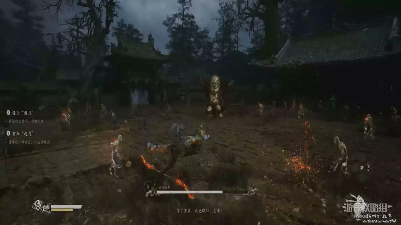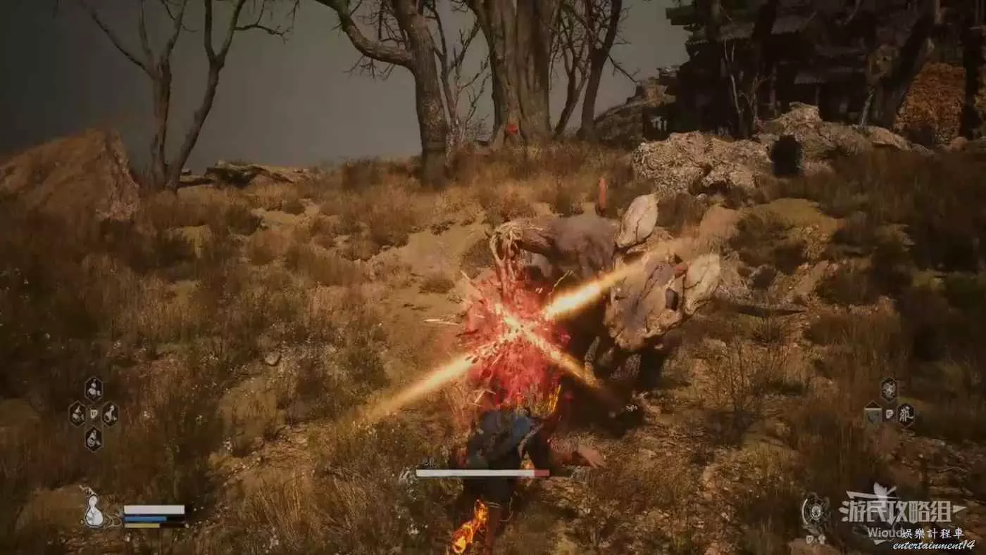 也需要注意黑風大王的人形突進招式,常常在猴子喝藥的時候使用,建議在耗掉黑風大王大半管血後再使用變形技能,通過狼形態收尾。