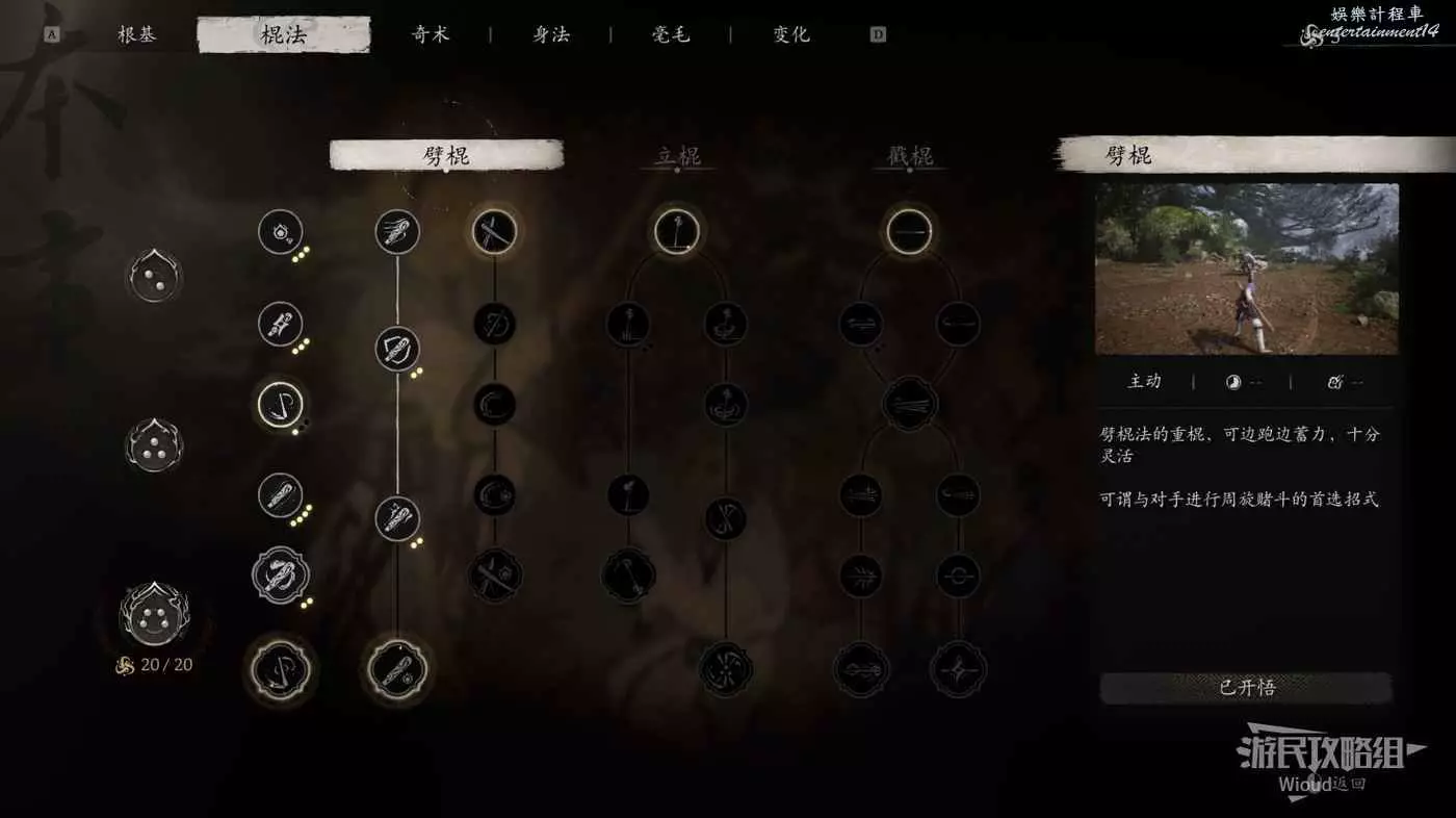 本場戰鬥小編的加點為重擊流,棍勢達到三層,因此攻擊套路也是通過普通與頻繁的躲避技能積攢棍勢,通過定身術與黑風大王本身技能造成的硬直進行輸出。