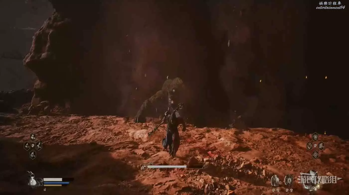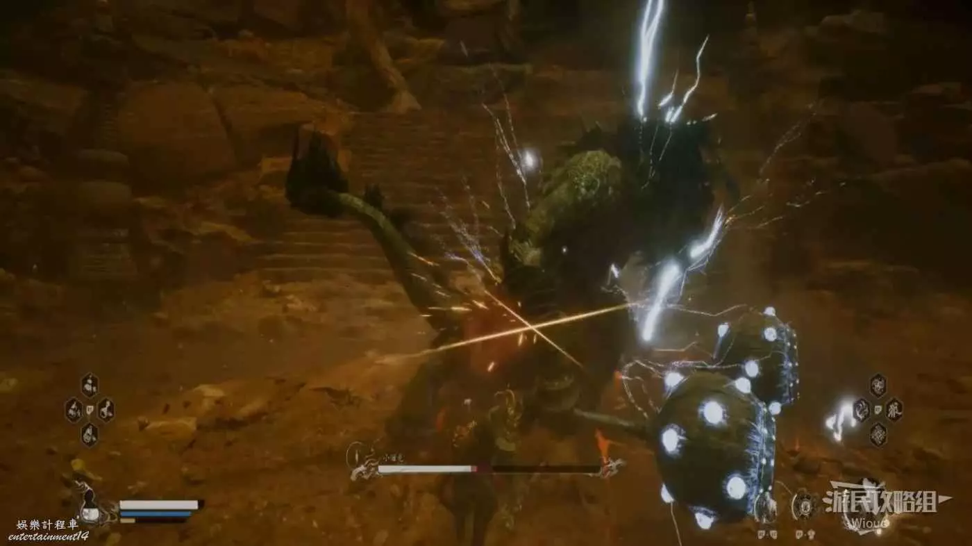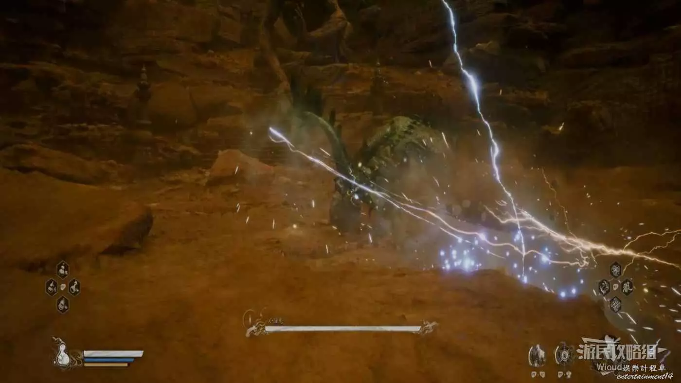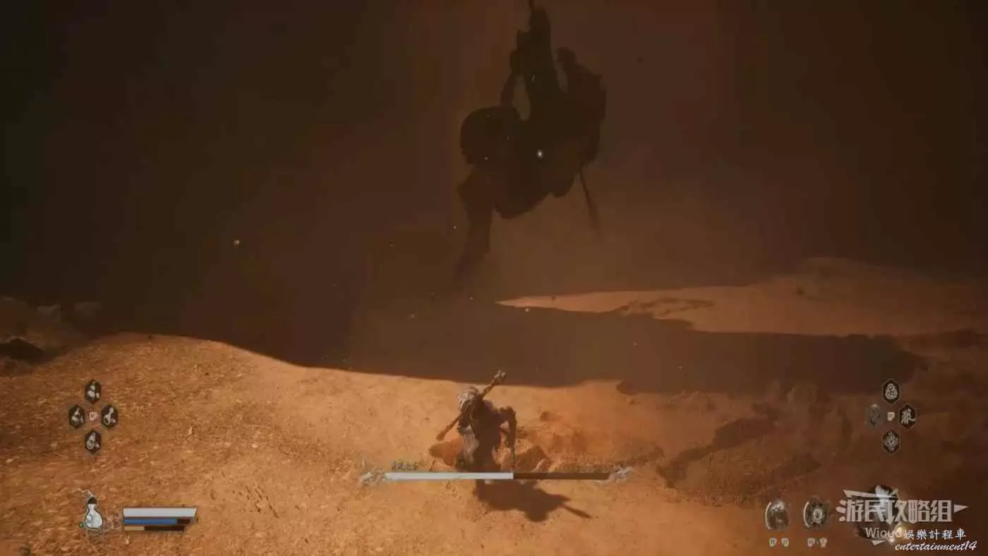 這個BOSS主要難度在於大量的敵人,直接使用【身外身法】召喚猴子猴孫去戰鬥,把小怪清了,BOSS難度支線降低,靠近他想辦法躲開他向下劈砍的攻擊即可。