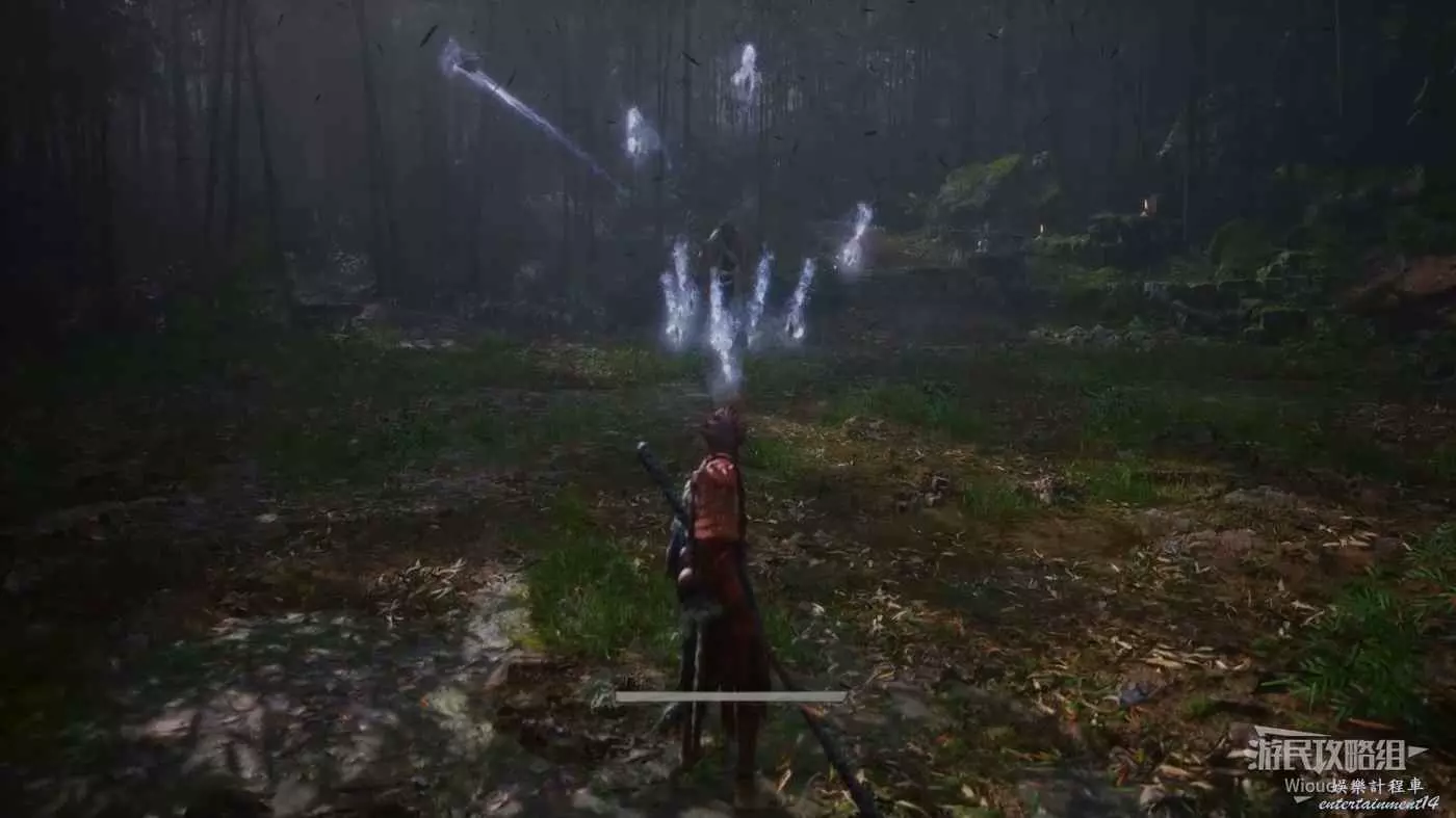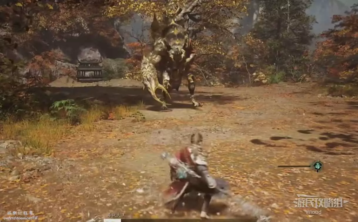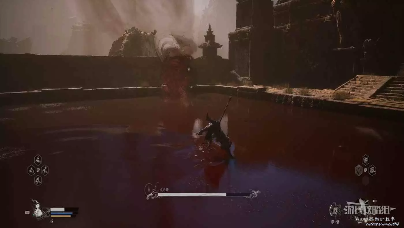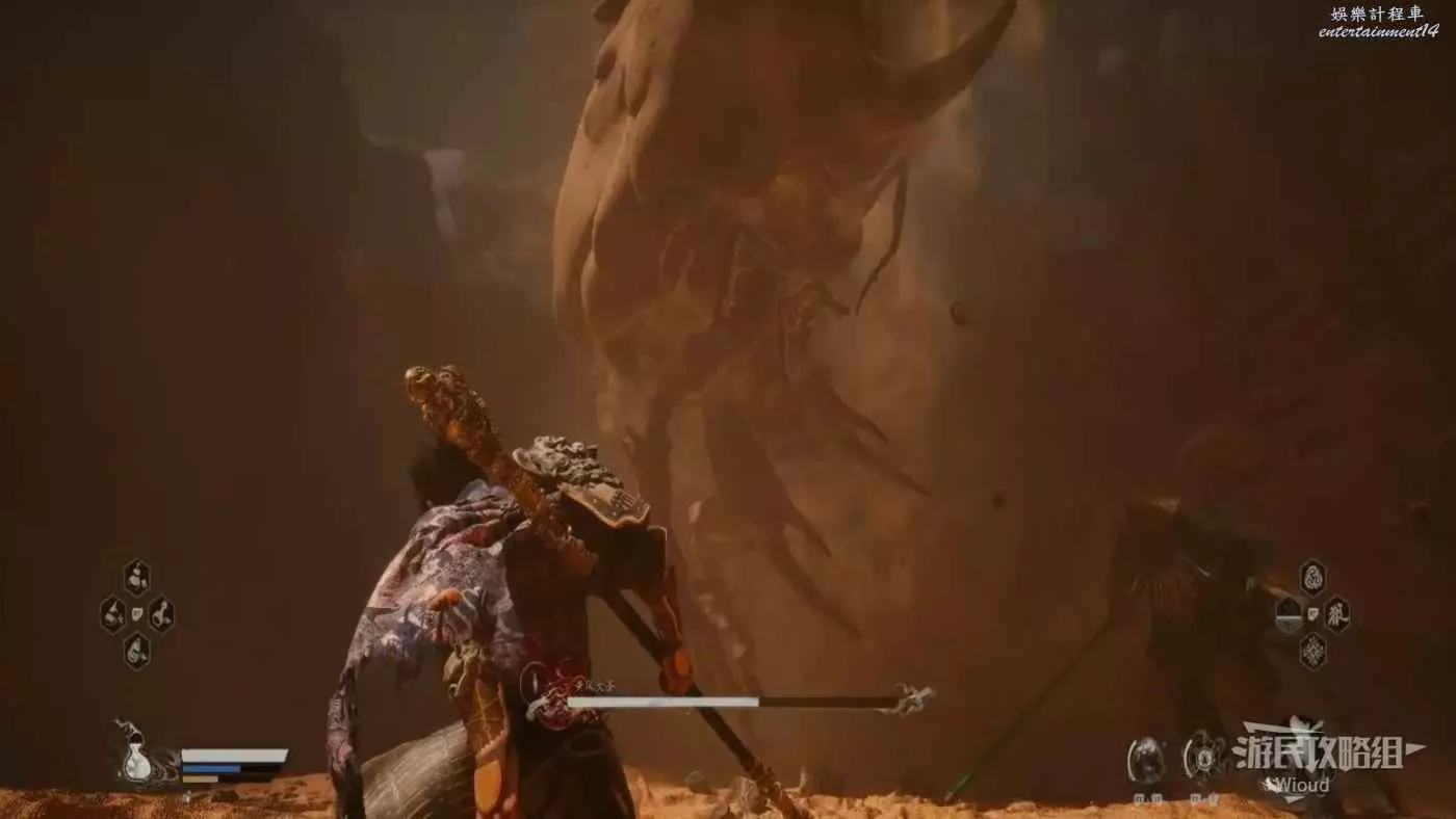 這個BOSS主要難度在於大量的敵人,直接使用【身外身法】召喚猴子猴孫去戰鬥,把小怪清了,BOSS難度支線降低,靠近他想辦法躲開他向下劈砍的攻擊即可。