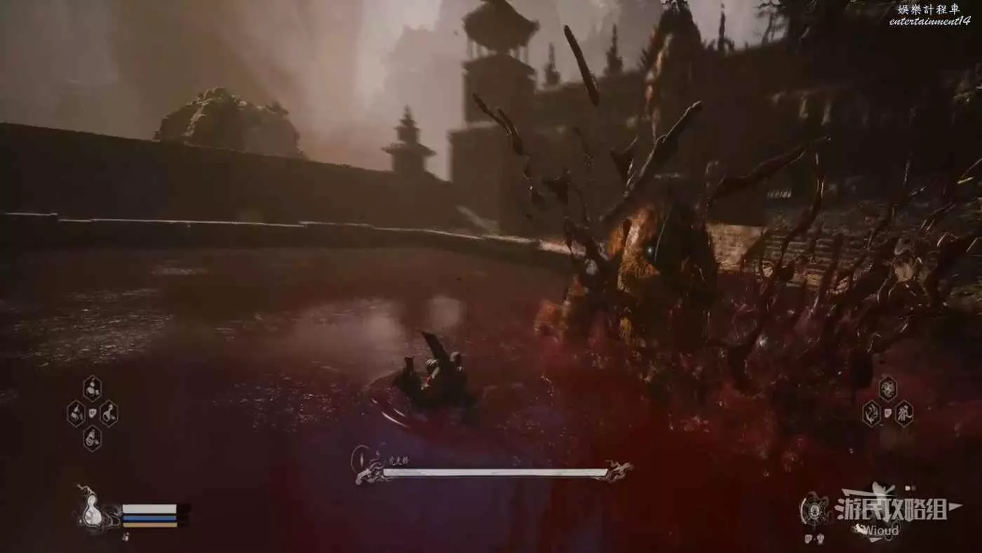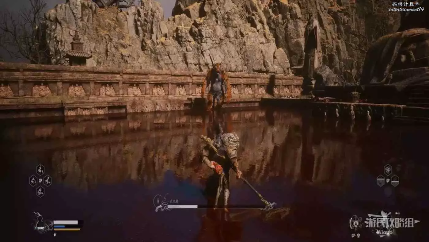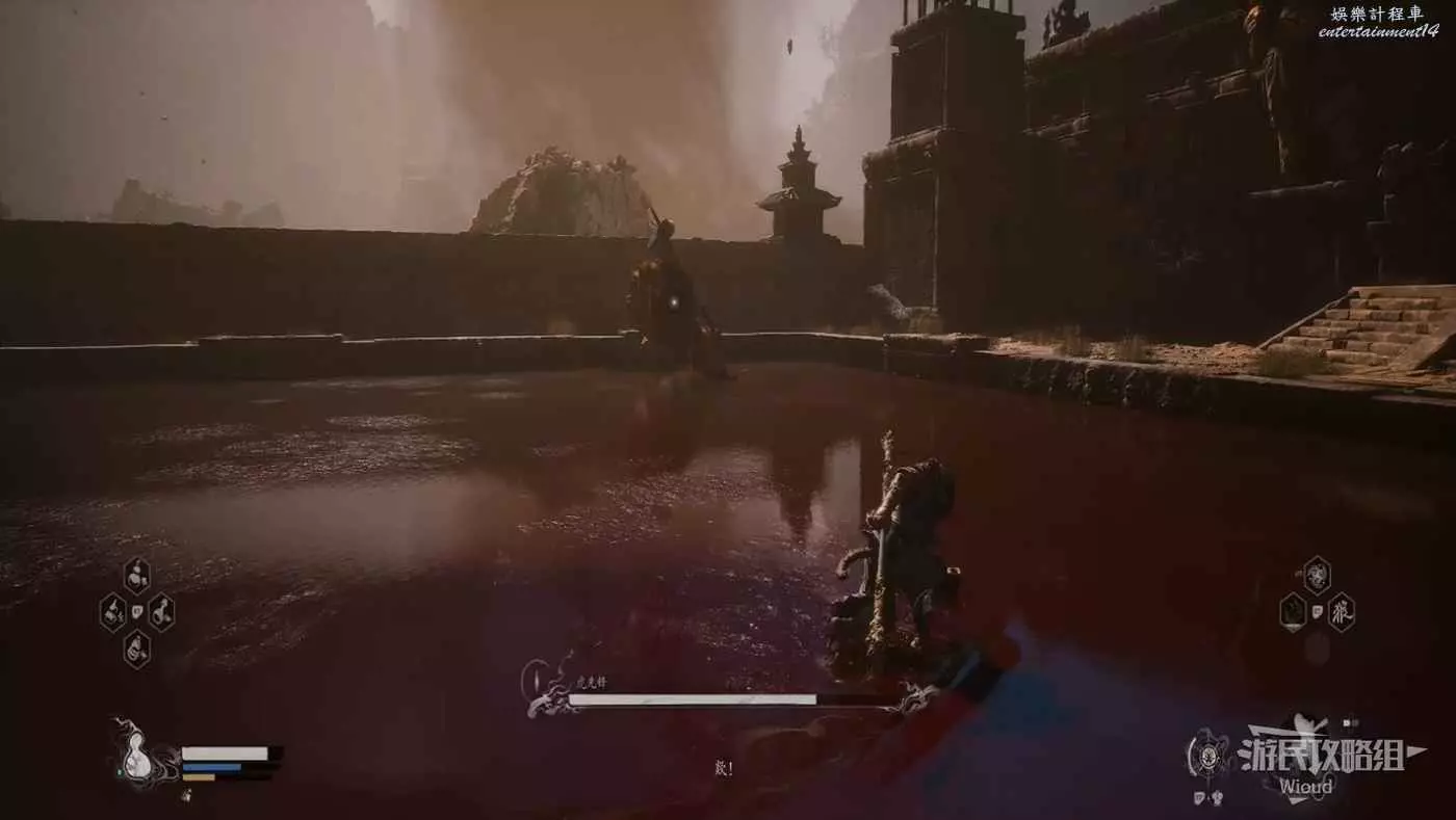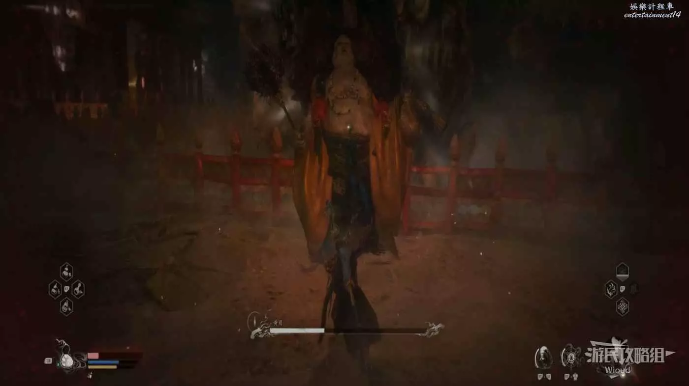 這個BOSS主要難度在於大量的敵人,直接使用【身外身法】召喚猴子猴孫去戰鬥,把小怪清了,BOSS難度支線降低,靠近他想辦法躲開他向下劈砍的攻擊即可。