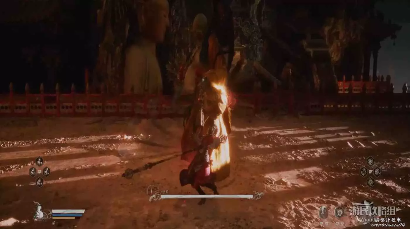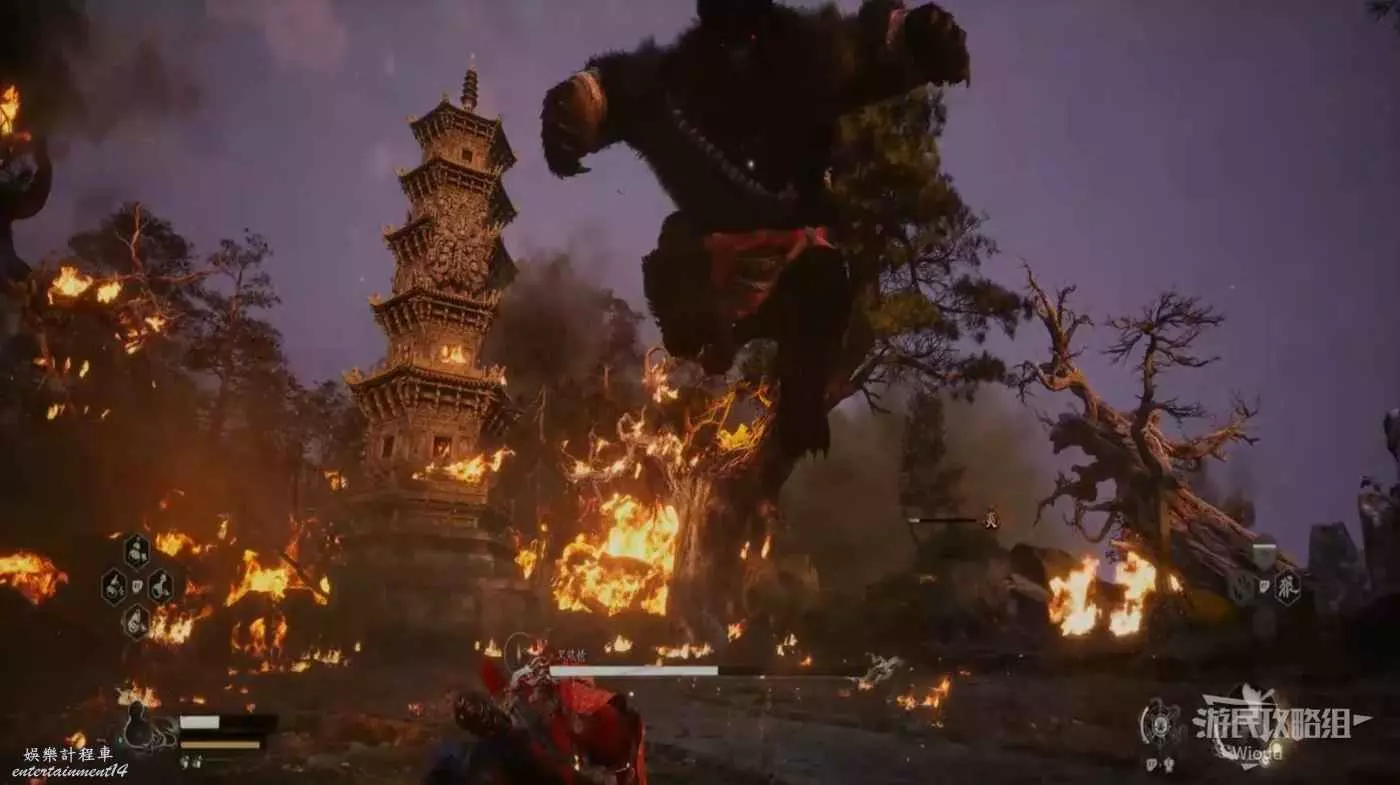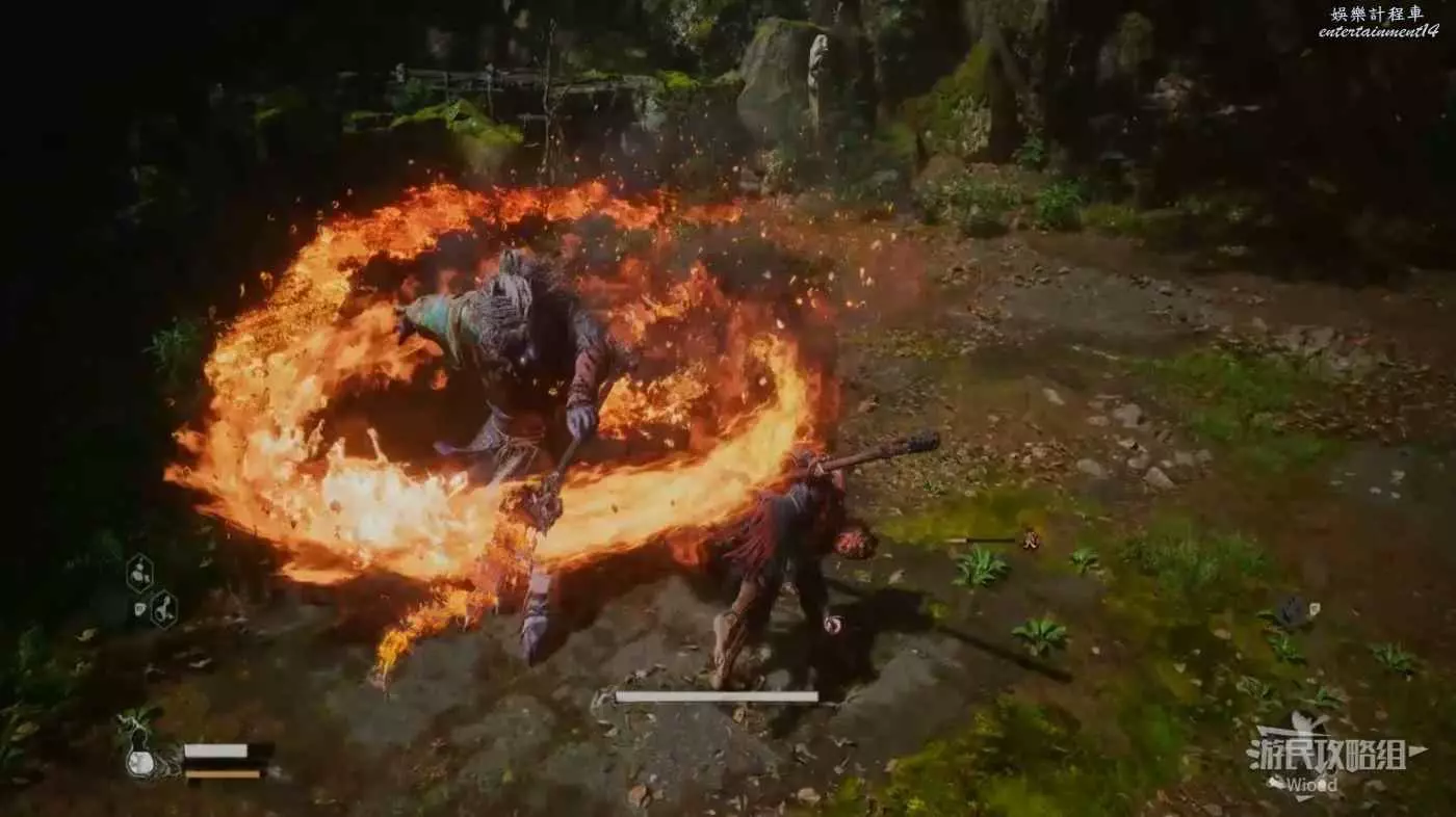 在黑熊的血量到半管及以下時,固定會幻化成一團火開始連續突刺,其機制與黑風大王的風相同,只需要在發現爆炸後翻滾即可,這場BOSS戰的難度很低。