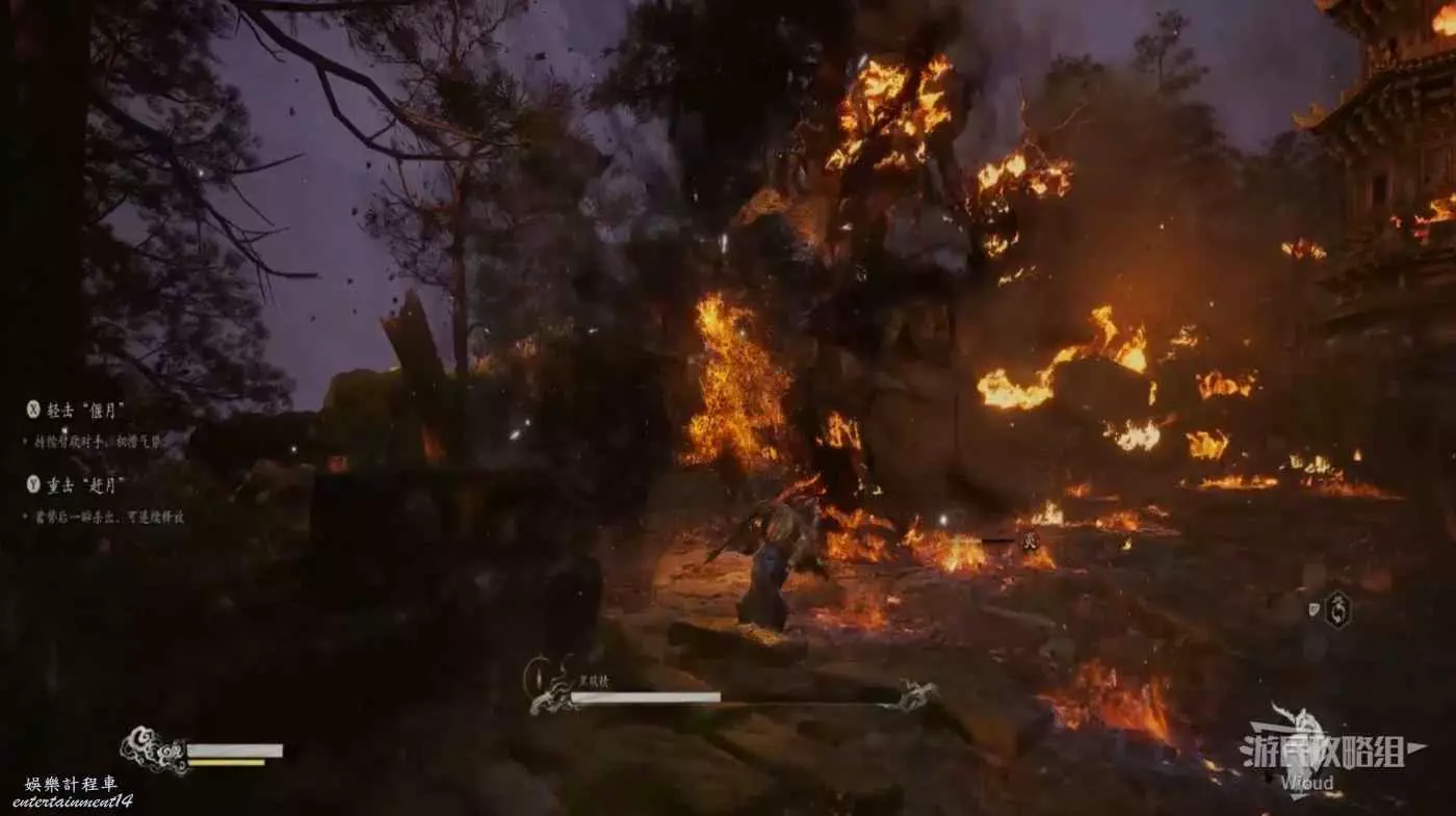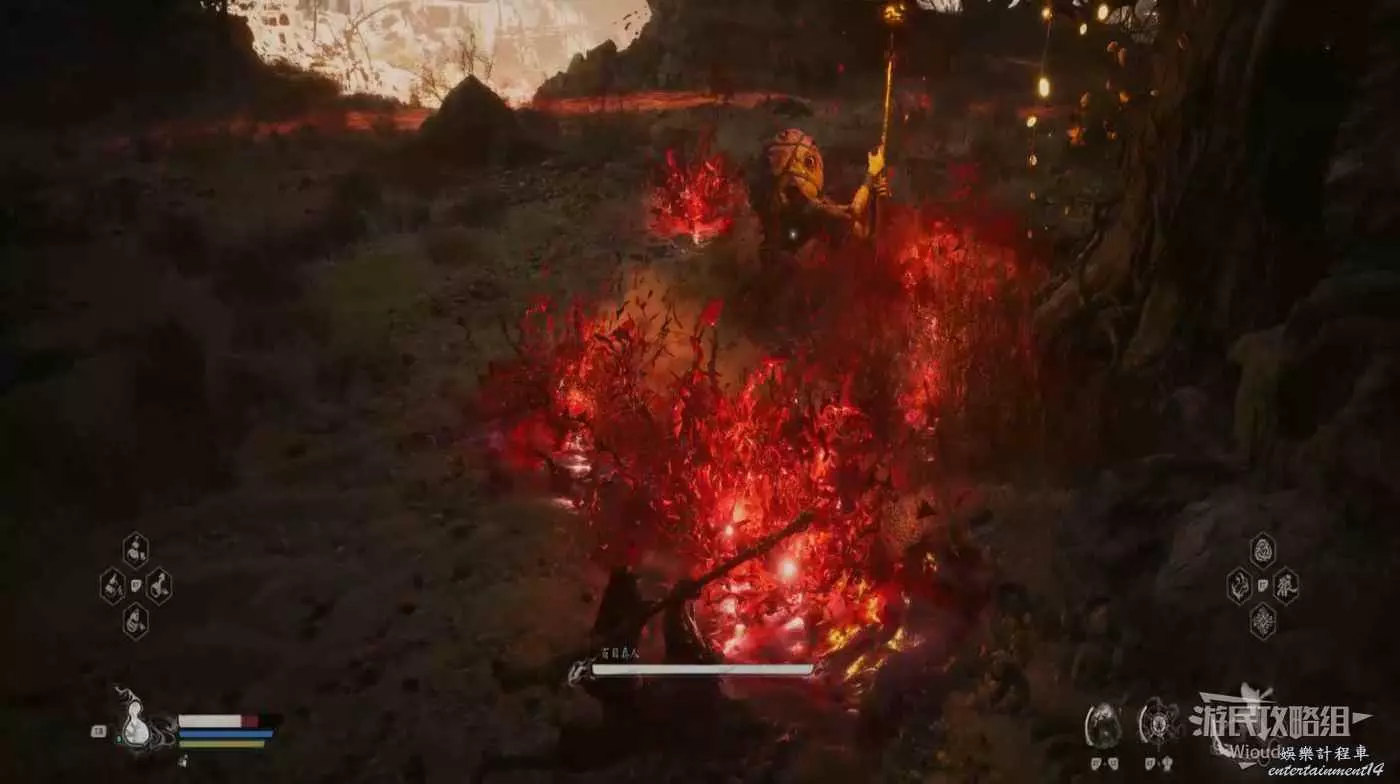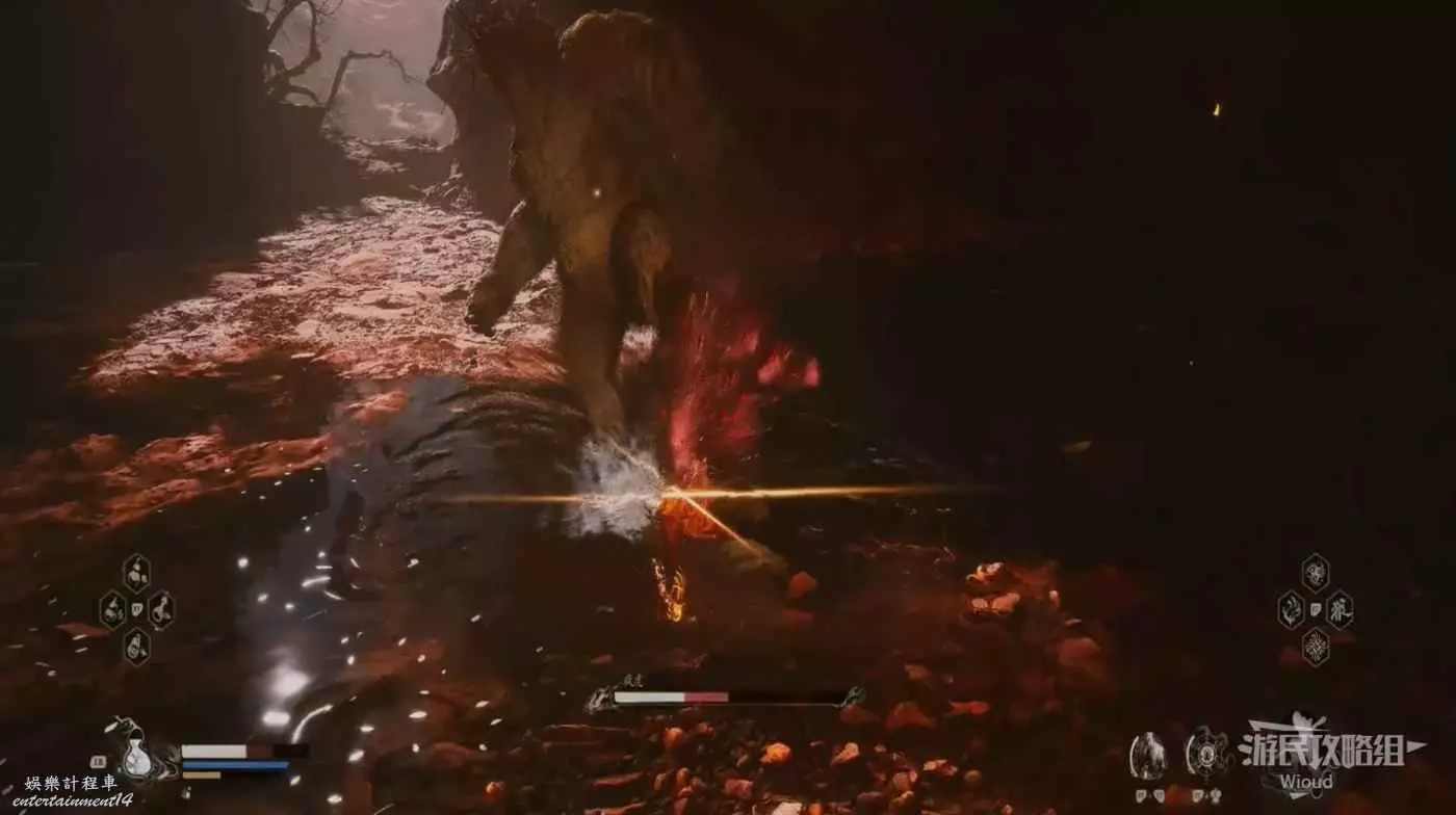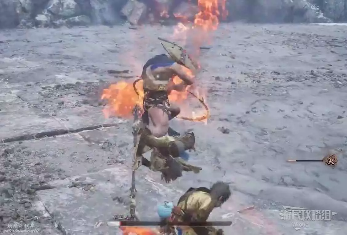 在黑熊的血量到半管及以下時,固定會幻化成一團火開始連續突刺,其機制與黑風大王的風相同,只需要在發現爆炸後翻滾即可,這場BOSS戰的難度很低。