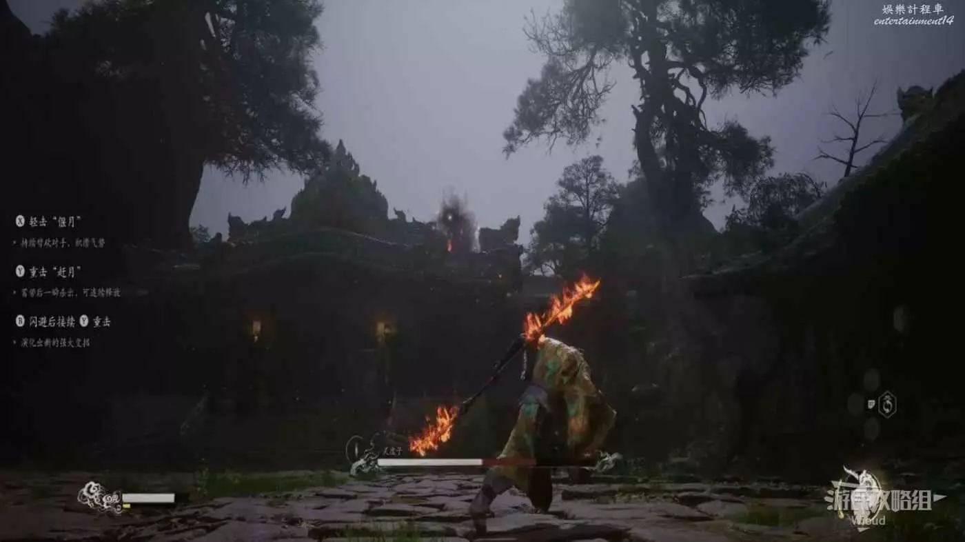 第一次打先試錯,適應一下黑熊精的攻擊前搖與躲避手感,第二次正常打就行,黑星精通常使用前掌來攻擊,偶爾會跳起來或幻化成一團火沖過來突刺,都是前搖明顯很好躲避的招式。