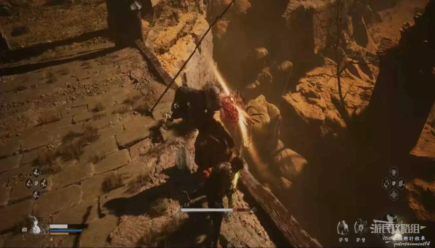 然後在黑風大王攻擊的時候抓他的硬直,普工一棍兩棍的繼續躲傷害,上面也提到過黑風大王身板很脆,通過躲避連招斷斷續續的攻擊積攢棍勢,通過定身術使用重擊造成大量傷害。