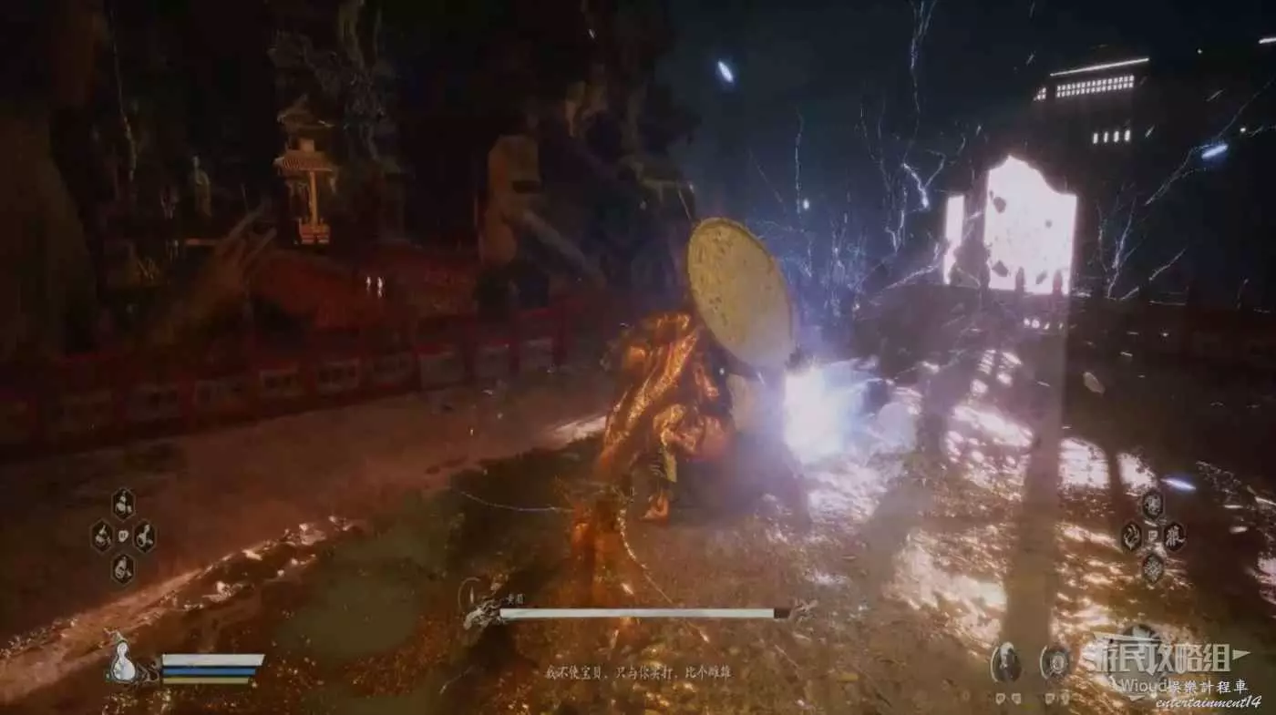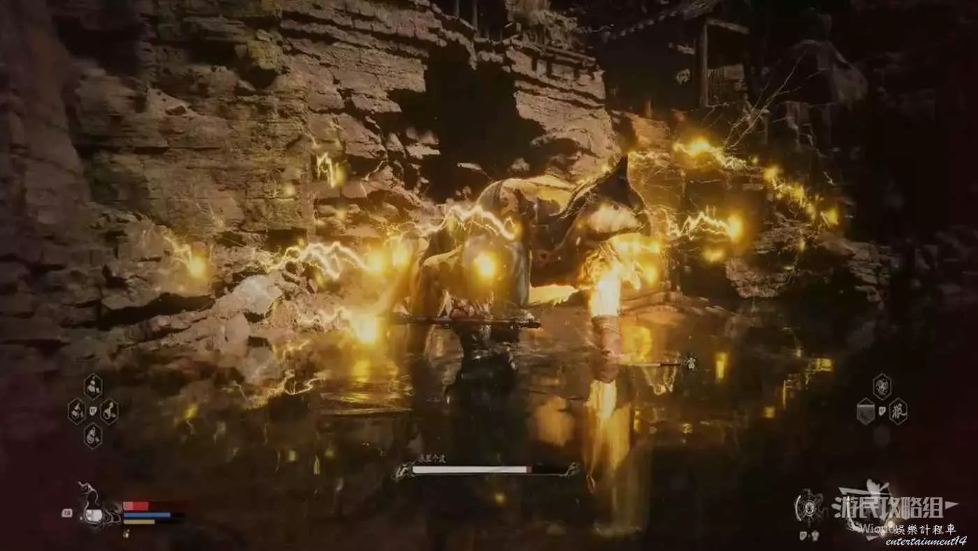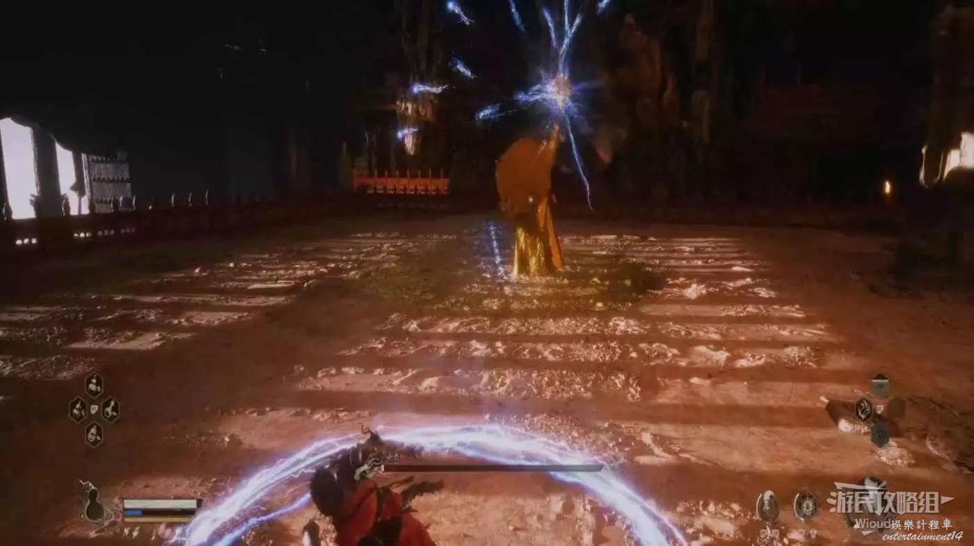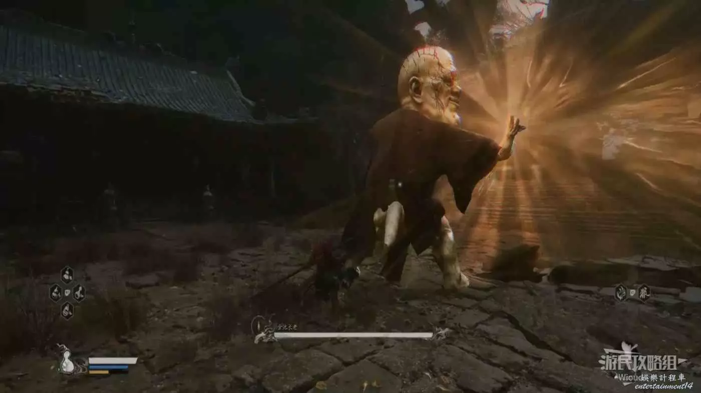 後面需要一直躲避攻擊,直到黃眉站立不動,開始從肚子附近爆出大量雷電,這招結束黃眉會解除金身,我們再沖到黃眉旁邊開始攻擊,黃眉的近戰攻擊與第一階段基本相同。