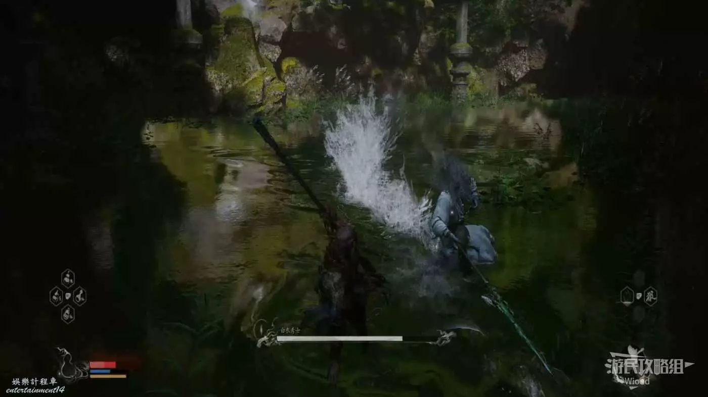 其中只有白衣秀士將槍尖插到地面再扒住槍桿轉圈這套連招有快慢刀,需要注意躲避時機,其他連招都很好躲,正常躲技能穿插普攻積攢棍勢,找准機會重擊就行,雖然白衣秀士不吃硬直,但血很脆。