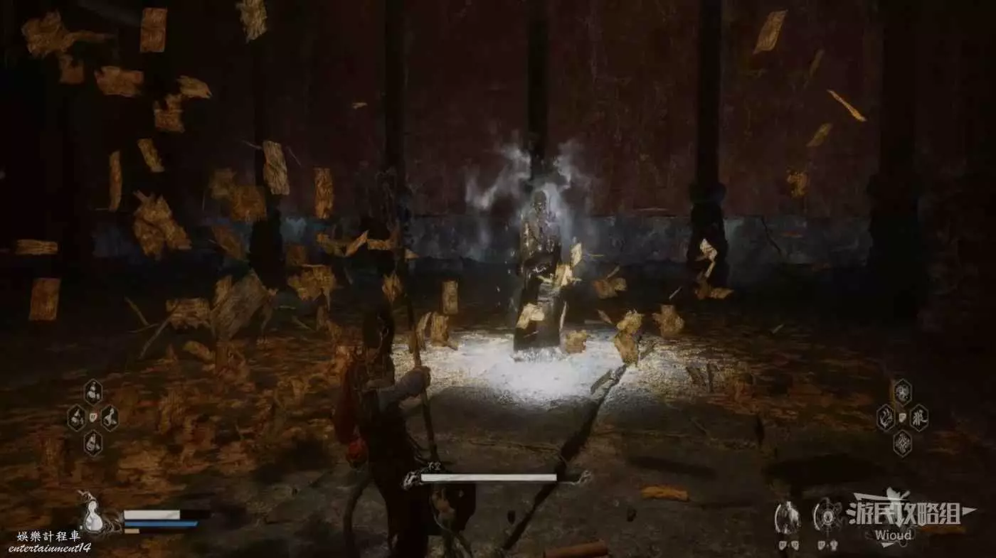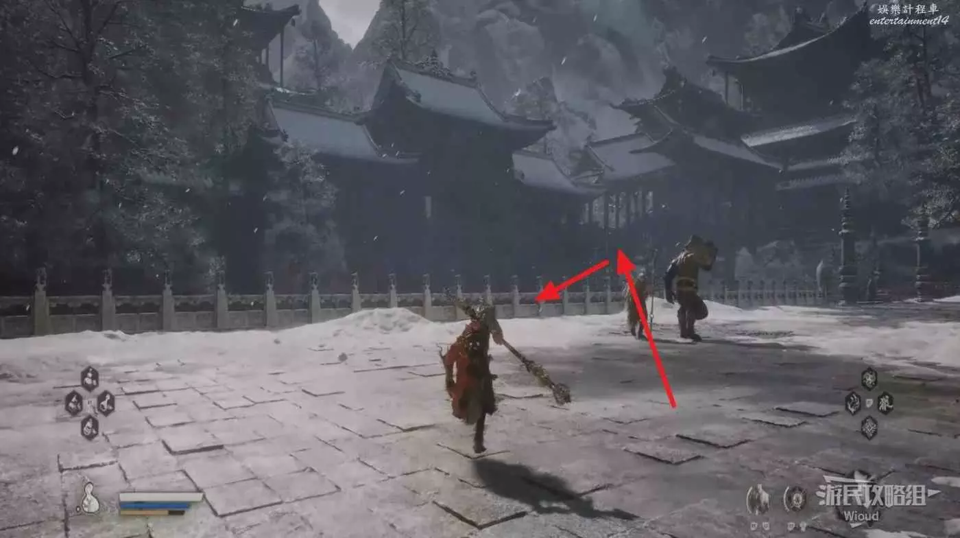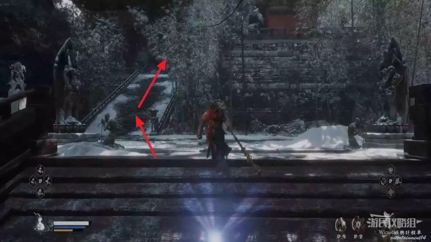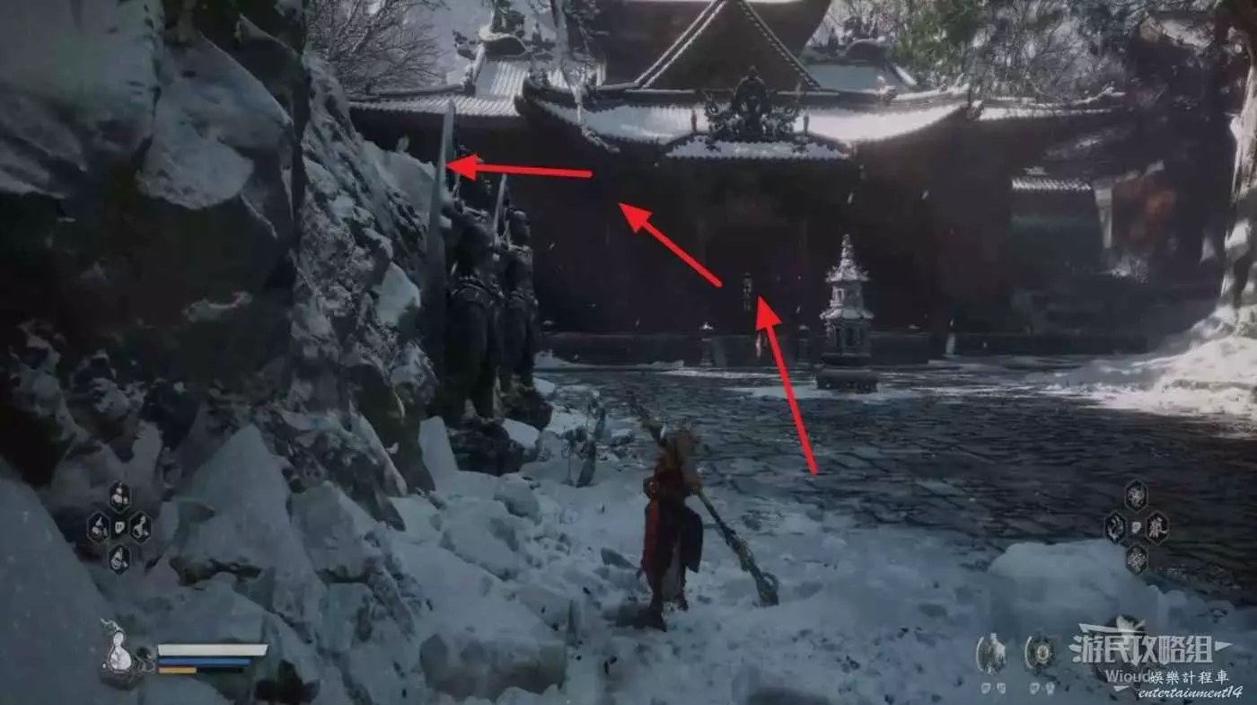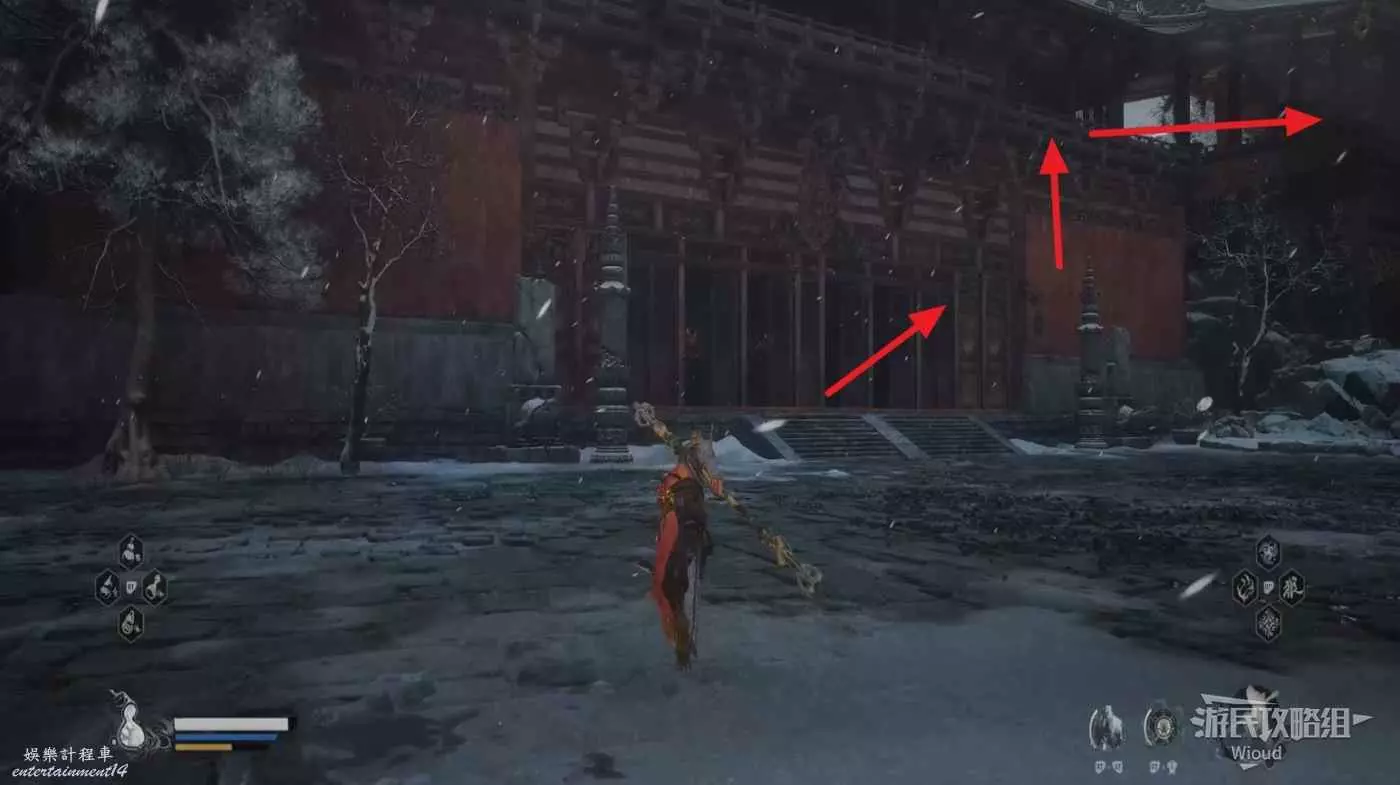 從地圖廟小雷音寺寺門出發,先穿過中間房間,走到第一個樓梯上方然後往左邊區域跳下去,