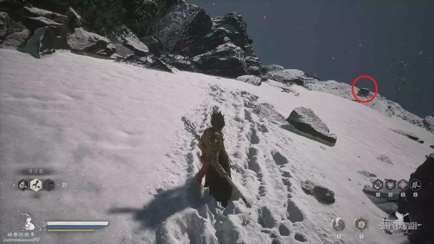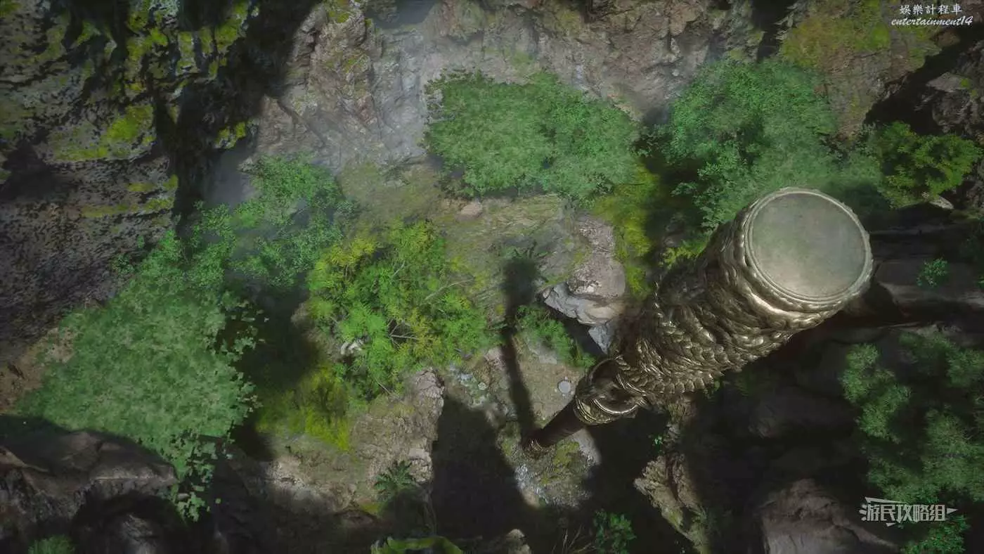 走到兩塊大石頭之間發現可以看到下層的區域,青背龍就坐在下層邊緣處的石墩上釣魚。擊敗青背龍後開啟它旁邊的寶箱即可獲得。