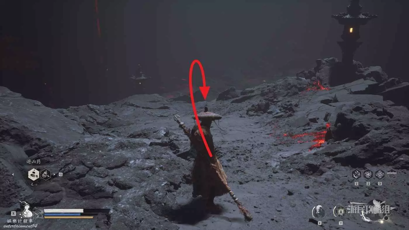 沿著山路一直往前走到斜坡快到底部的位置,可以看到前方兩個是燈籠,從石燈籠處往下跳,可以看到岩壁上有個山洞。這裡也可以直接走到底然後走進山洞,因為附近環境比較像,所以用石燈籠來做標誌物方便大家區分。