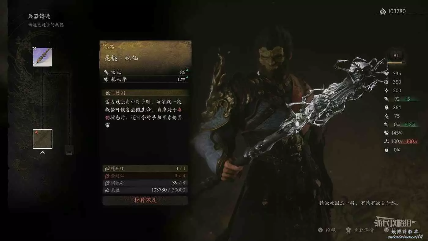 獲取方法:在第二回【黃風嶺-挾魂崖】找到6個佛目珠後,在【挾魂崖-枕石坪】BOSS石先鋒所在區域內用佛目珠召喚並擊敗BOSS石敢當,獲得材料【鐵石心】後即可解鎖鑄造。