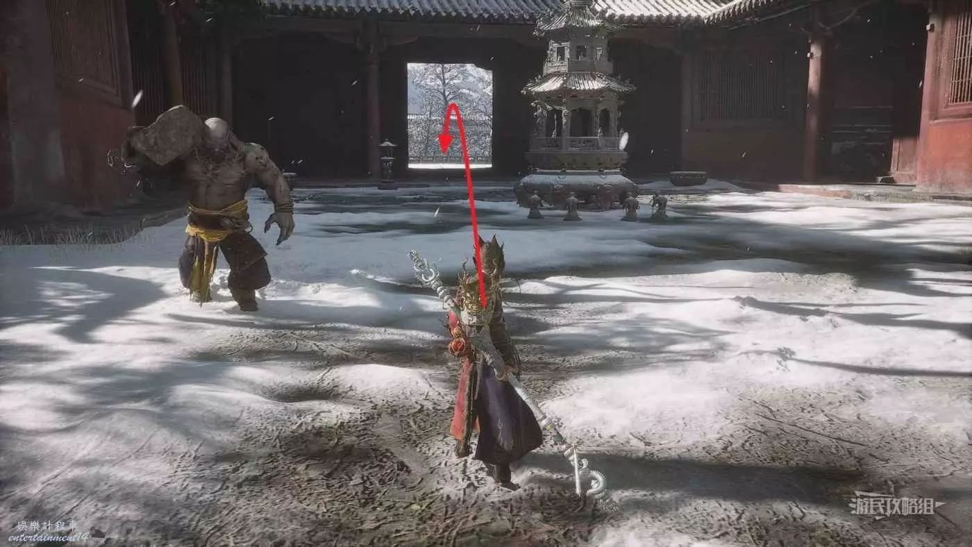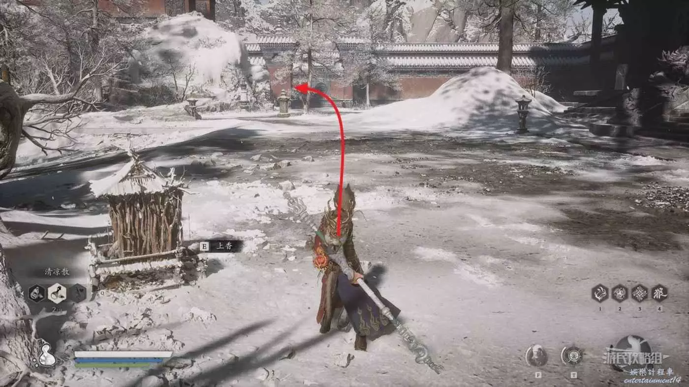 從第三回【小西天-小雷音寺-寺門】出發,面對土地廟往右側走到頭,進入走廊,從走廊沿著唯一的斜坡往上走,然後右轉上樓梯。