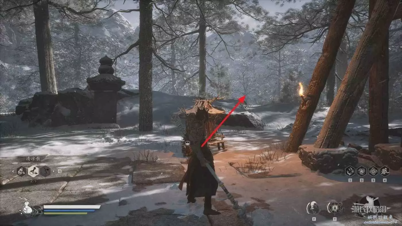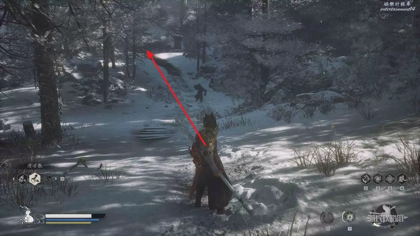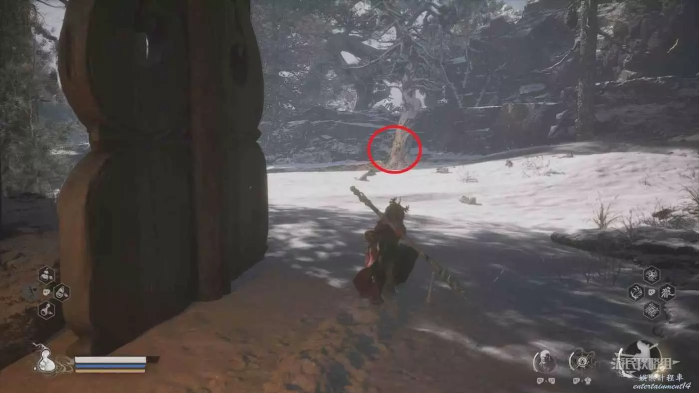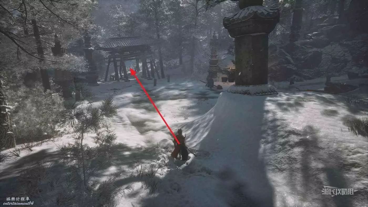 沿著有雪痕的路一直往前走,直到看到木門,木門旁邊還有鱉寶,穿過木門。