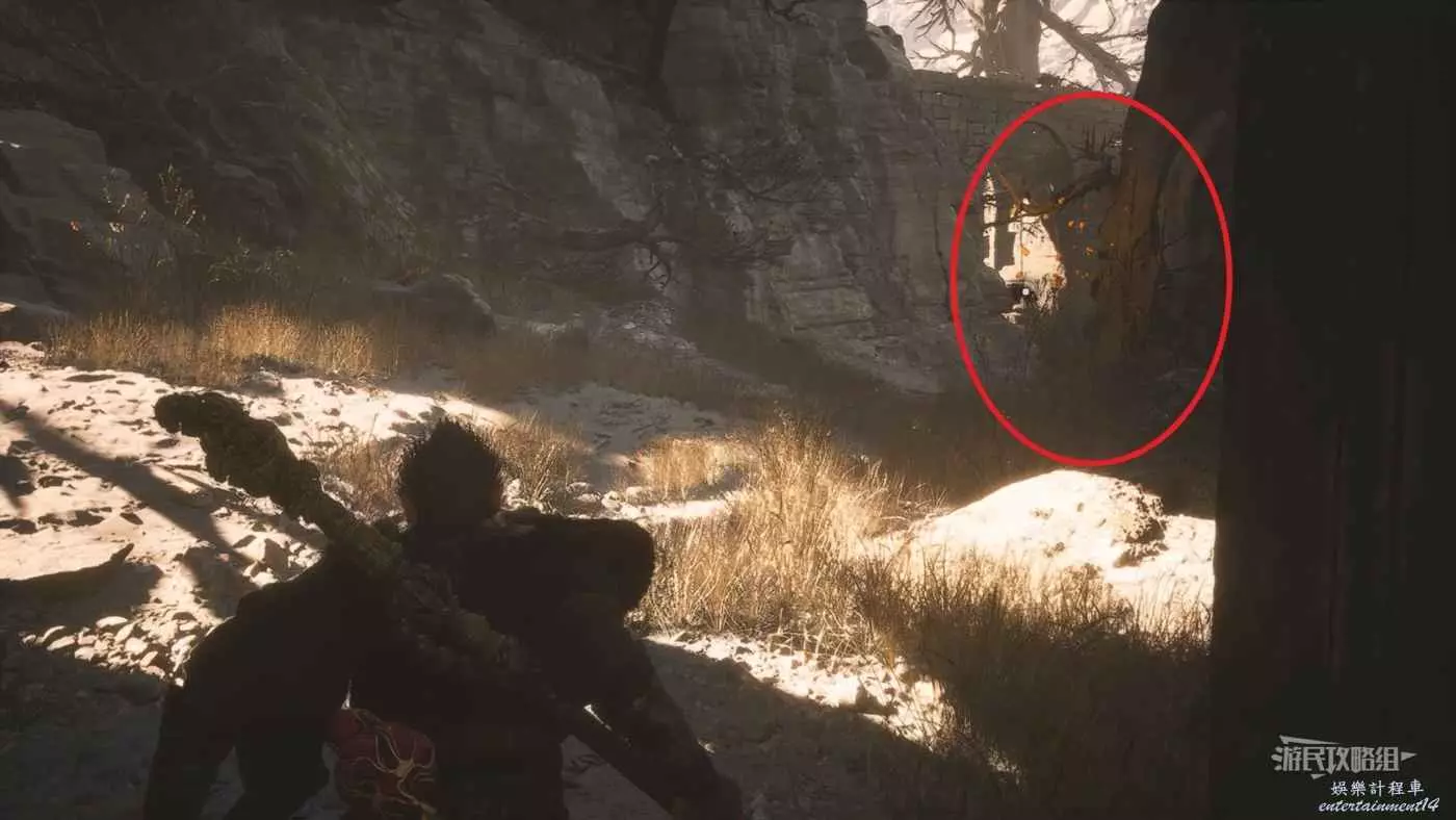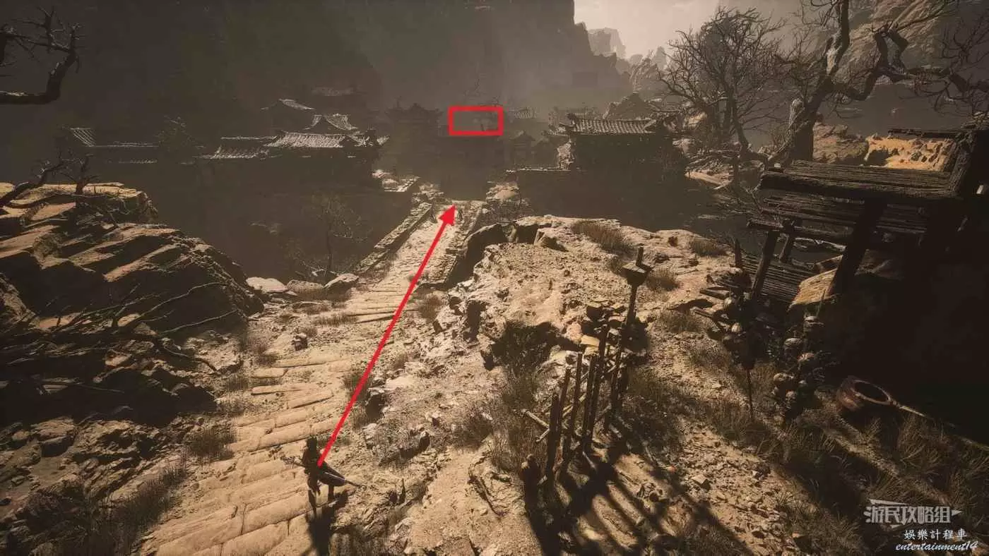 從第二回【黃風嶺-黃風陣-定風莊】土地廟出發,過橋往村子裡走,參考下圖,穿過村子來到最遠處的房子,打開木門,門外就是落伽香藤。