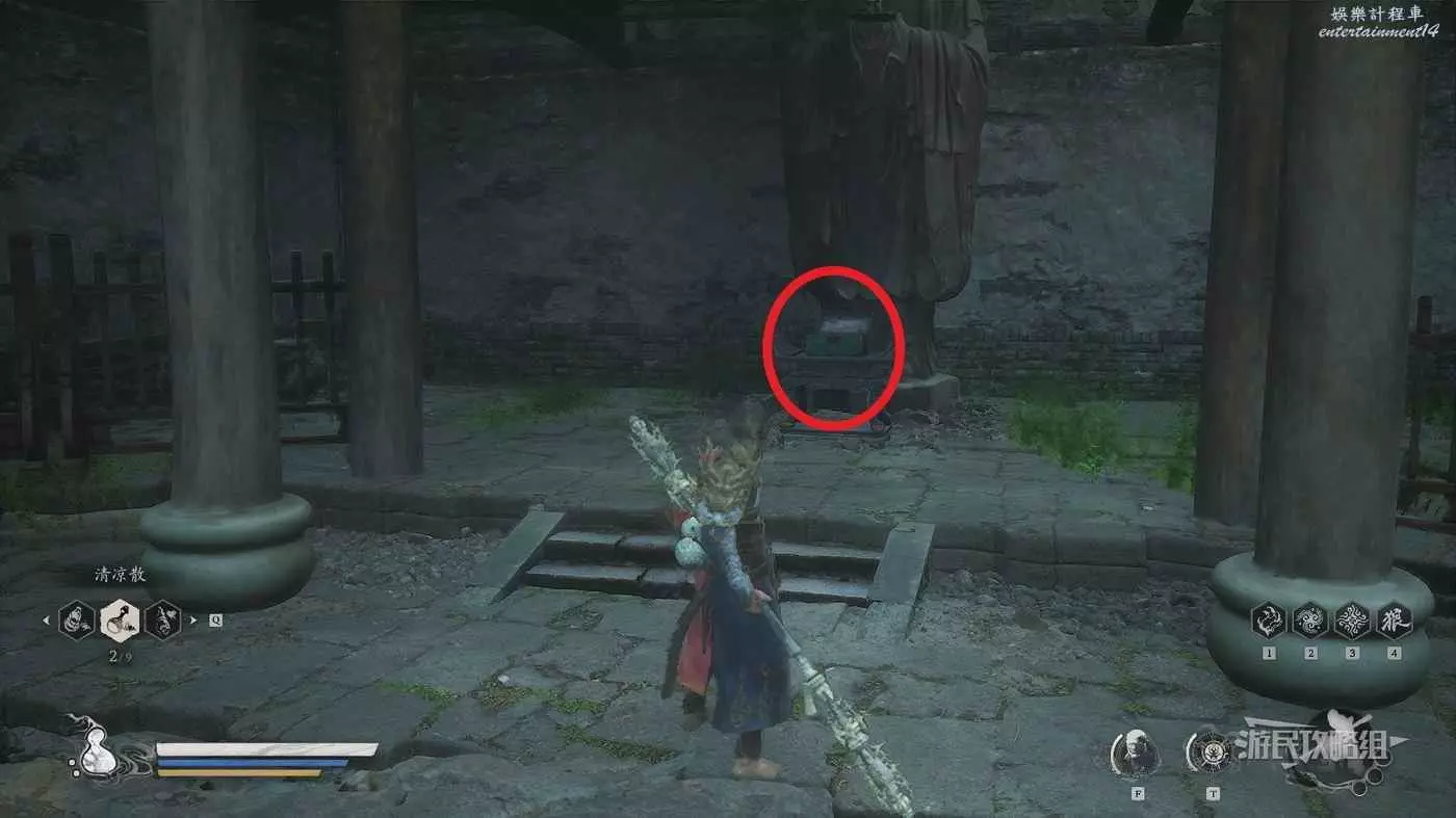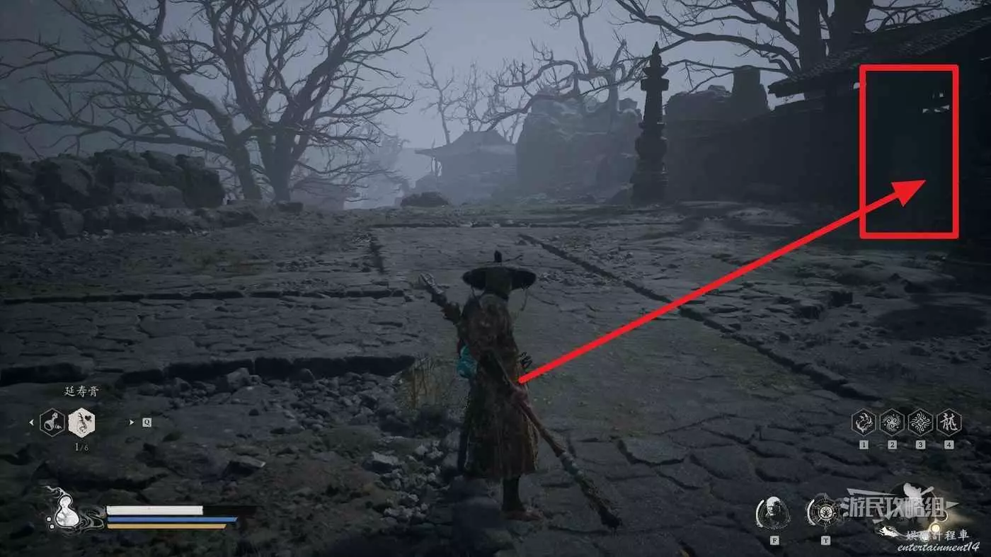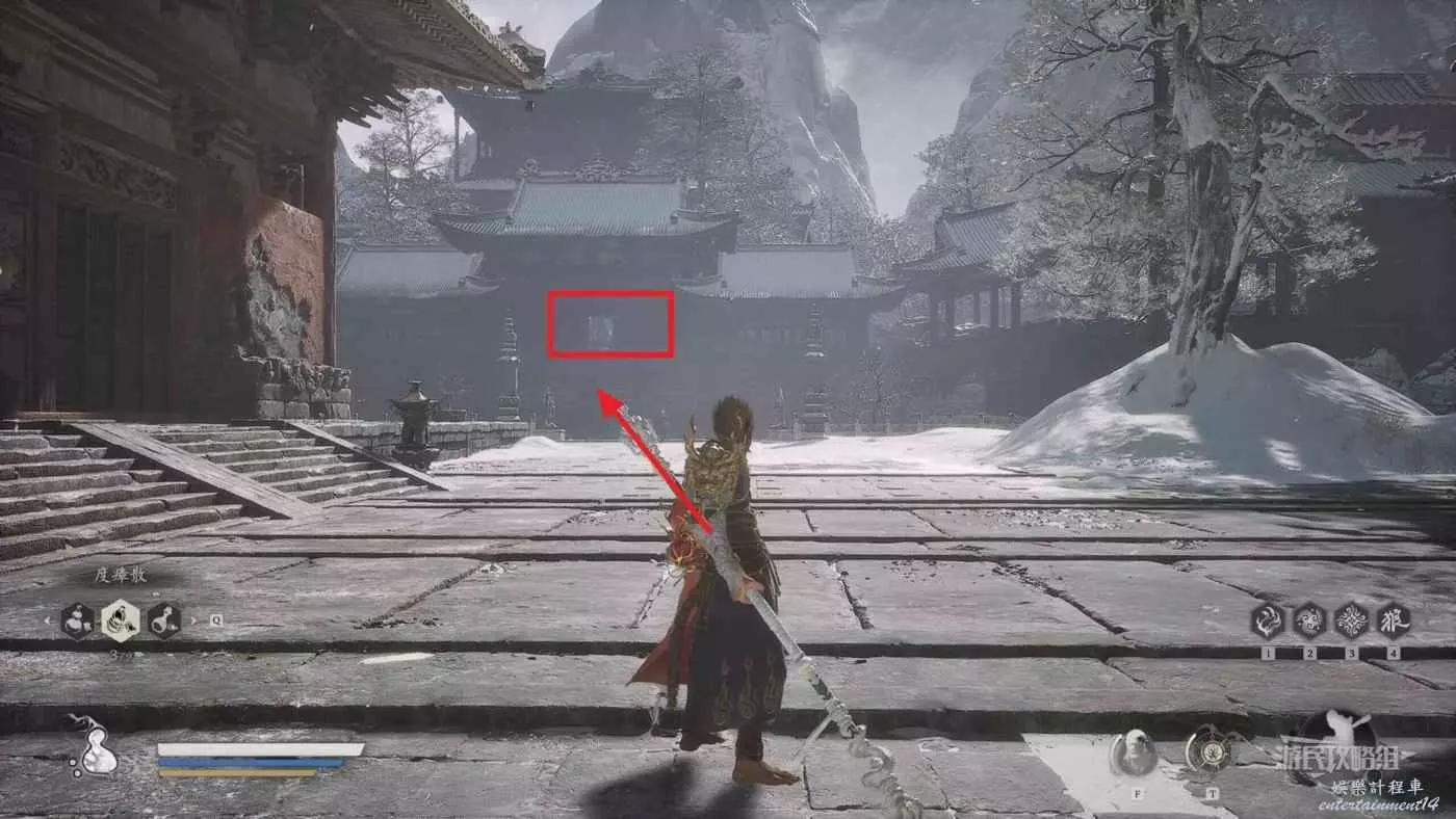 來到二樓的門處,往外看就能看到不空所在的偏殿。打開功能表選擇【行囊】,使用從狐狸那裡獲得的筆,變成狐狸,進入偏殿觸發劇情,然後擊敗BOSS不空。