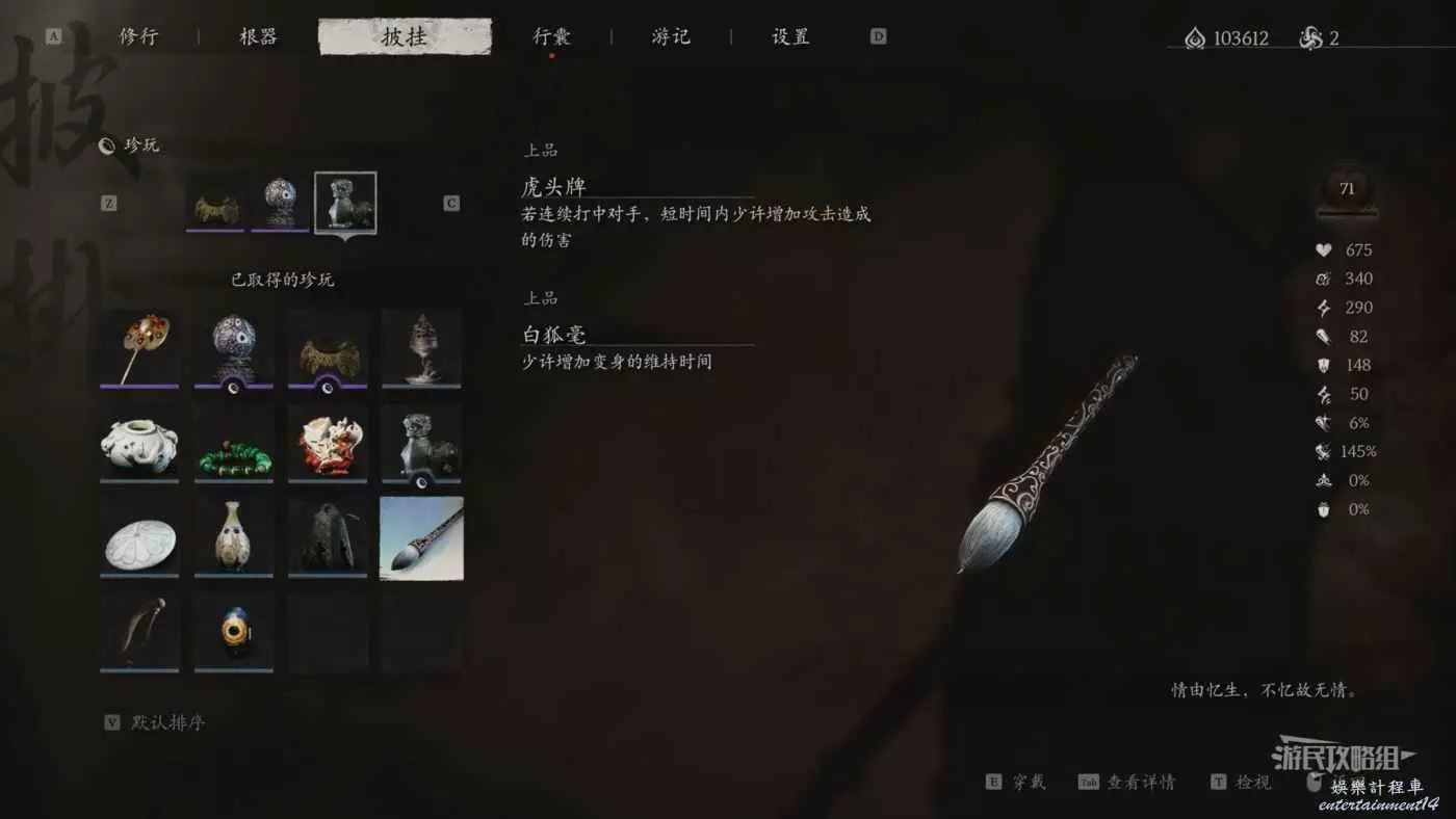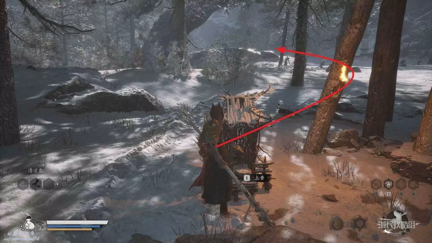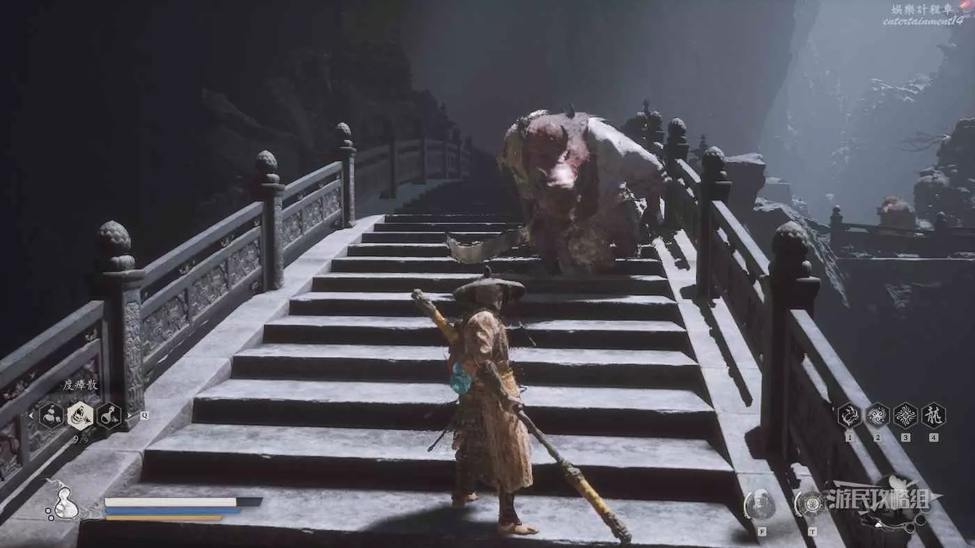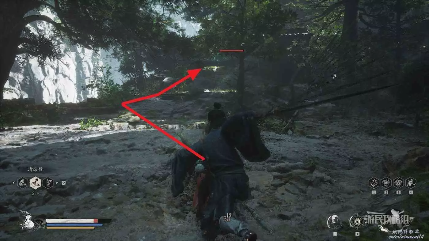 來到二樓的門處,往外看就能看到不空所在的偏殿。打開功能表選擇【行囊】,使用從狐狸那裡獲得的筆,變成狐狸,進入偏殿觸發劇情,然後擊敗BOSS不空。
