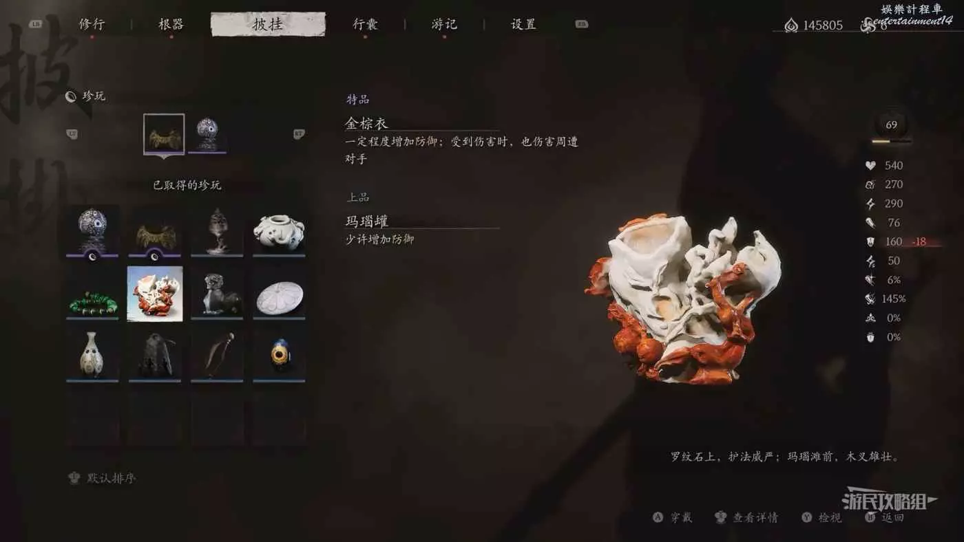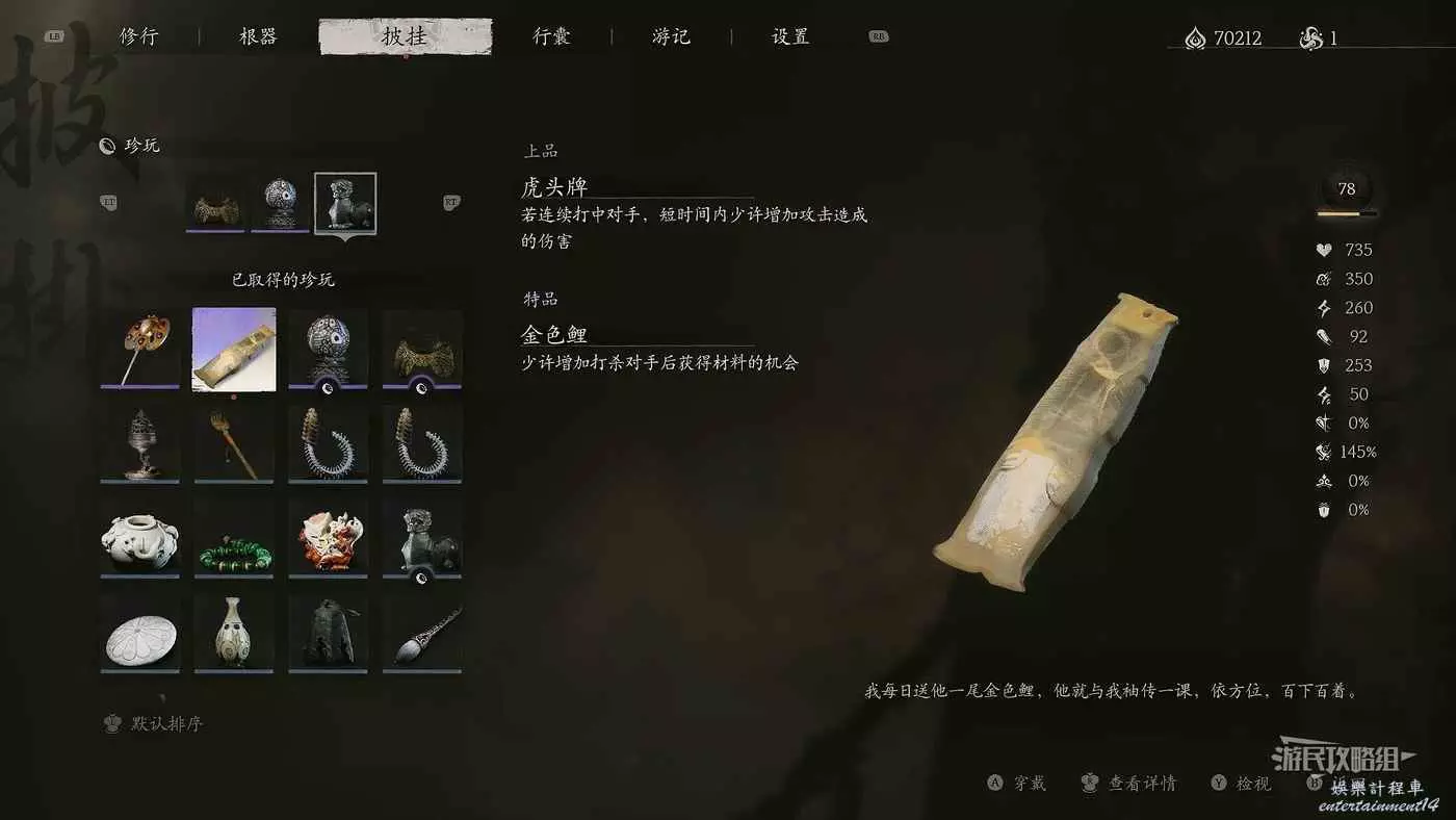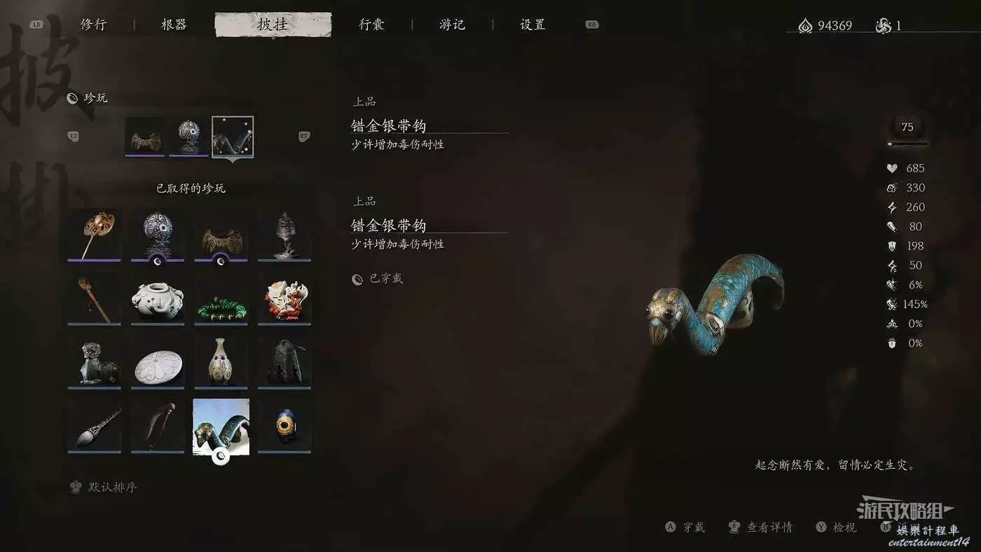 獲取方法:在BOSS沙大郎所在位置拿到飛龍鱗片後,前往第二回【挾魂崖-枕石坪】,面對土地廟往右走樓梯到達上層,往前方上面可以看到沙瀑,靠近沙瀑並與沙瀑互動,開啟大門觸發與小驪龍的BOSS戰,擊敗小驪龍後開啟樓梯上方的寶箱即可獲得此珍玩。