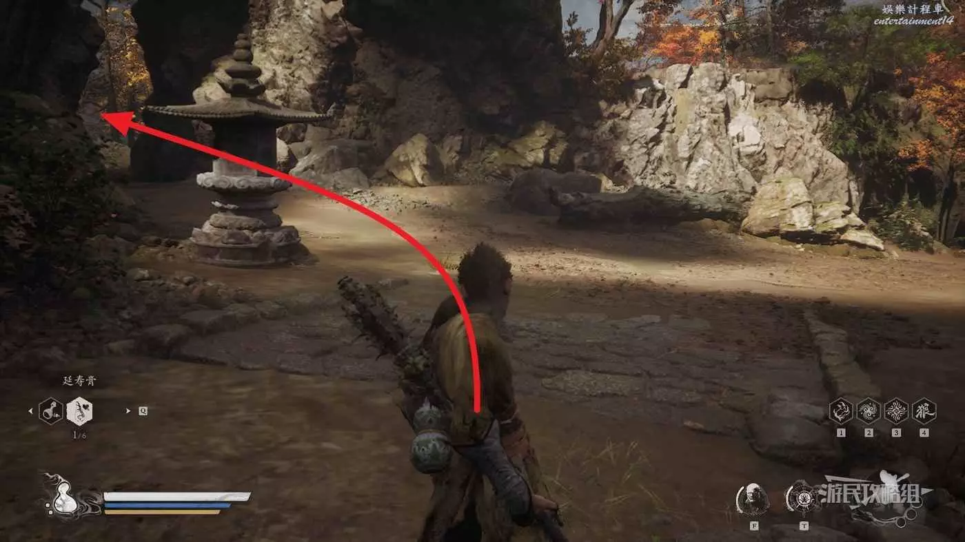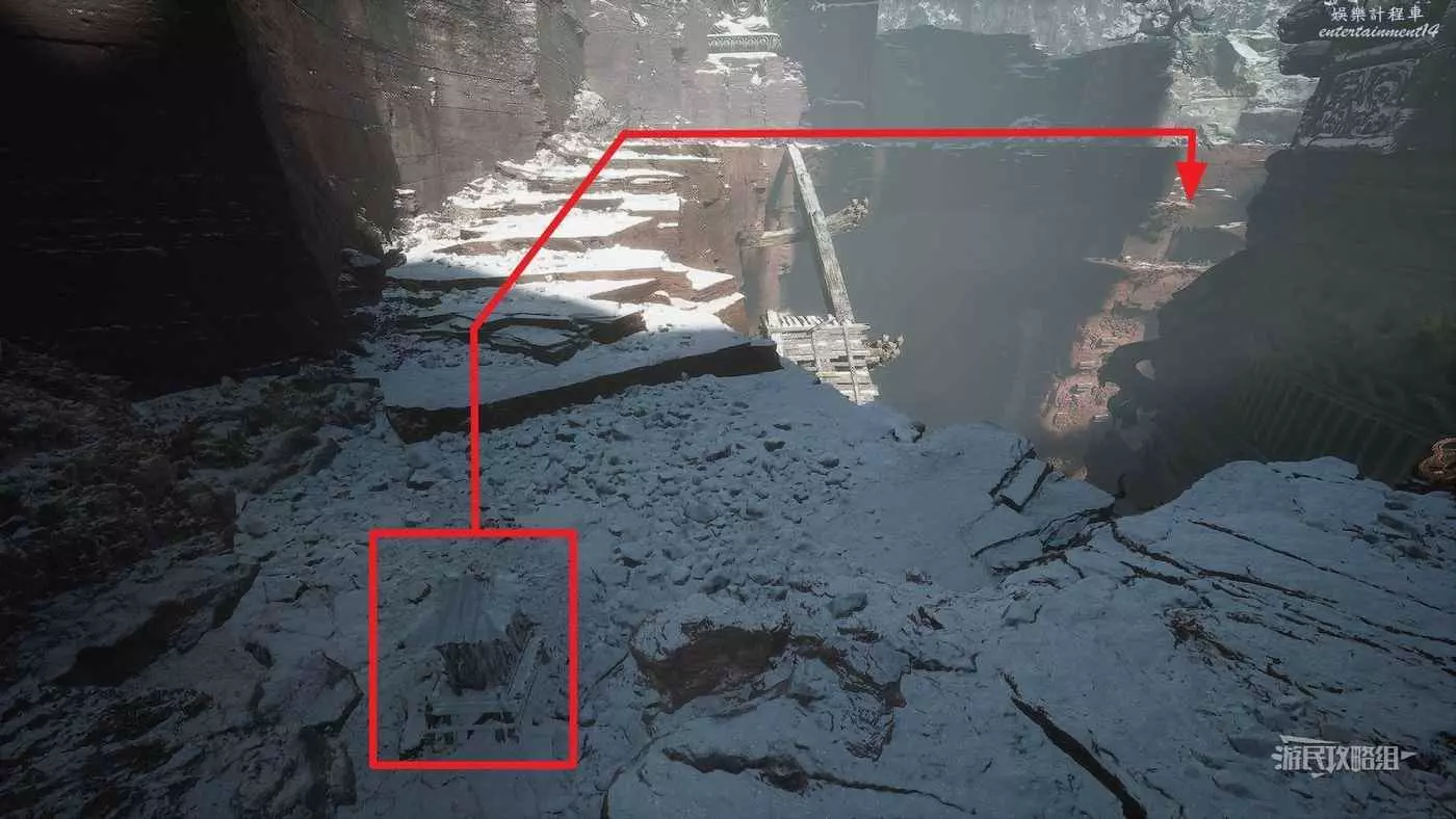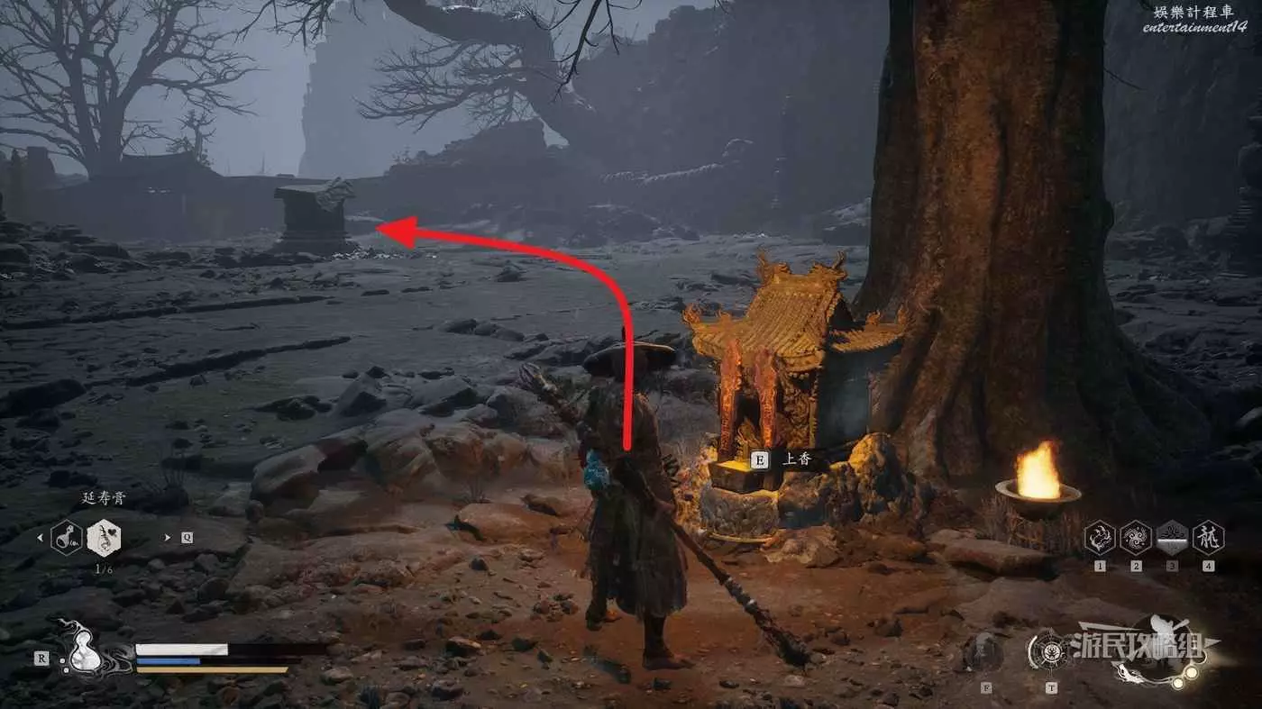 到達第五回【火焰山-火光地-火燎三關】土地廟後,再繼續往前走會遇到一個來回滾的大鐵球,一路躲避大鐵球一路往前走,前方會觸發劇情豬八戒過來擋住鐵球兩人一起墜崖,繼續往前走就會到達土地廟【火光地-隕磚坑】,此時不要往土地廟隕磚坑前走了,往回沿著大鐵球剛才滾的路線,在半路上會看到一條岔路。進入這條岔路。