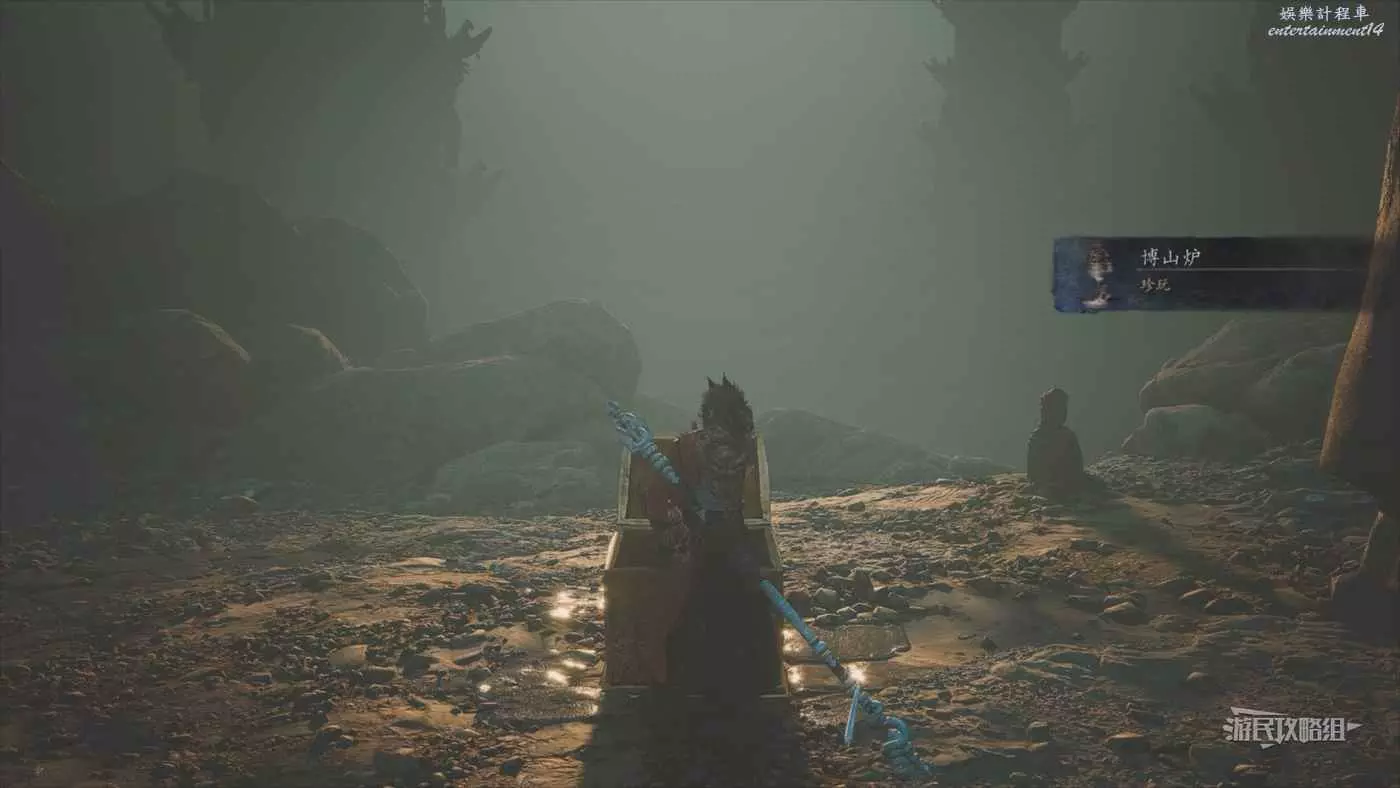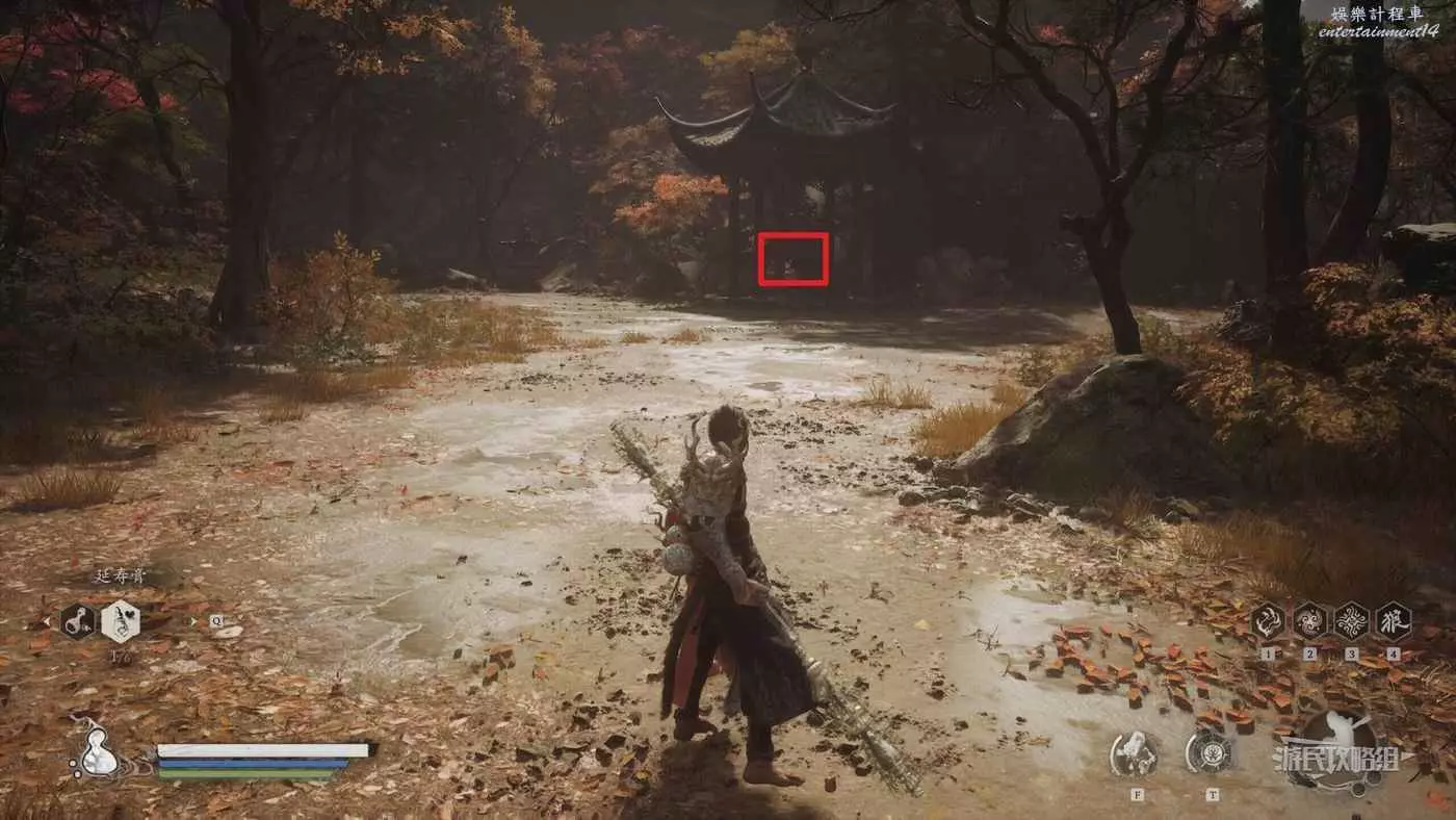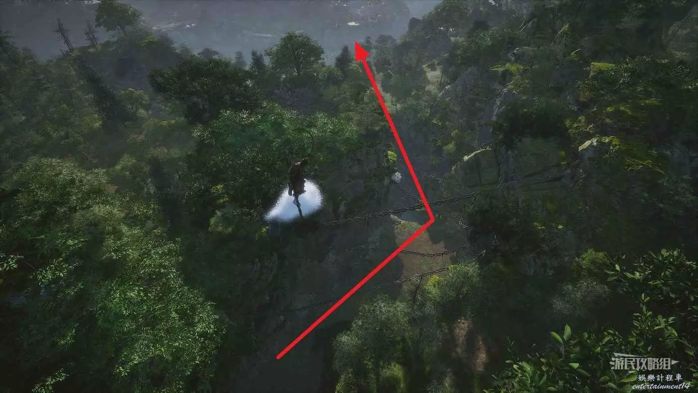從前方草地很稀薄的位置往下跳,下面是一片很大的有積水的空地。跳到積水區域就能觸發與BOSS跳浪蛟的戰鬥。擊敗即可獲得珍玩。