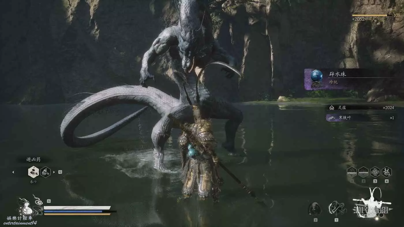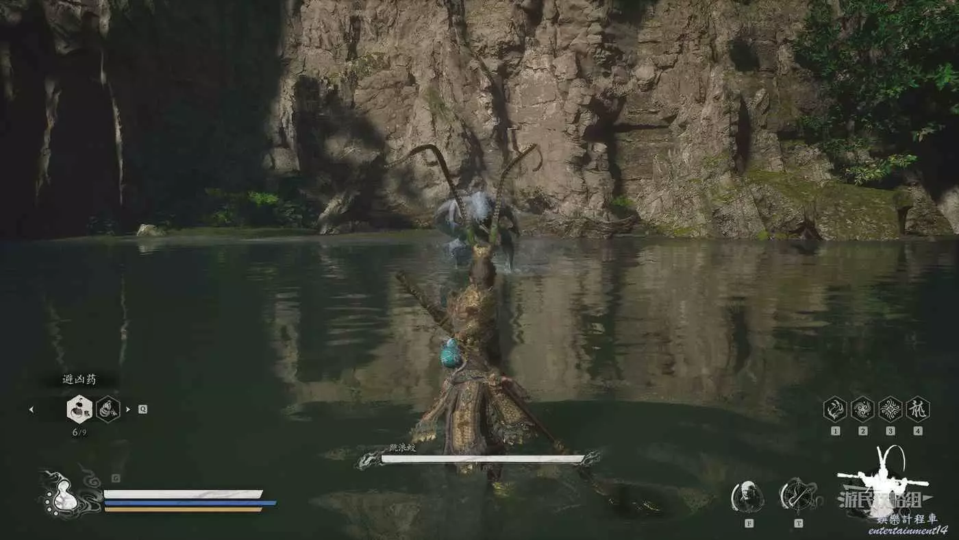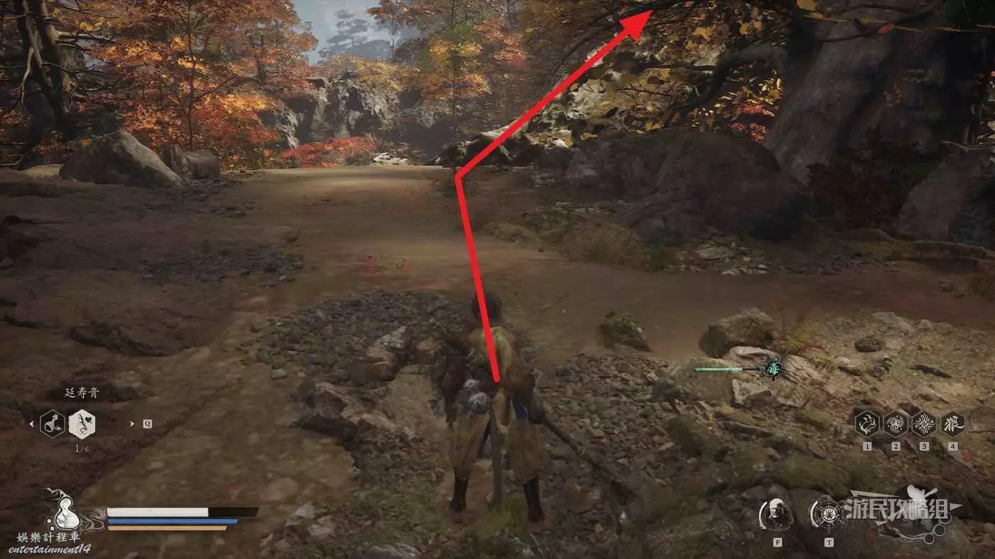 從前方草地很稀薄的位置往下跳,下面是一片很大的有積水的空地。跳到積水區域就能觸發與BOSS跳浪蛟的戰鬥。擊敗即可獲得珍玩。
