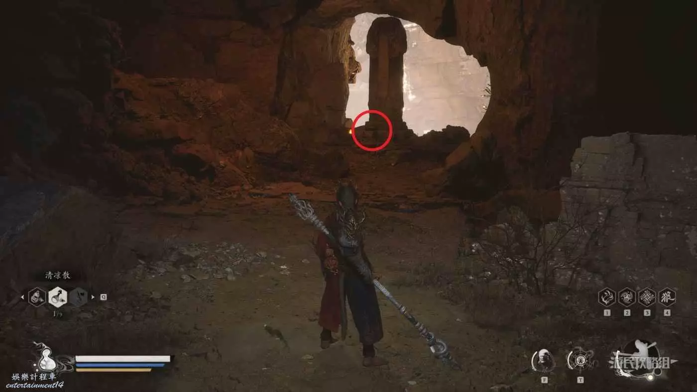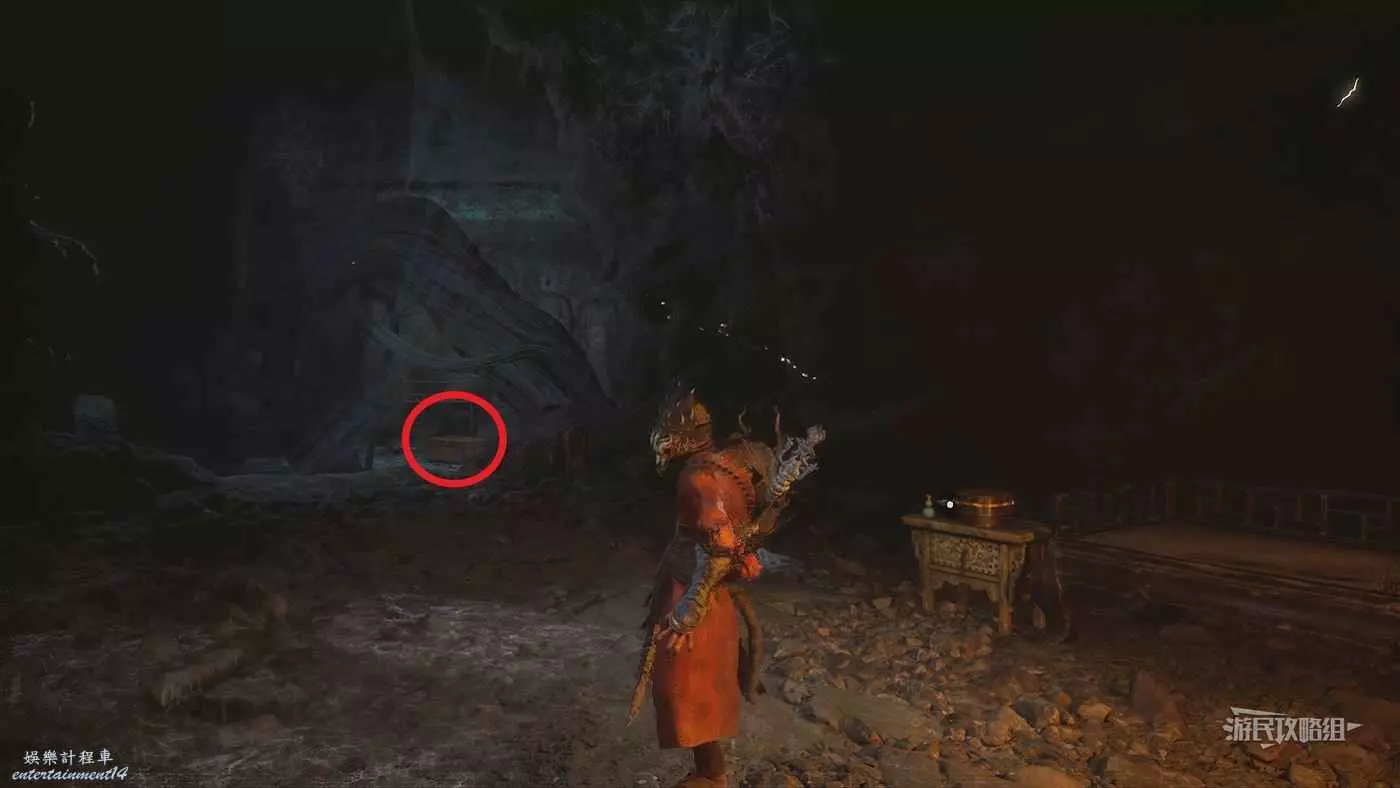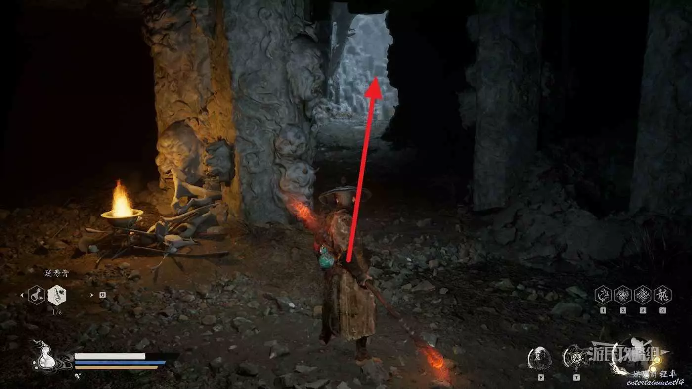 進入山洞後站在火盆旁邊往右轉,可以看到一個洞口。