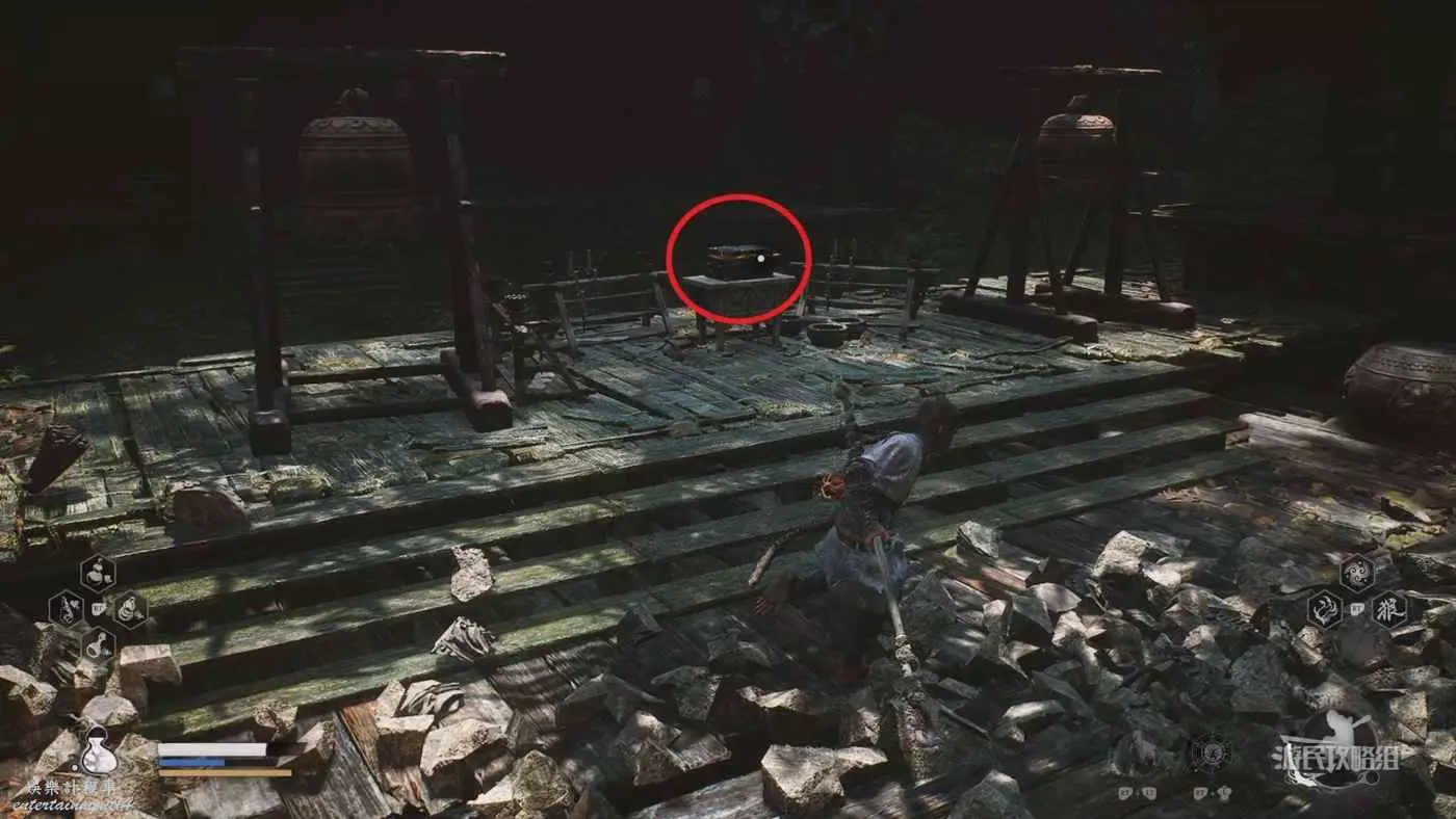 在門後區域中間的大樹正後方可以看到一塊石碑,開啟石碑前檯子上的寶箱即可獲得。