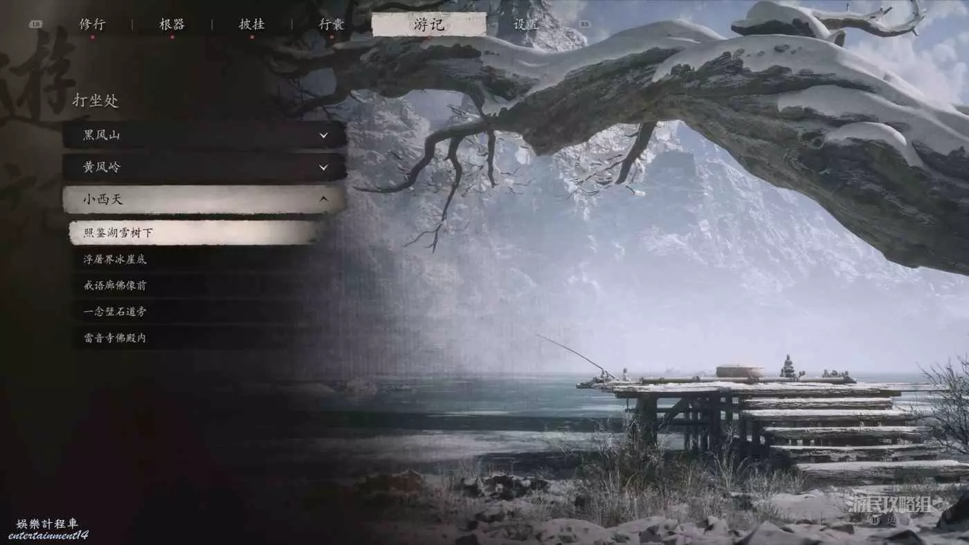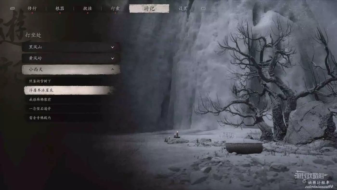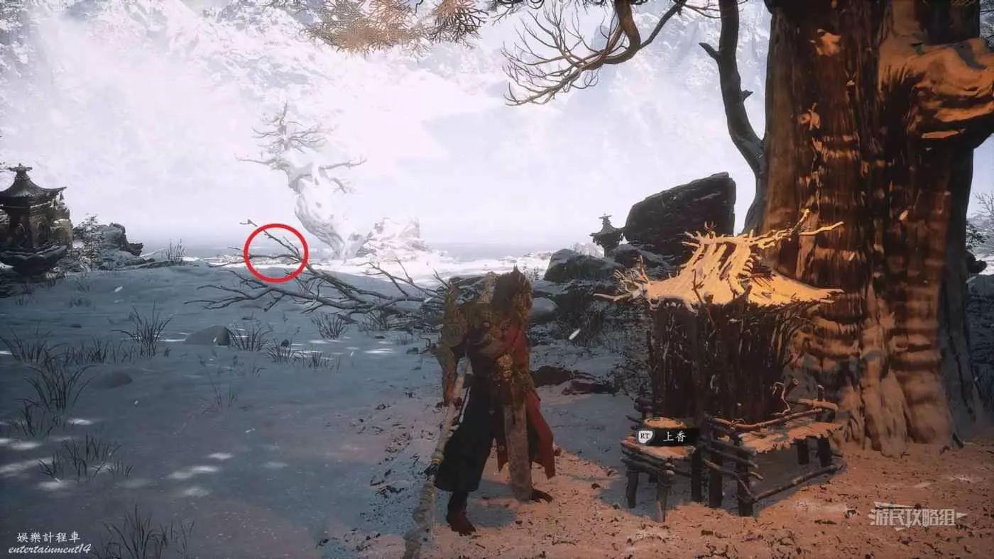 從第三回【雪山徑-照鑒湖】篝火出發,走到巨大的冰湖邊,冰湖邊有一顆被雪覆蓋的樹,蒲團就在樹下。沒有打完第三章時,湖面上會有亭子,打完第三章後亭子會消失。
