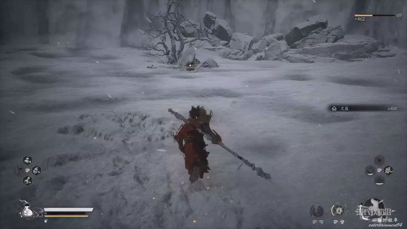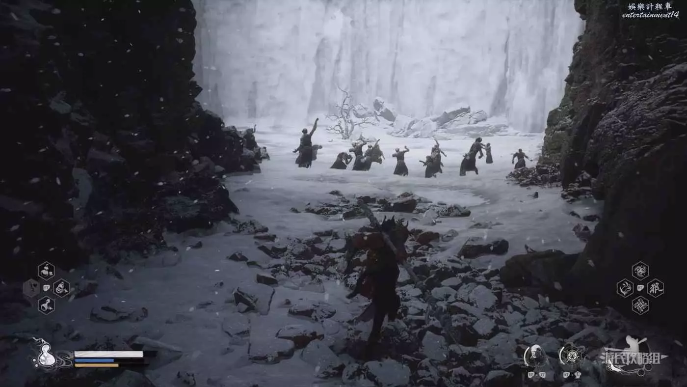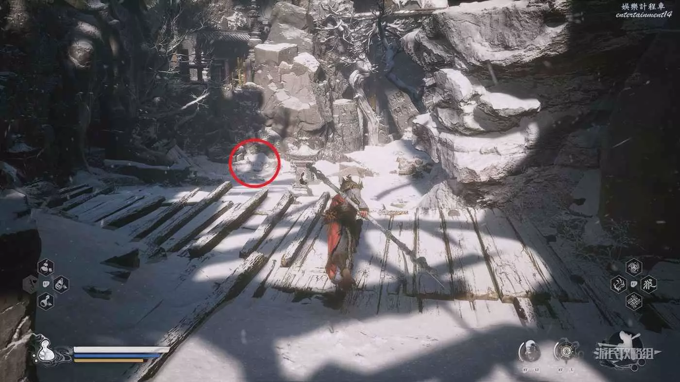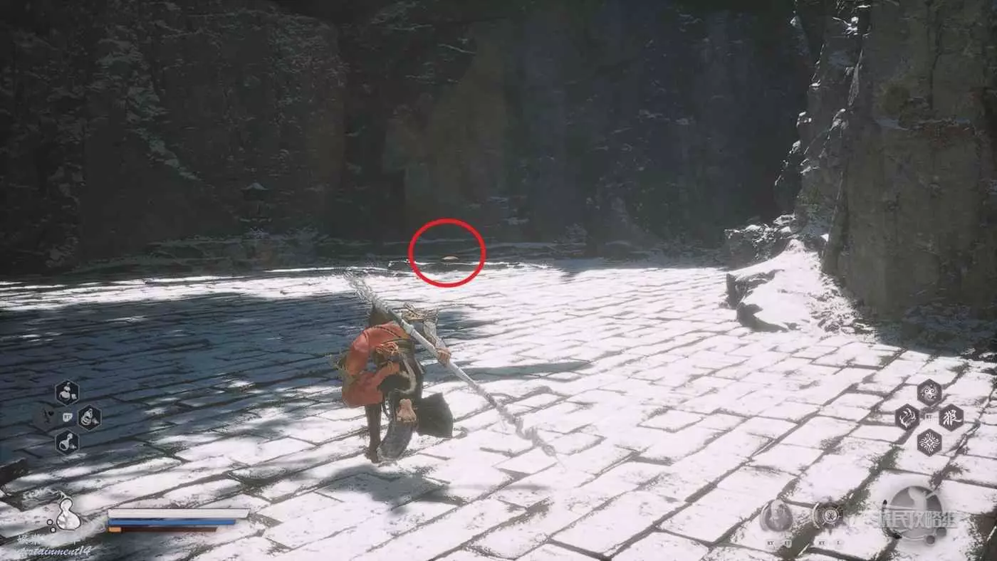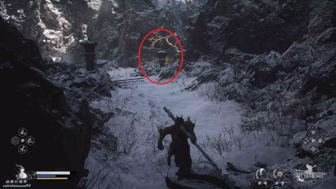 再繼續沿著唯一的路前進,到達前方被岩壁包圍的區域,這裡觸發第二次與不白的BOSS戰,蒲團就在戰鬥區域中靠近岩壁的地方。