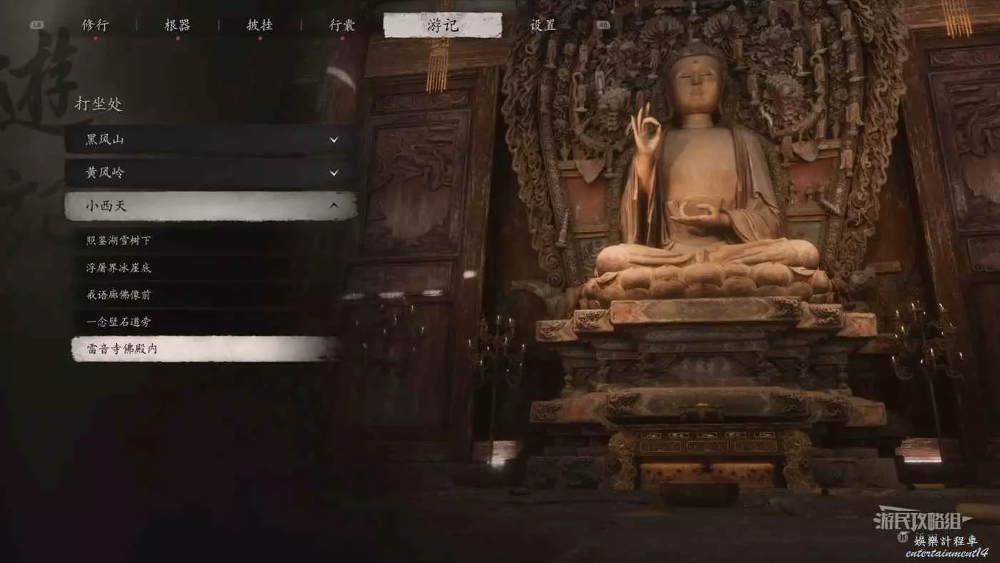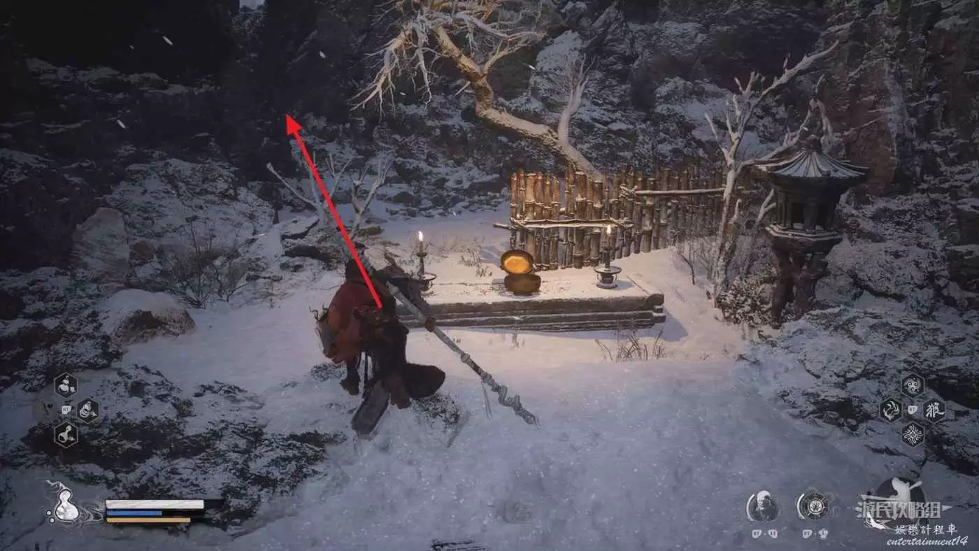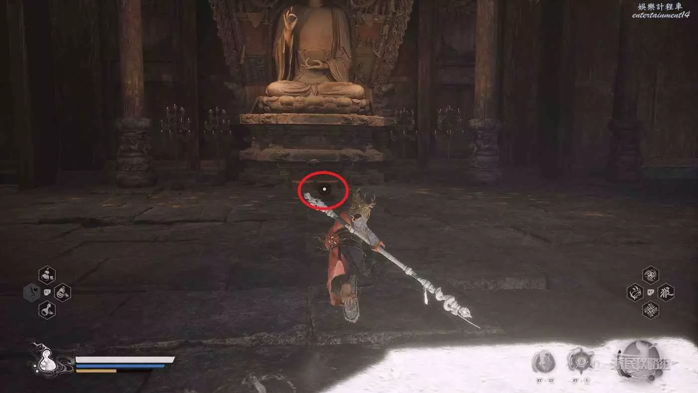 從第三回【小雷音寺-大殿】篝火出發,背對大殿,往樓梯下方左側的偏殿走(參考下方圖片箭頭和紅圈)。
