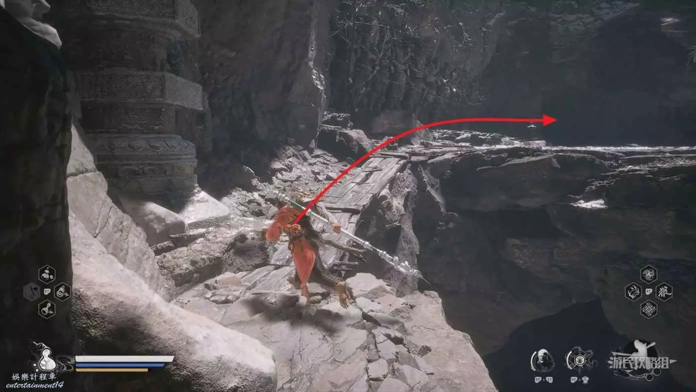 從第三回【極樂谷-一念壁】篝火出發,沿著山壁和木板到達前方平台,平台上會遇到BOSS不白。在它旁邊有個山洞,進入山洞。