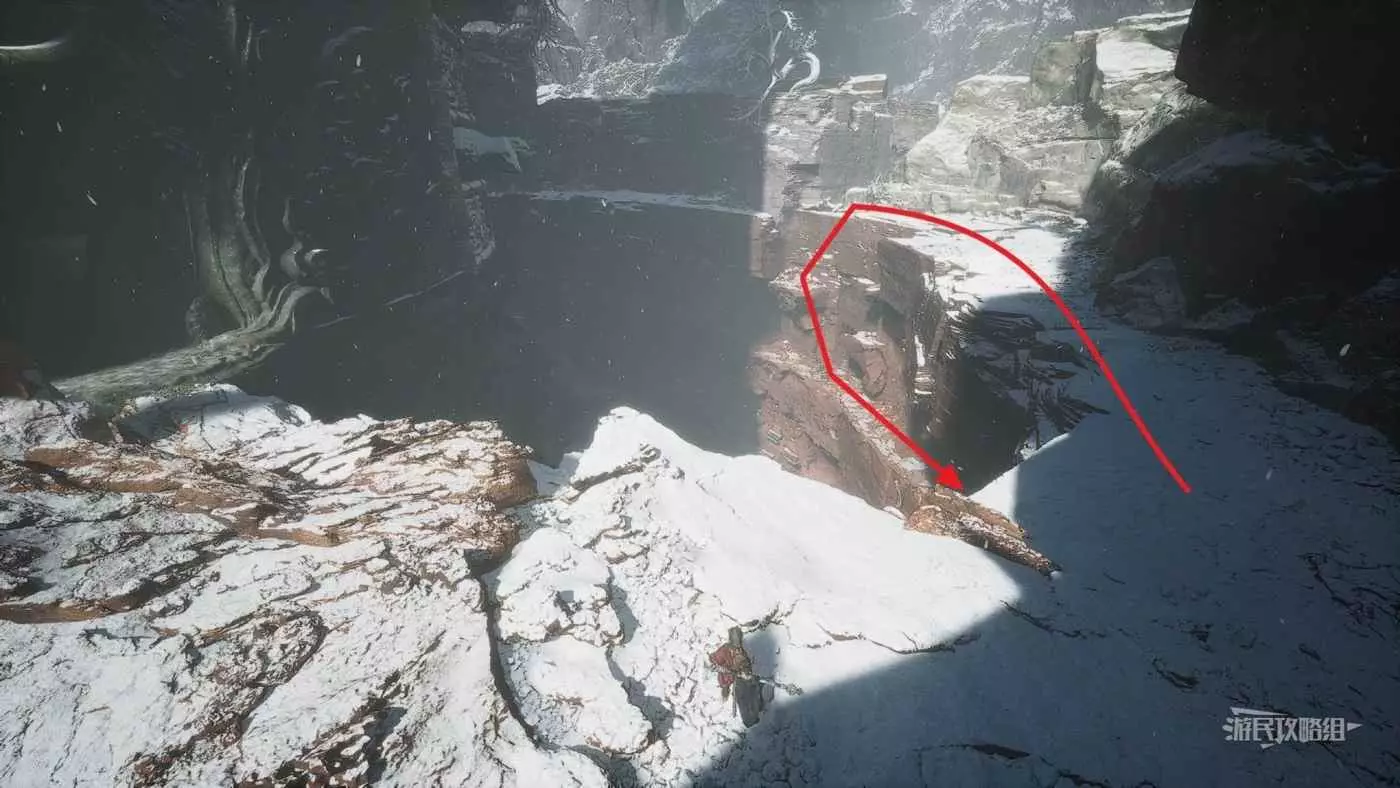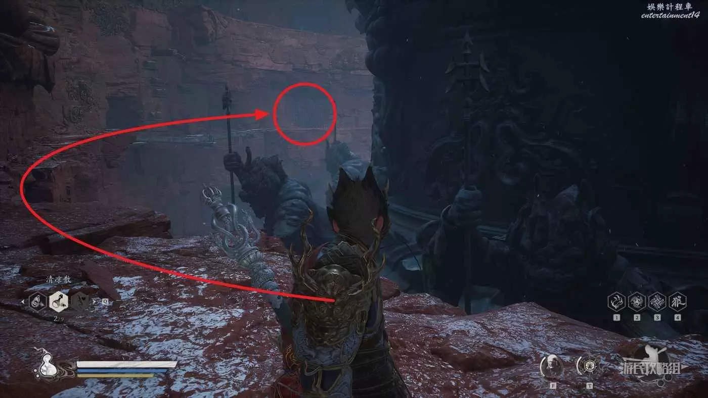 從第三回【小西天-浮屠界-經筒外】土地廟往BOSS【魔將·妙音】所在位置的橋走,到懸崖邊右轉可以看到前方岩壁上凸出了一些大石頭,這些石頭是可以踩著往下跳的。沿著石頭往下跳,按照下圖箭頭方向前進。