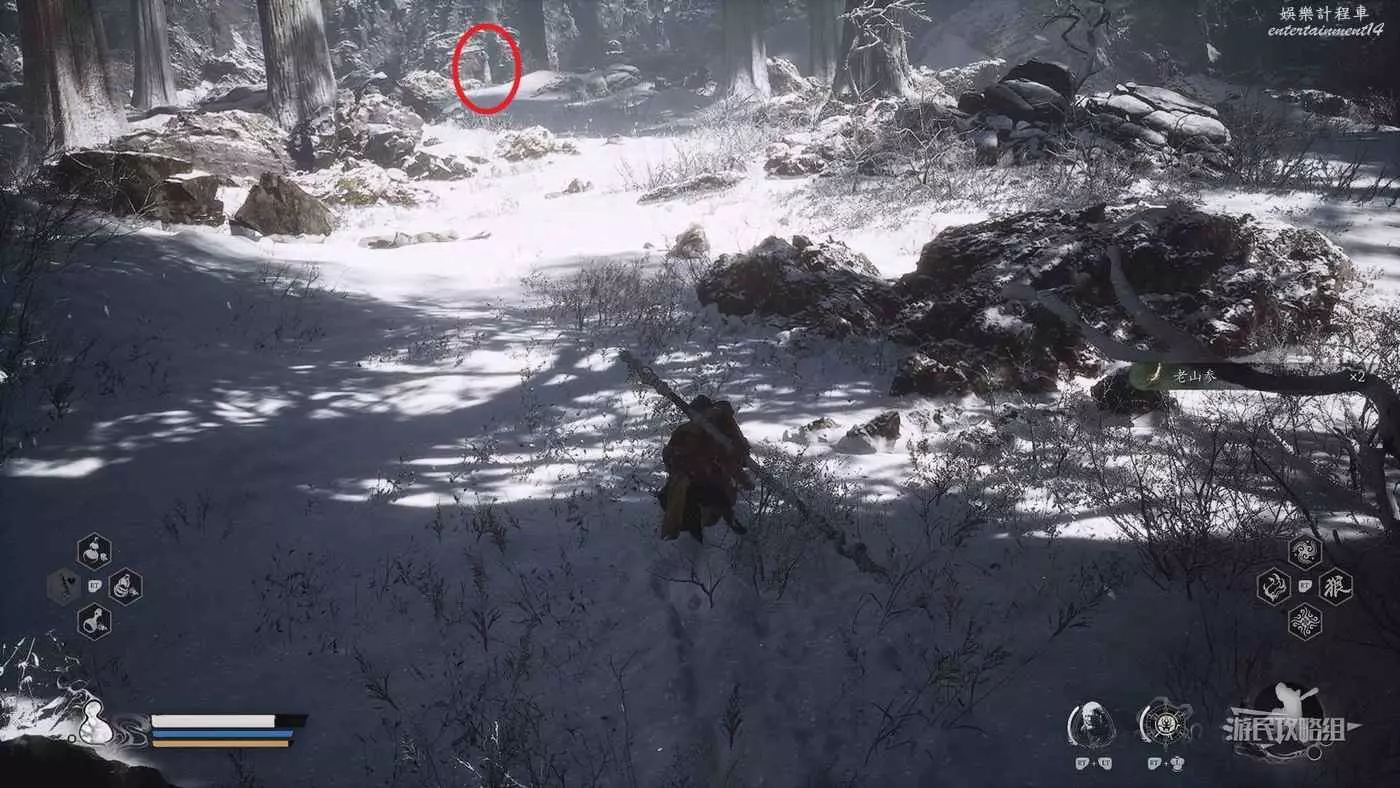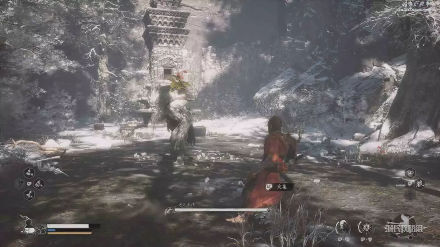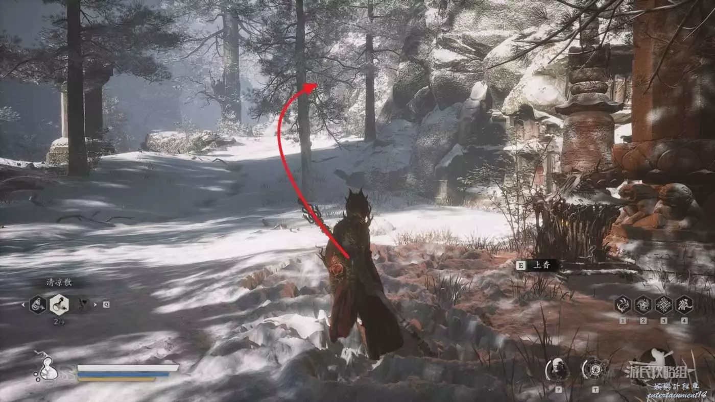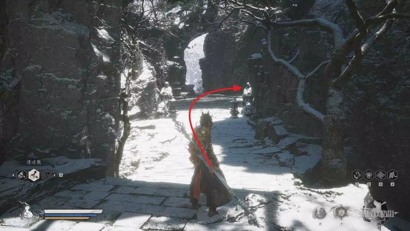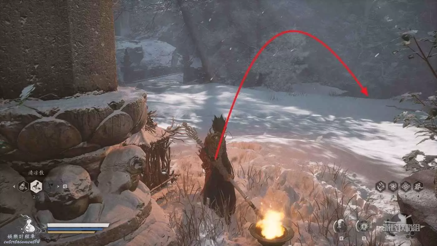 第一次戰鬥結束後,需要進入山洞繼續沿著唯一路線往前走,走到室外落雪的石板路後,繼續往前就是一片開闊區域,在這裡第二次擊敗不白即可獲得精魄。旁邊還有一個蒲團。