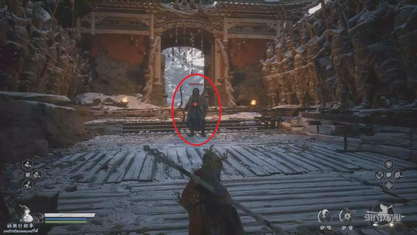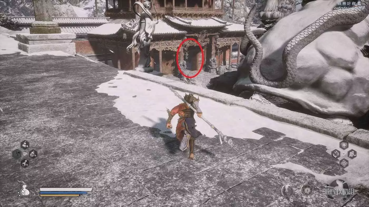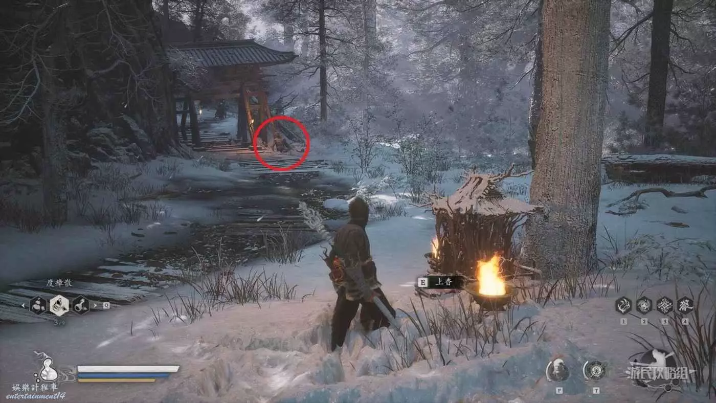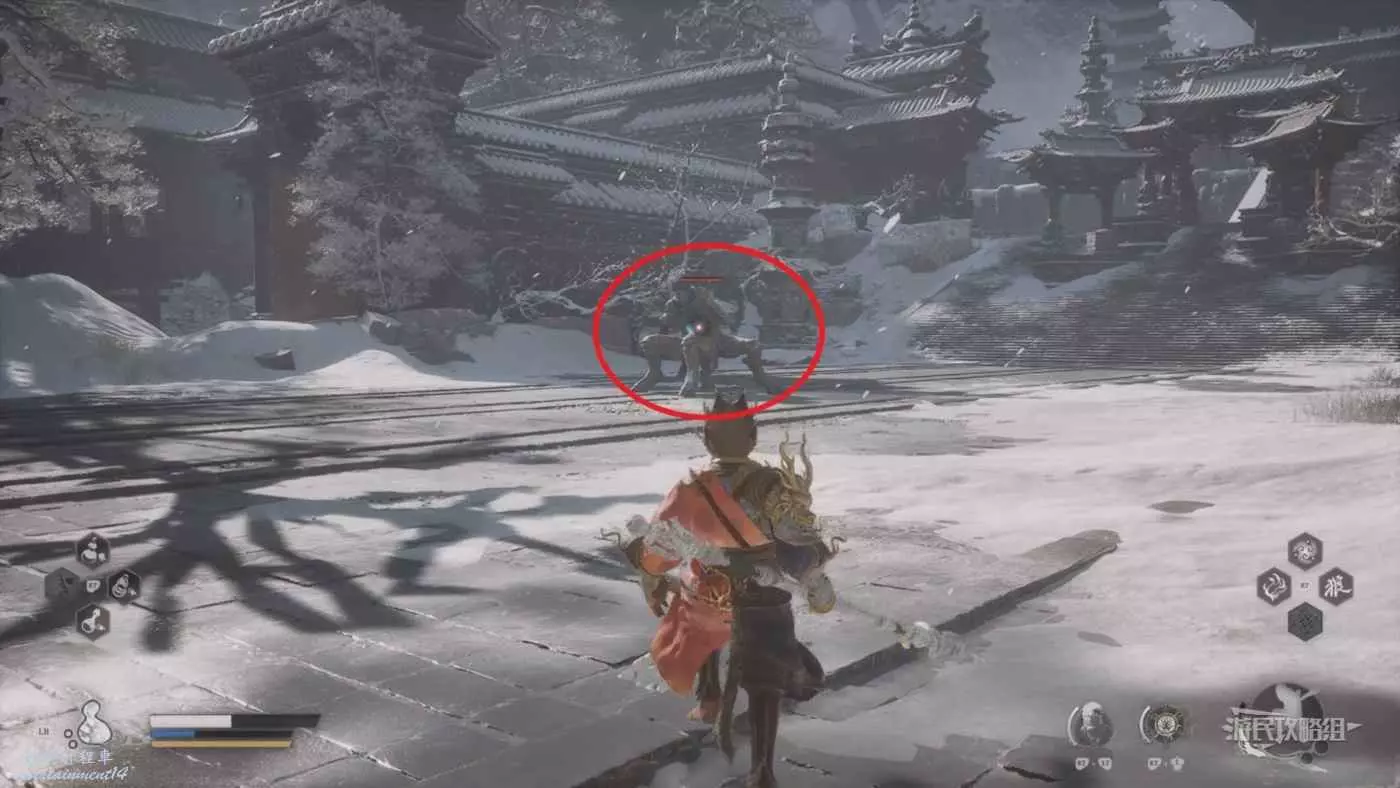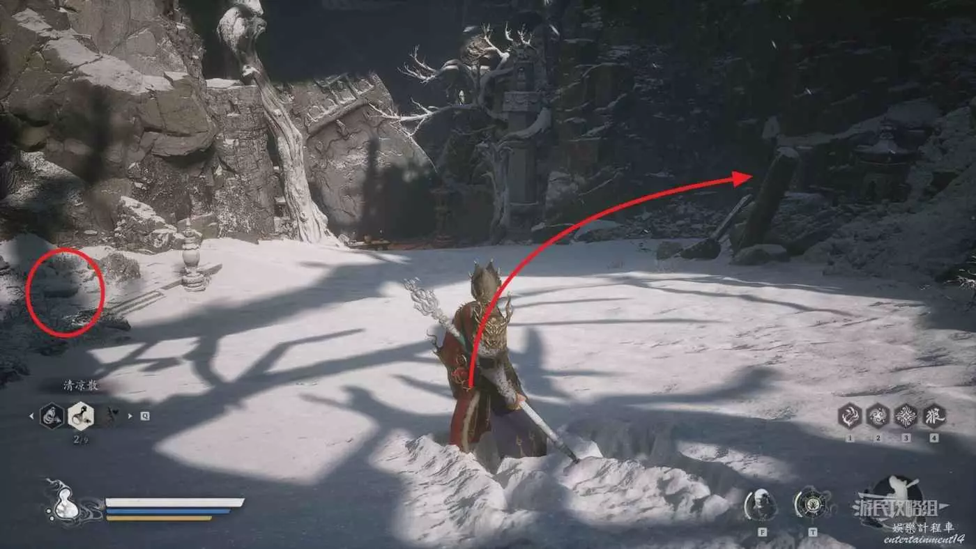 第一次戰鬥結束後,需要進入山洞繼續沿著唯一路線往前走,走到室外落雪的石板路後,繼續往前就是一片開闊區域,在這裡第二次擊敗不白即可獲得精魄。旁邊還有一個蒲團。