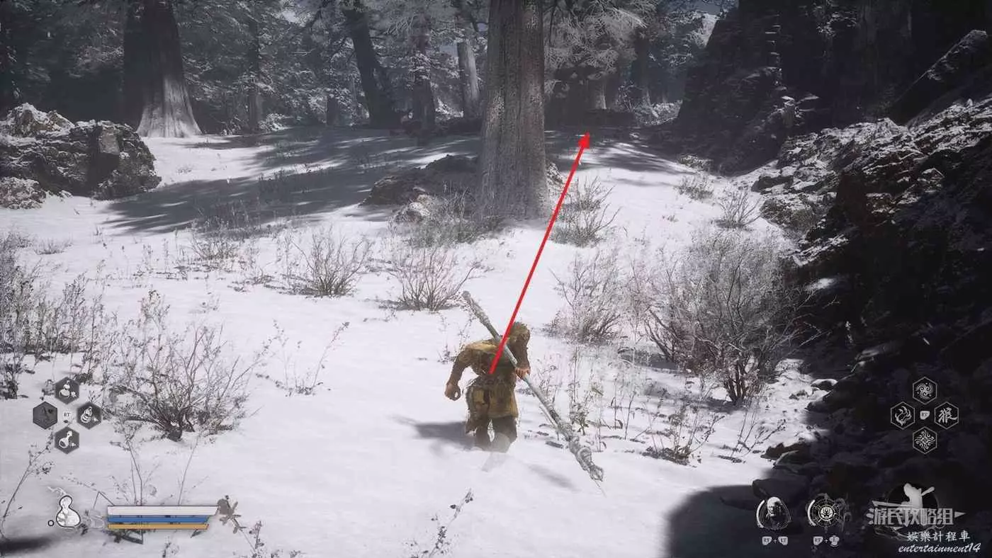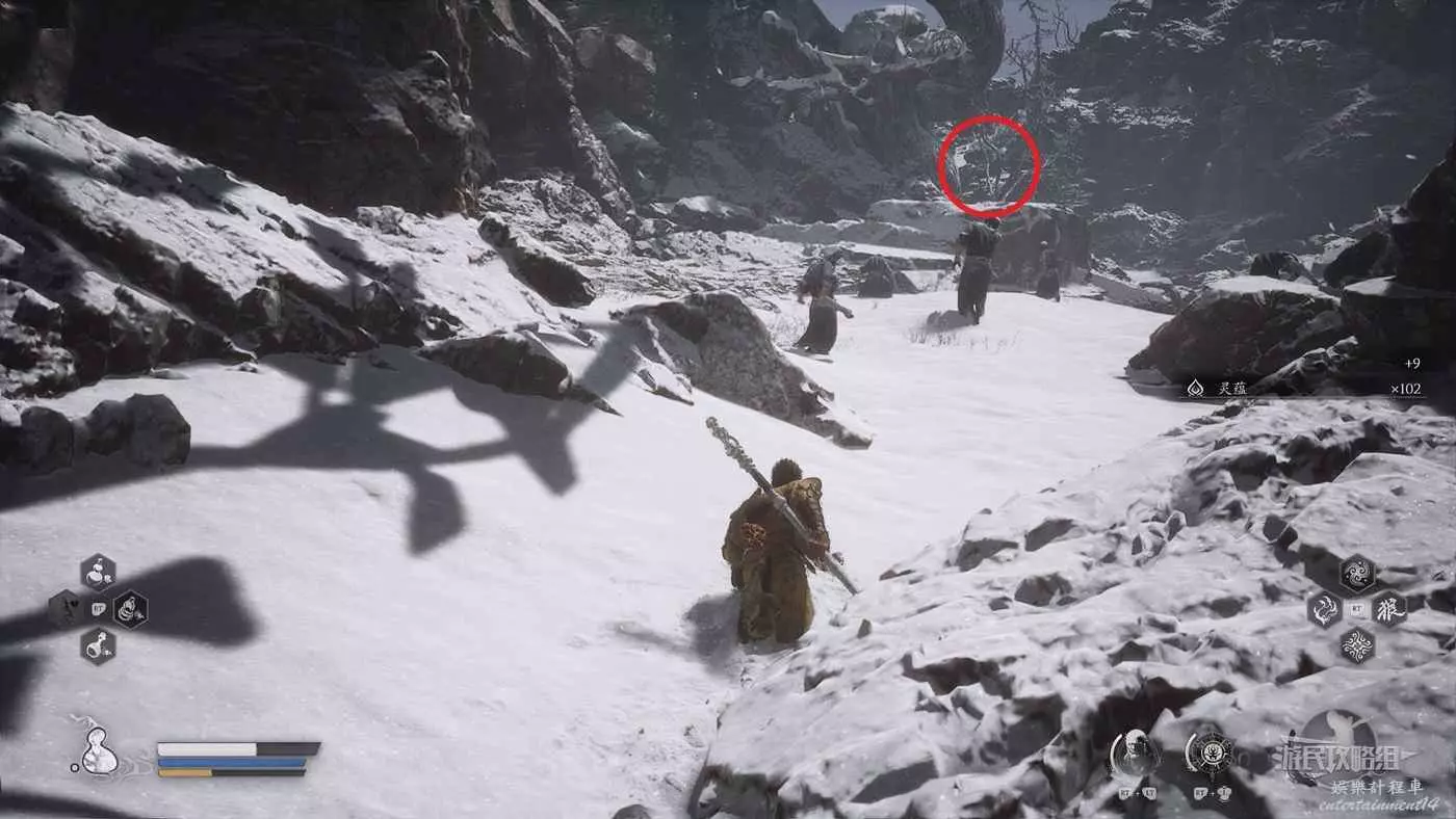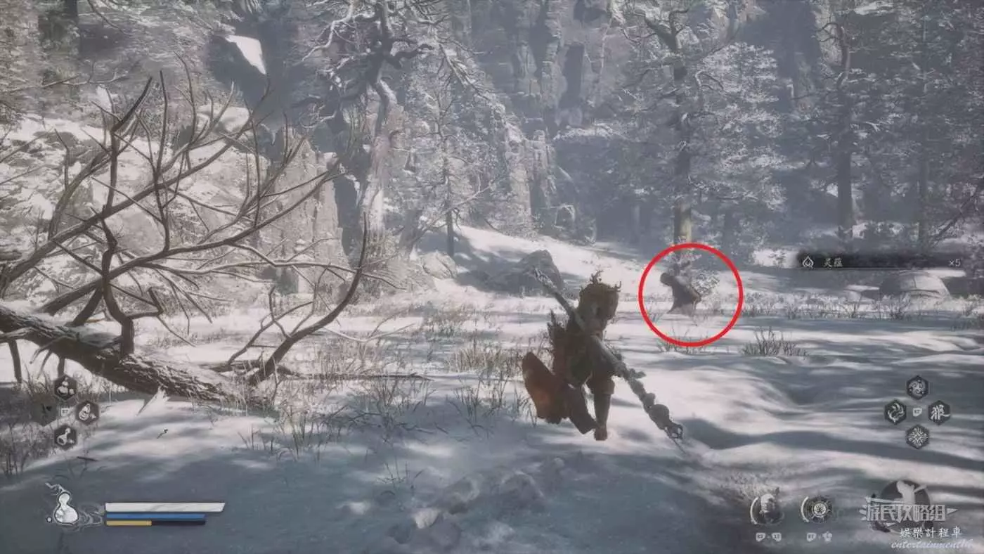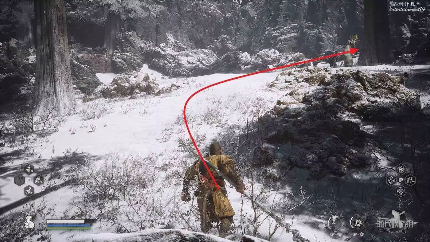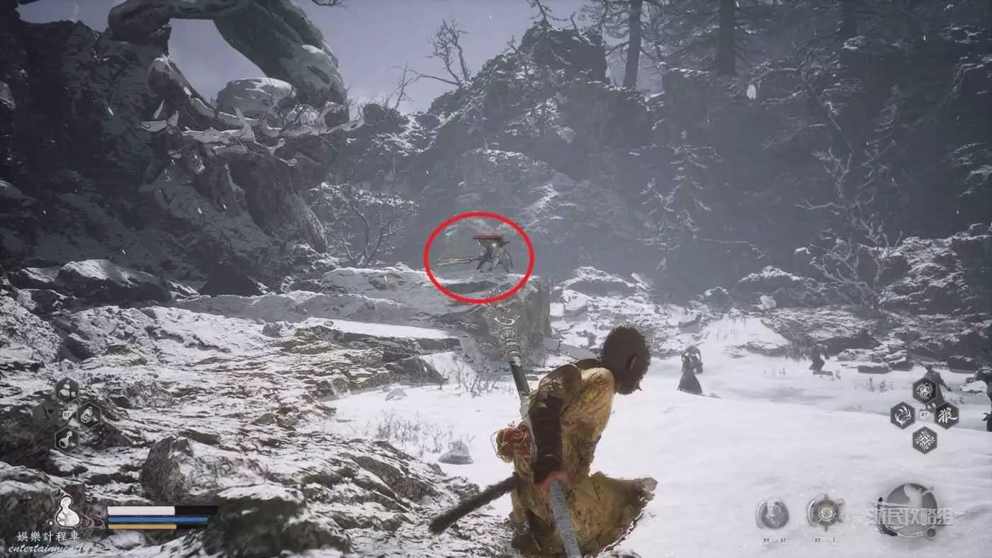 第一次戰鬥結束後,需要進入山洞繼續沿著唯一路線往前走,走到室外落雪的石板路後,繼續往前就是一片開闊區域,在這裡第二次擊敗不白即可獲得精魄。旁邊還有一個蒲團。