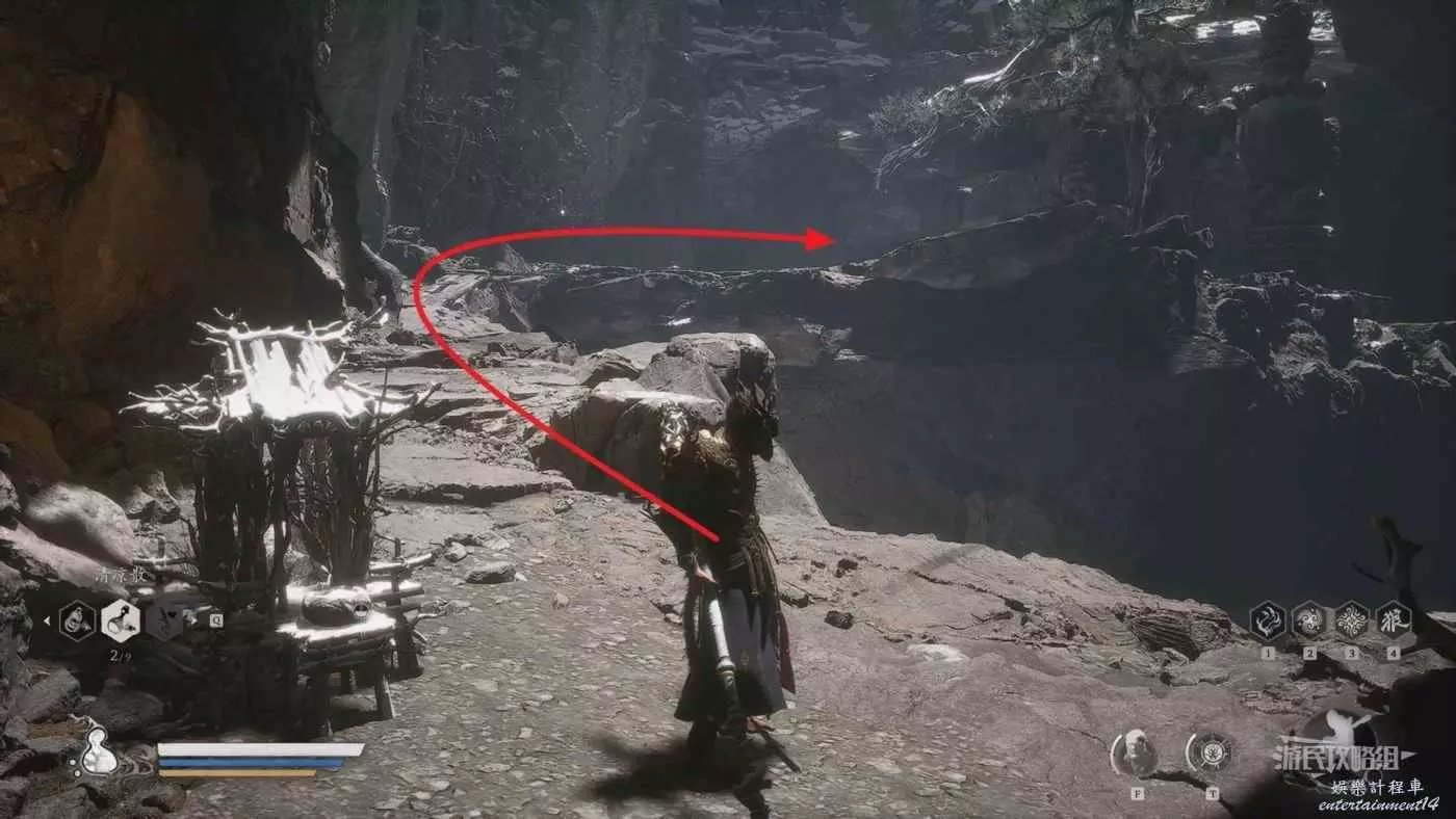 從第三回【小西天-極樂谷-無憂澗】土地廟右側的懸崖往下跳,參考下方箭頭。