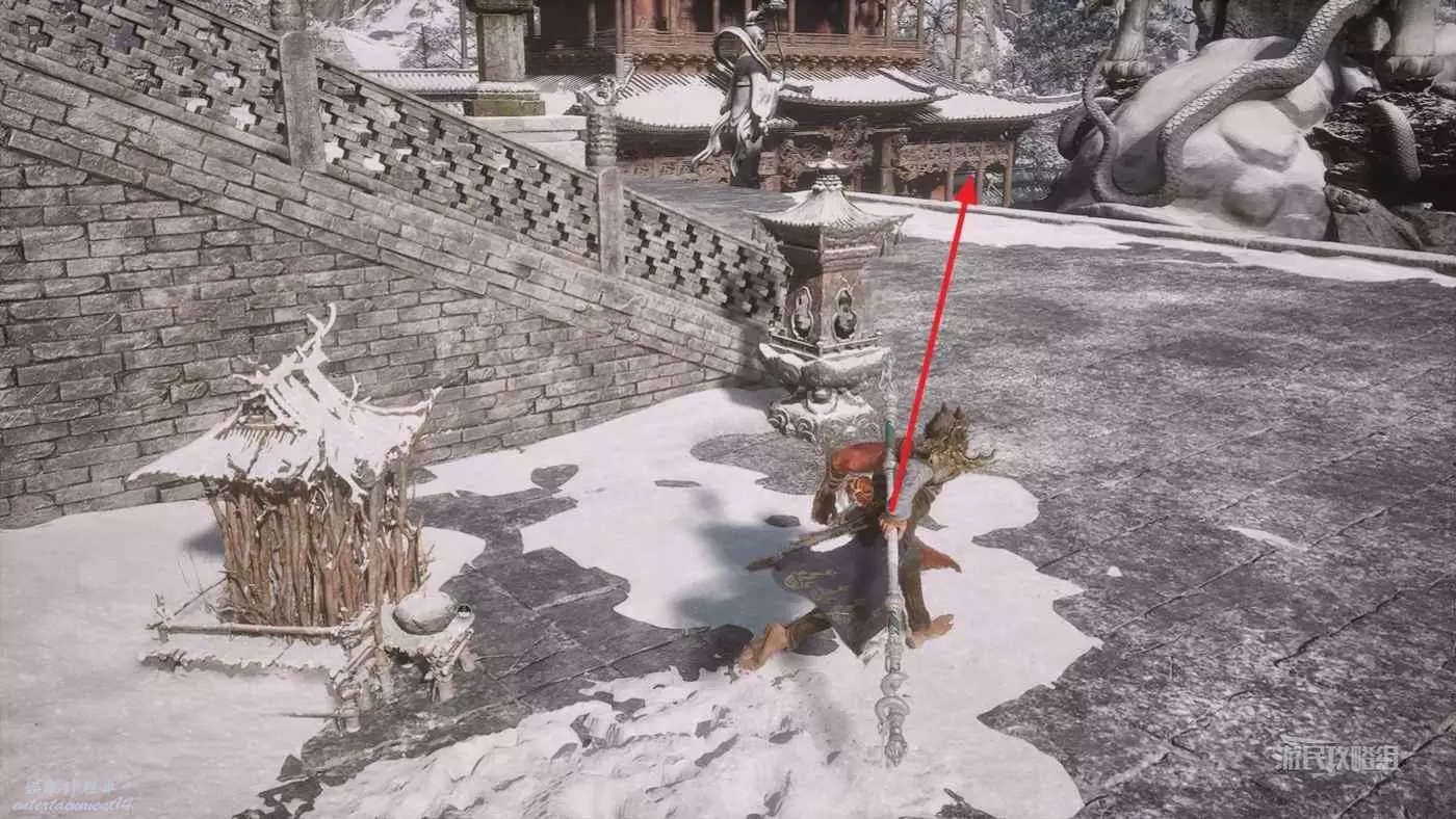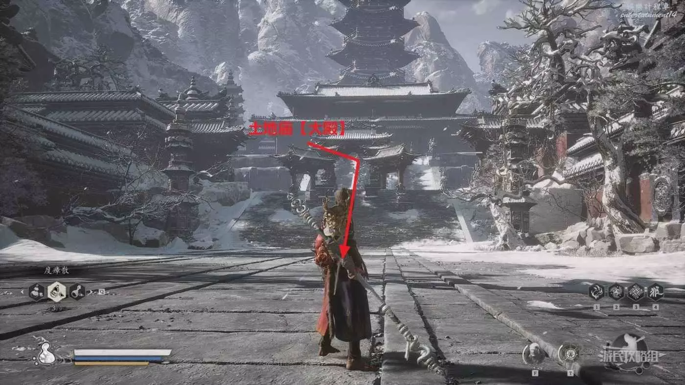 由於小雷音寺中只有兩個土地廟,所以我們這裡不以土地廟為起點,首先來到小雷音寺大殿前的廣場(樓梯下方),下圖箭頭是從土地廟【大殿】往下走。